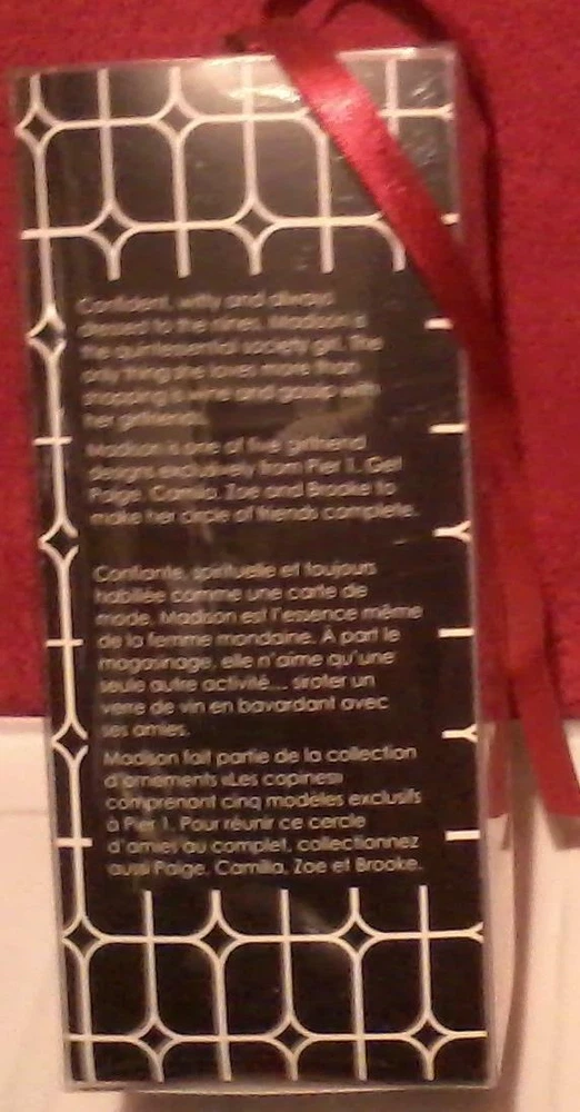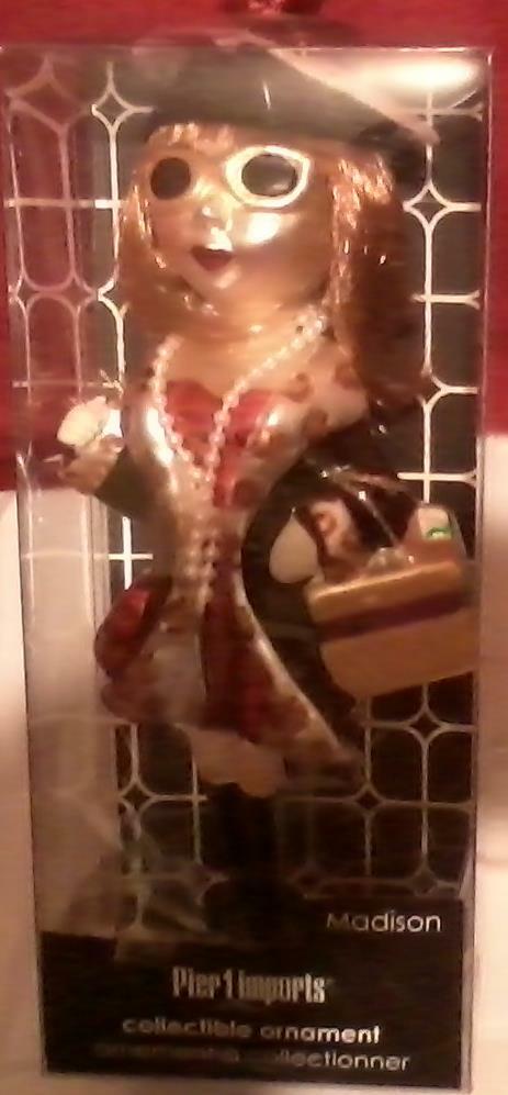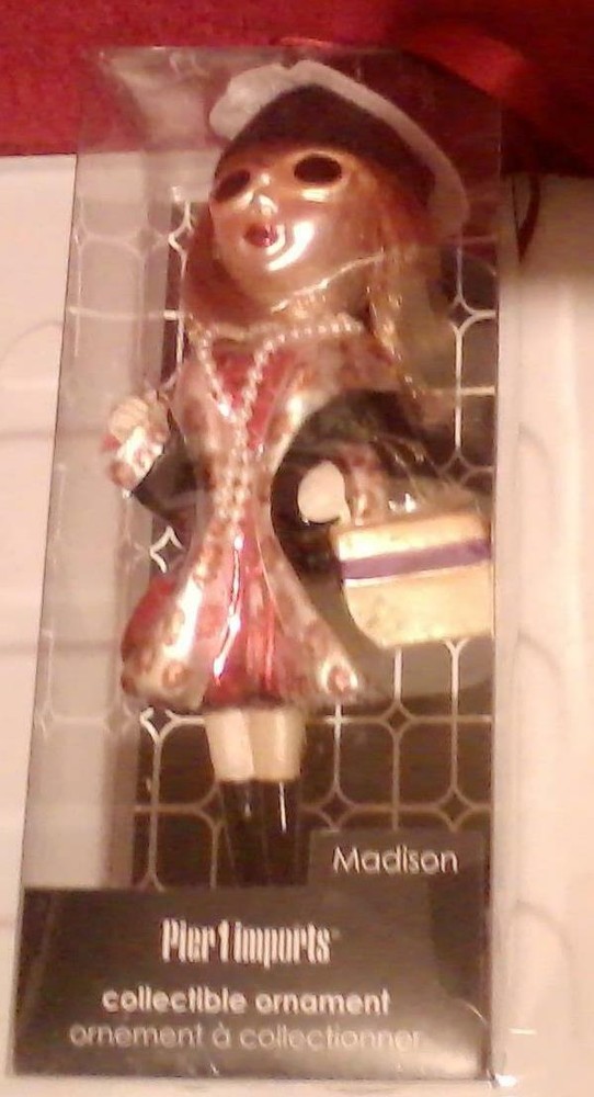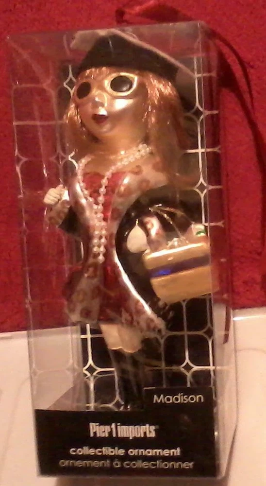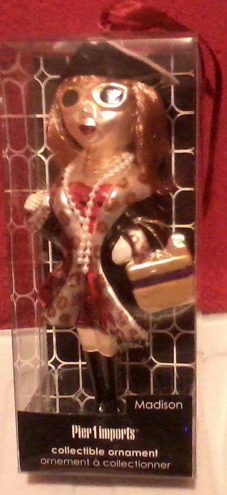 Description: Madison, one of the 5 popular girlfriend glass ornaments from Pier One (1) Per the package, confident and witty and always dressed to the nines, Madison is the quintessential society girl. The only thing she loves more than shopping is wine and gossip with her girlfriends. The ornament measures approximately 7 ½ inches long x 3 ¼ inches wide. Please read all description and terms of condition before you make your final decision to make your purchase. Camera flash may distort true colors. We accept PayPal No International Shipping at this time. Please feel free to ask questions regarding this item. WE STRIVE FOR HAPPY CUSTOMERS! WE APPRECIATE YOUR BUSINESS! THANK YOU FOR SHOPPING WITH US.