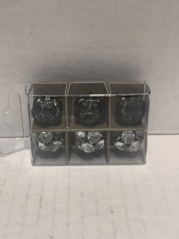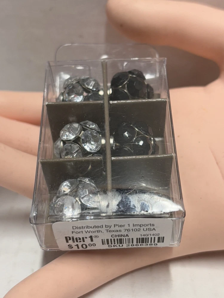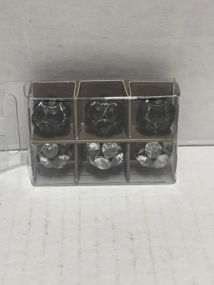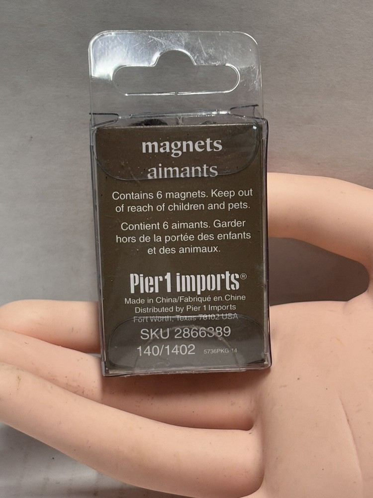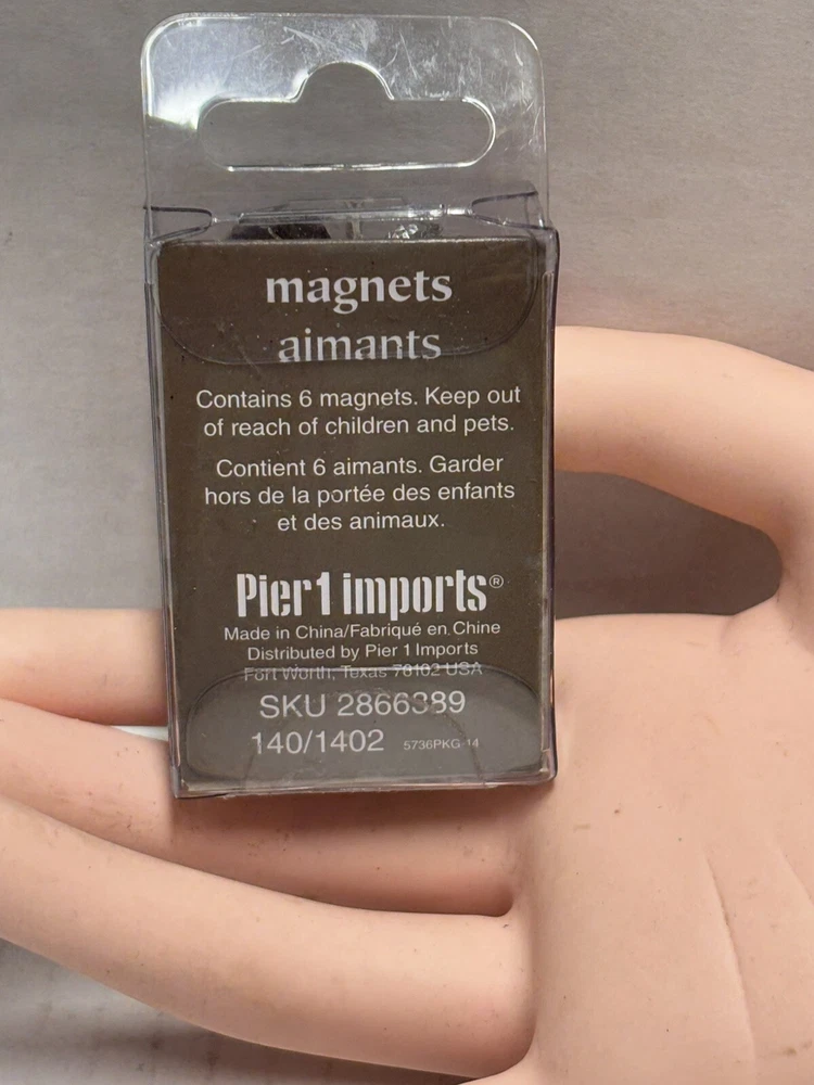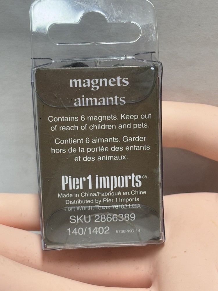 Pier 1 Imports Magnets Set of 6 features black and silver tone geometric designs. Handmade and painted in China, this set includes small magnets with a colorblock pattern. The set is original and designed for all occasions.