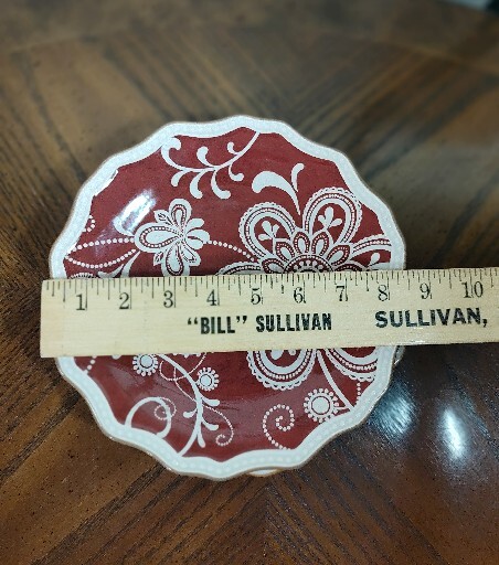 Pier 1 Imports Maribeth 2 Burgundy Red 2 Yellow Ironstone Scalloped Salad 4 Set 8.5". The color mix takes on a really nice Boho vibe. It appears these dishes have never been used. Excellent Condition....