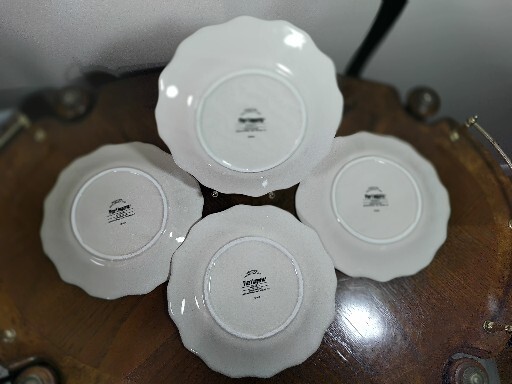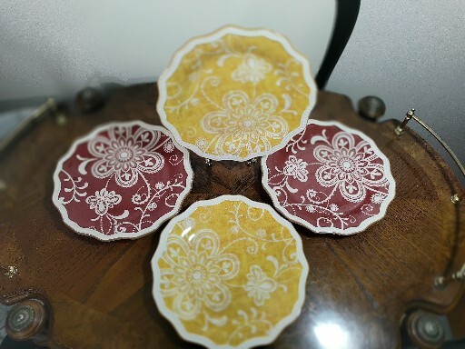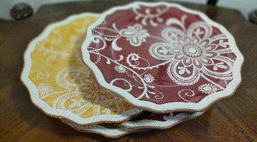 Pier 1 Imports Maribeth 2 Burgundy Red 2 Yellow Ironstone Scalloped Salad 4 Set 8.5". The color mix takes on a really nice Boho vibe. It appears these dishes have never been used. Excellent Condition. (D1)