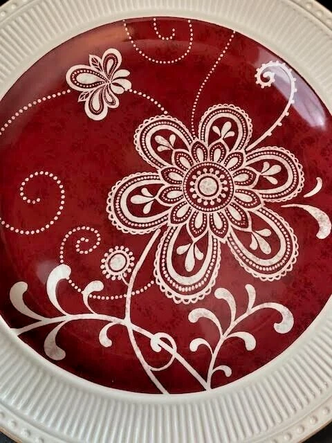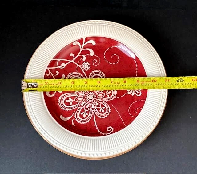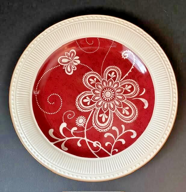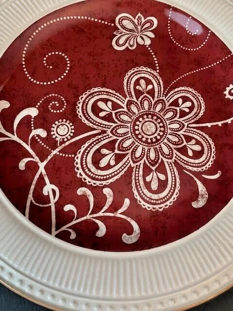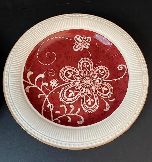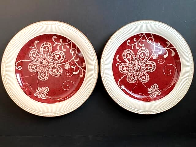 Pier 1 Imports Maribeth 2 Dinner Plates Red Cream Flowers Ribbed Dots Rim 11 inches Diameter EUC No Chips Cracks Or Crazing Shipped USPS Priority Mail