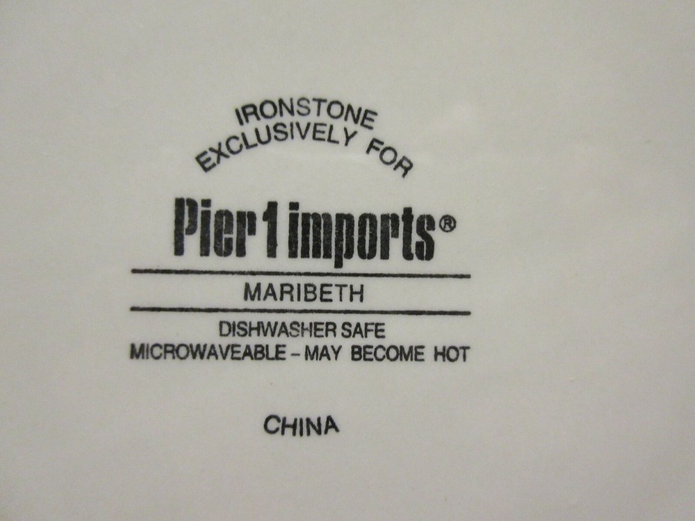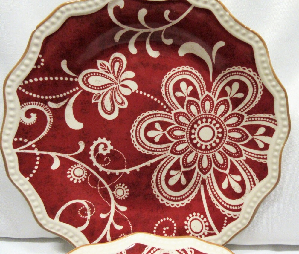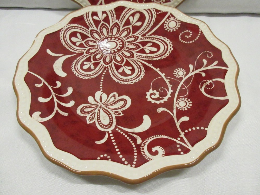 This is a great set of 2 salad plates by Pier 1. Manufactured from 2009-2016 this pattern is called Maribeth and features white floral on a red background with white embossed dots on the rim. They are dishwasher and microwave safe. These plates are 8 1/2" and are in good condition. 10/23/21 O-O