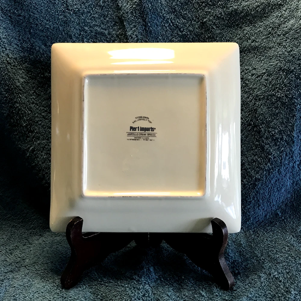 Pier 1 Imports Martillo Creme brûlée square Salad/luncheon Plates 7.3/4". New with no sticker or tags. Buy 1 plate for $ 12.00 2 plates and get 5% off 3 plates and get 8% off 4 plates or more and get 10% off. Shipping for 1 plate is $10.50 and $ 2.50 for each additional plate.