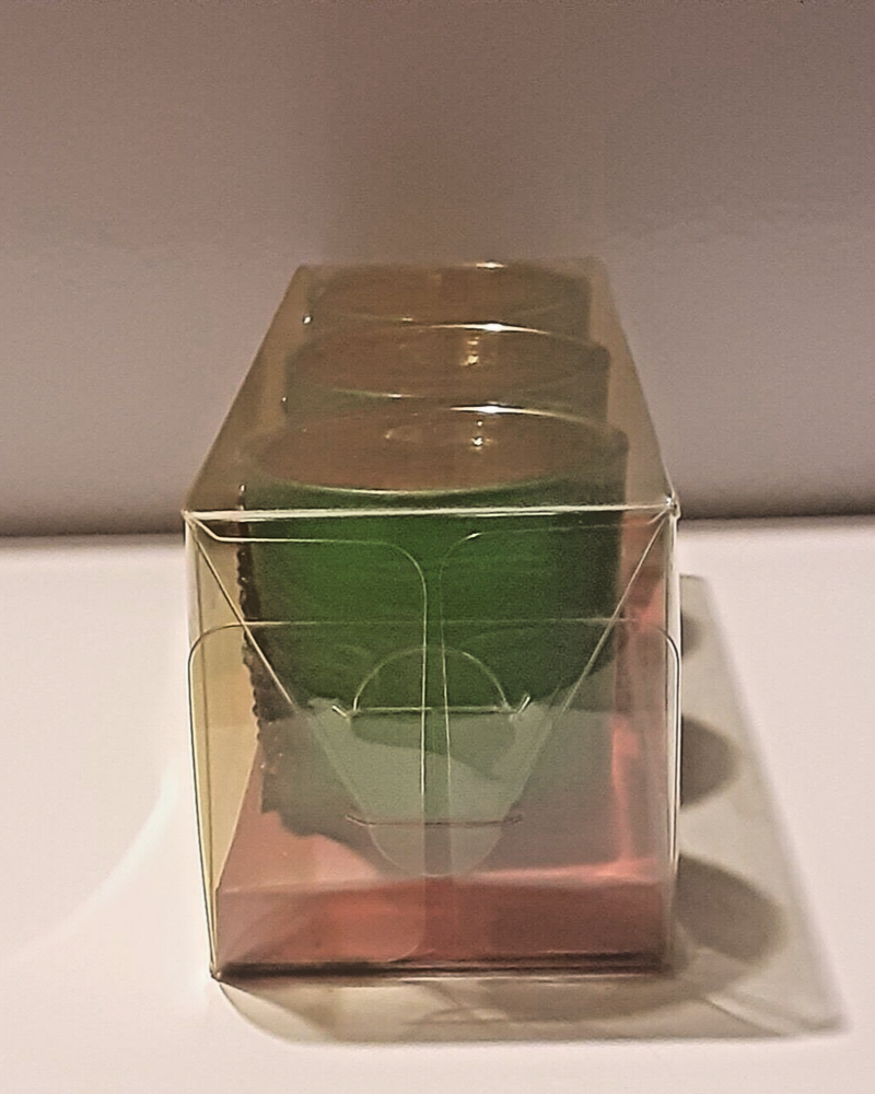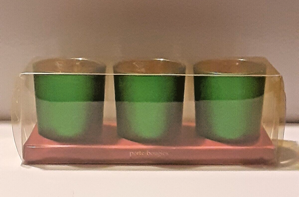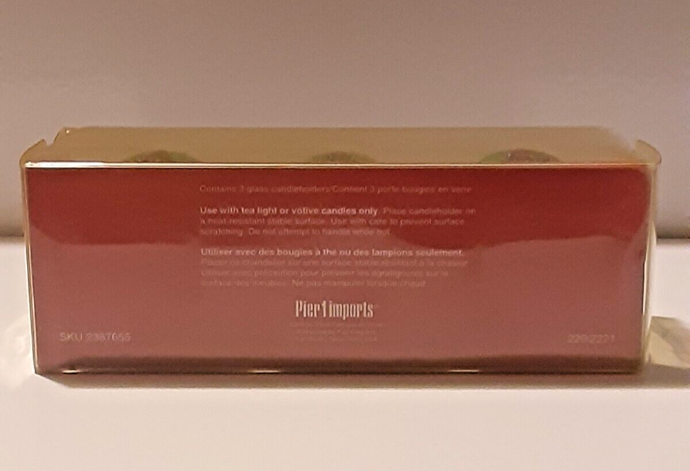 Elevate your holiday decor with this Pier 1 Imports Mercury Glass Beaded Christmas Tree Candle Holder set. This set includes three green candle holders with glass bead decor in the design of a Christmas tree. New old stock. Please note: candles have never been burned, but are a little melted with age.