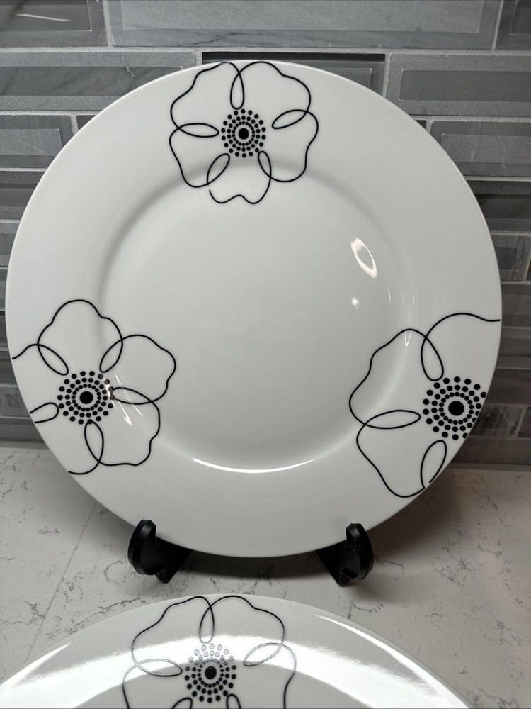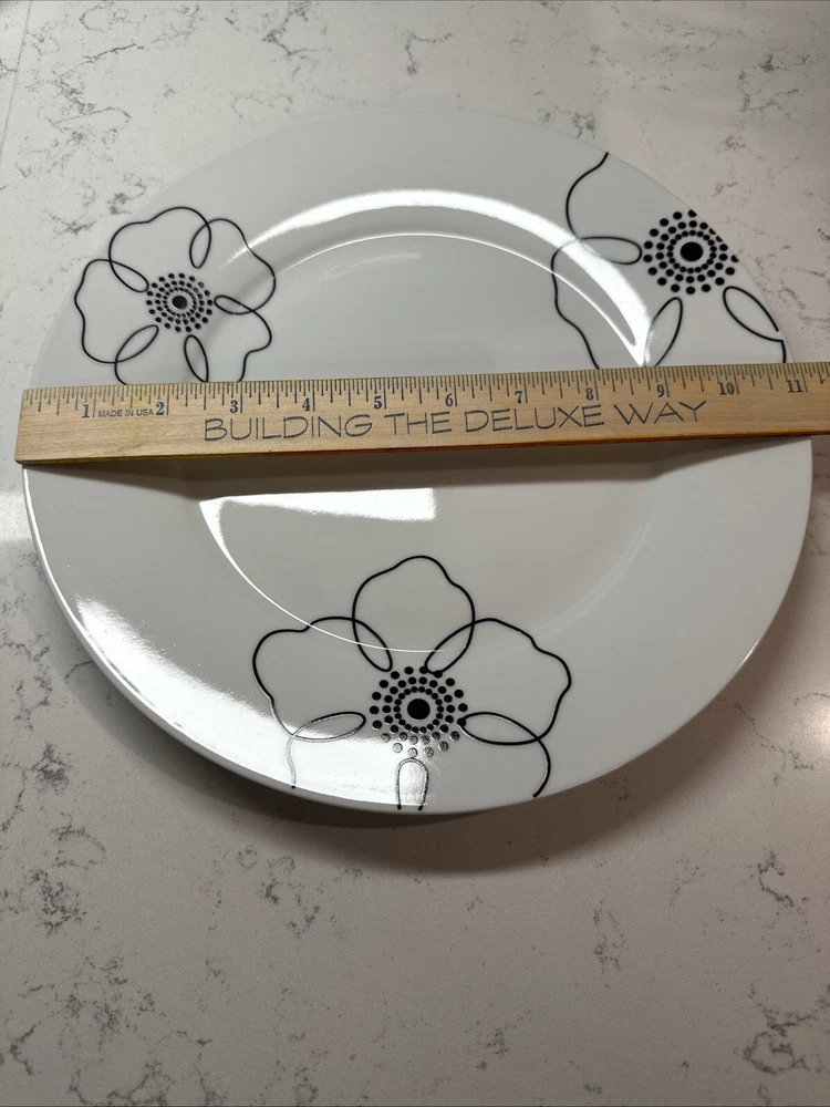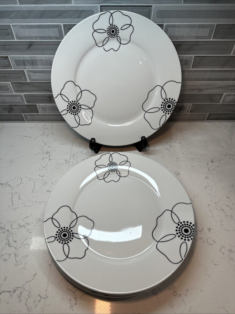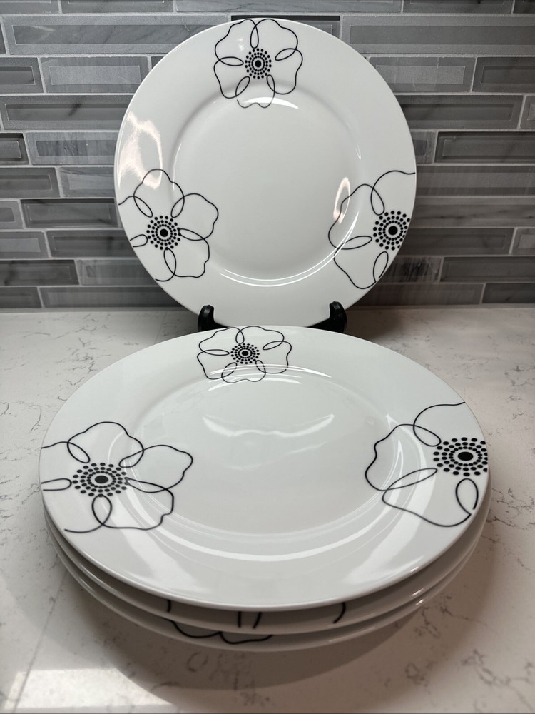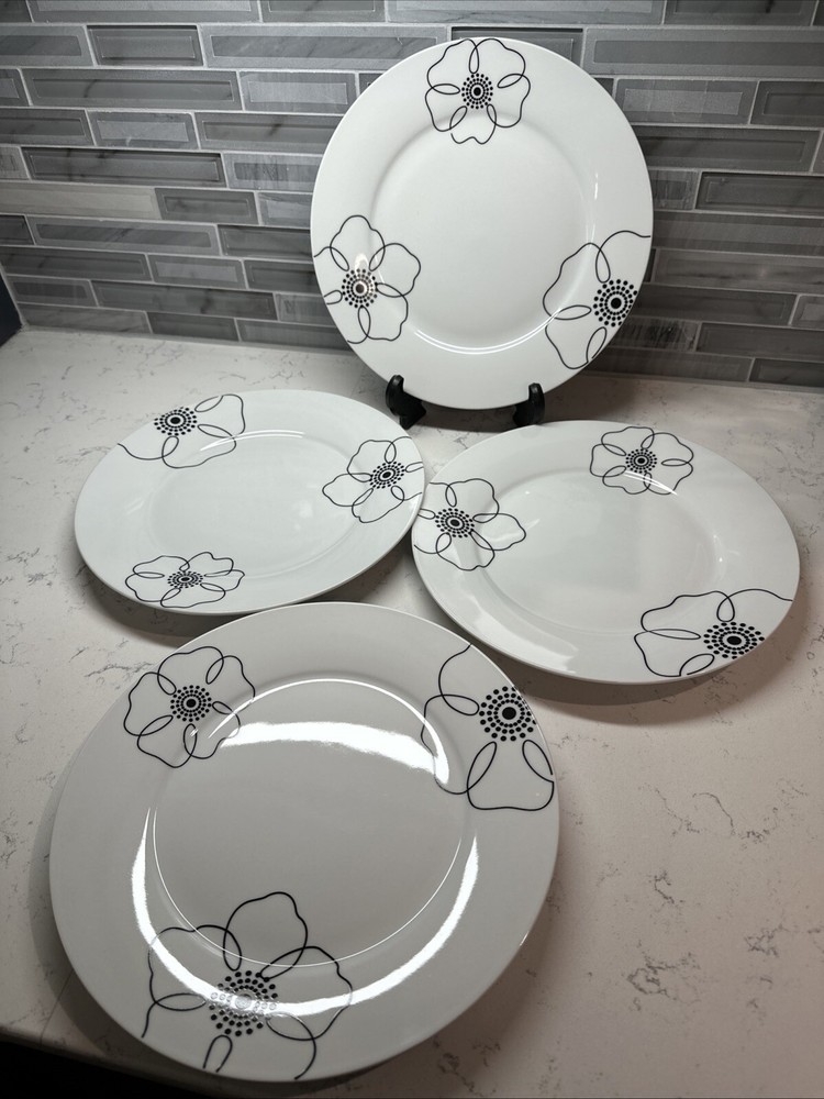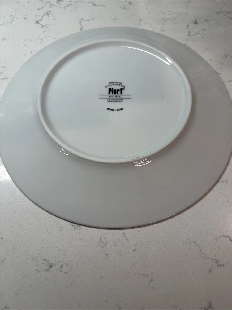 Add a touch of elegance to your dining experience with these Pier 1 Imports Mod Petal Dinner Plates. The four-piece set features round plates with a black and white tri-floral design, perfect for all occasions. The plates are made of high-quality porcelain and are machine washable up to 100°F, making them easy to clean. In addition, the plates are microwave and dishwasher safe, ensuring convenience and practicality. The glossy finish and printed backstamp complete the look of these stylish dinner plates. Measuring 11 inches in length and diameter, these plates are perfect for any adult setting. Excellent used condition. See pictures. SHIPS FREE!! PLEASE CHECK OUT OUR EBAY STORE FOR MORE GREAT DEALS!!