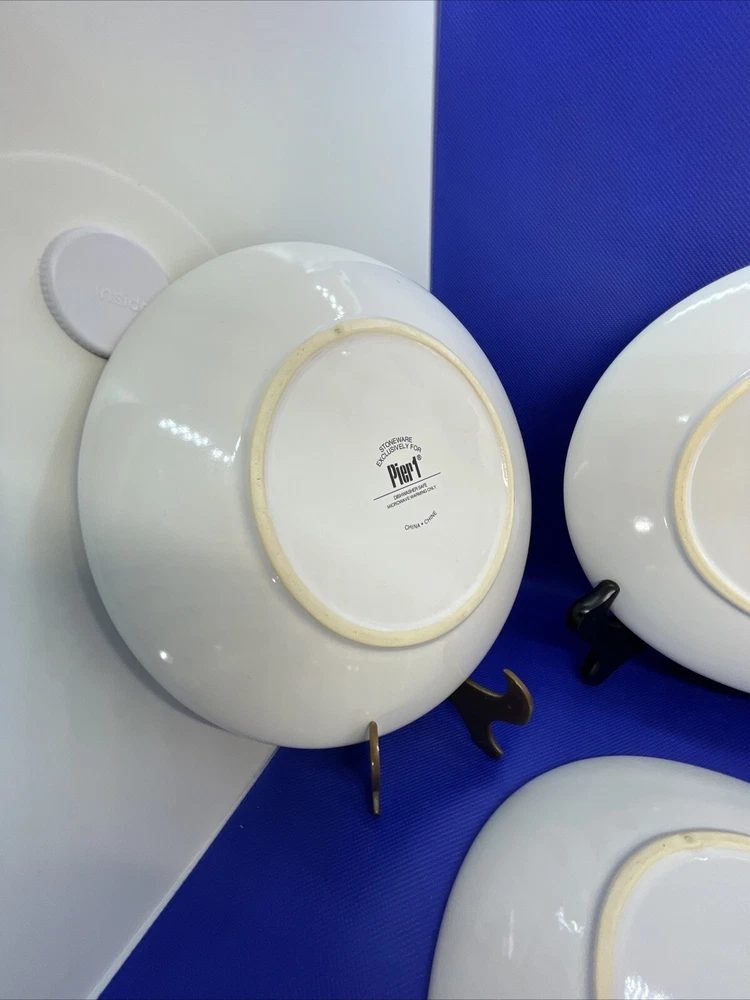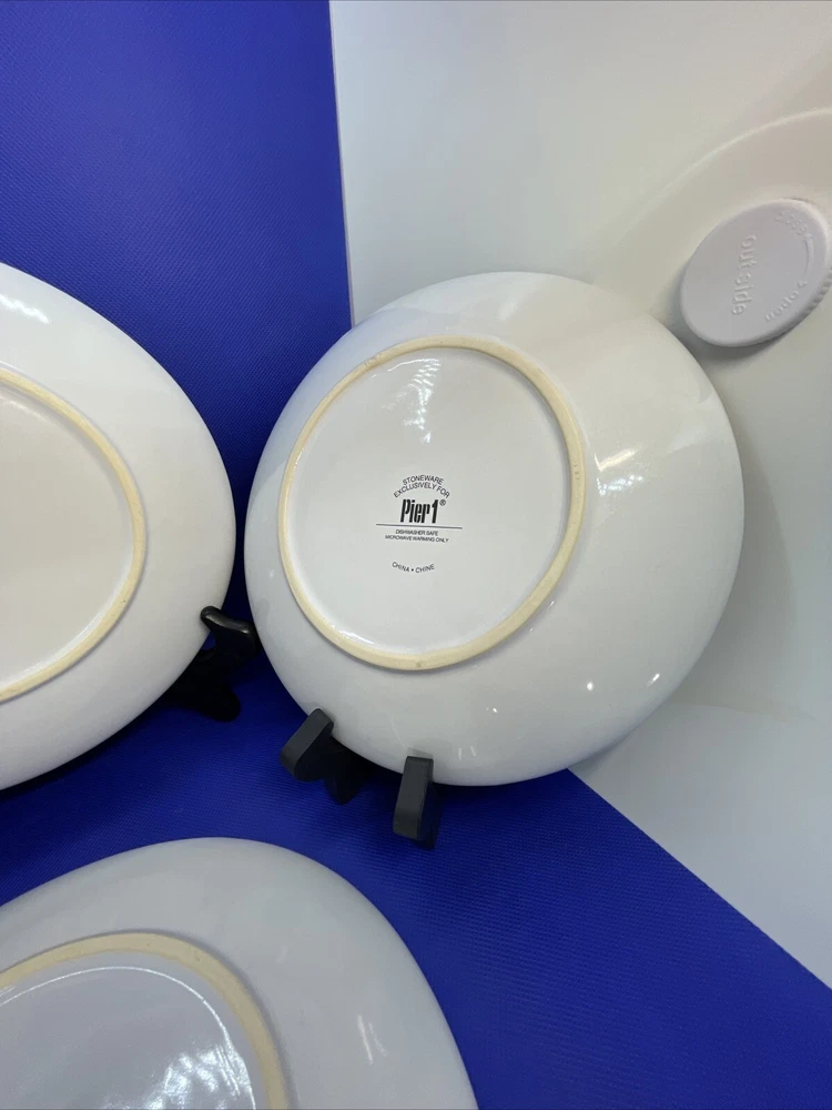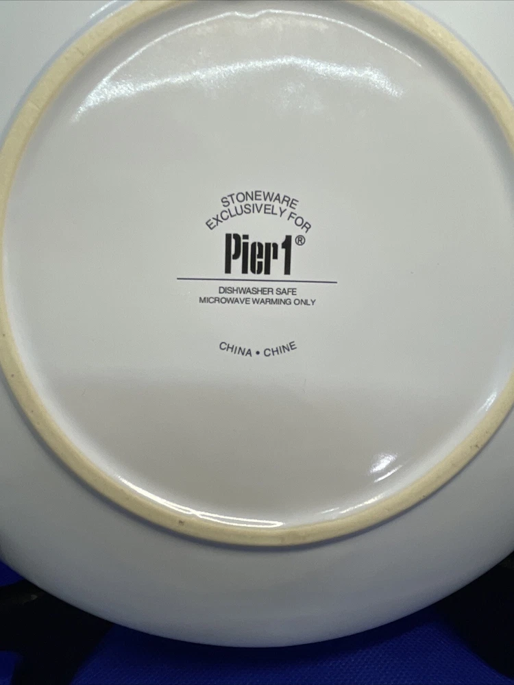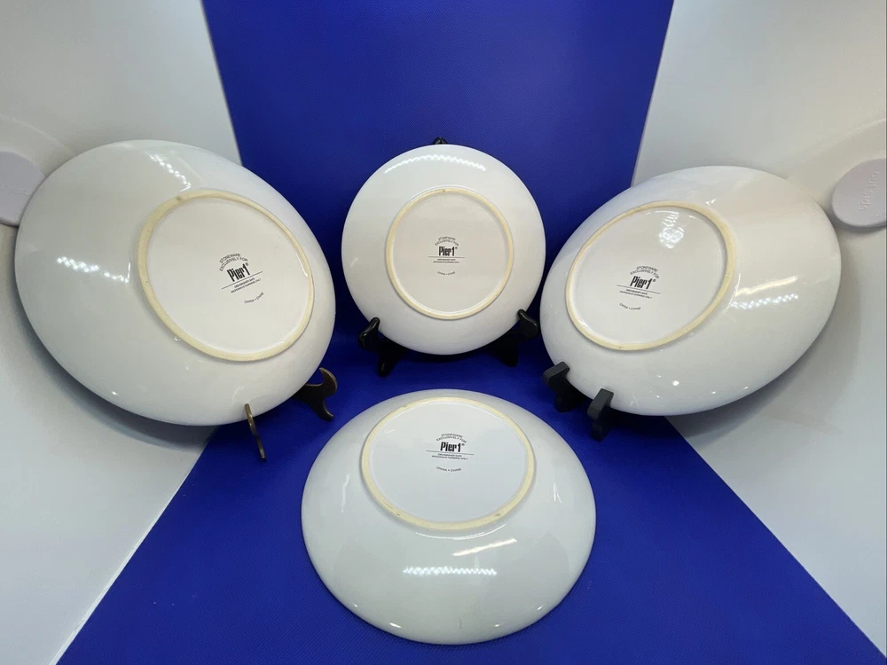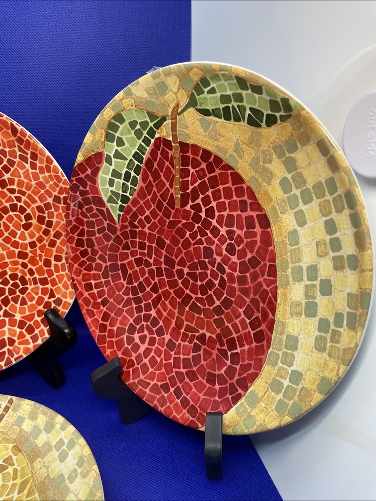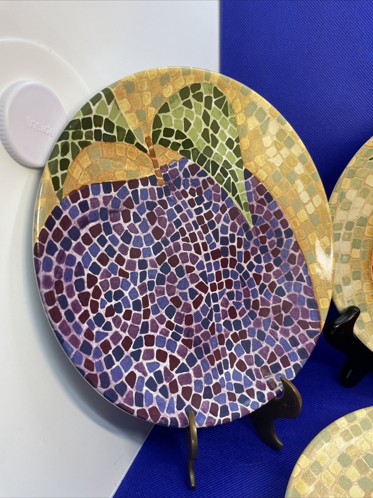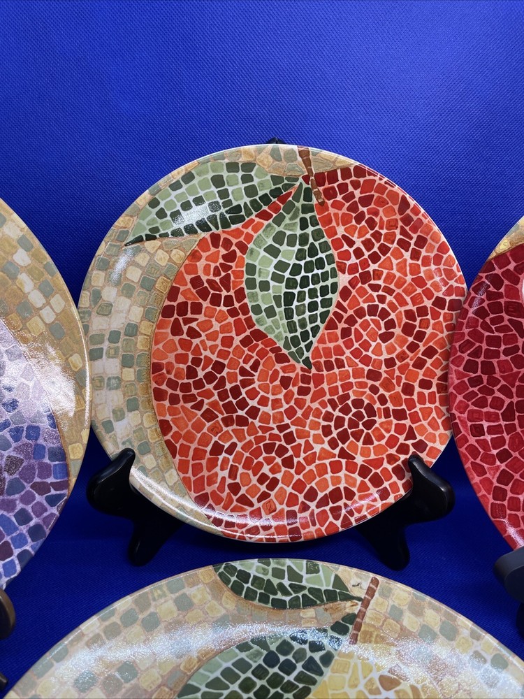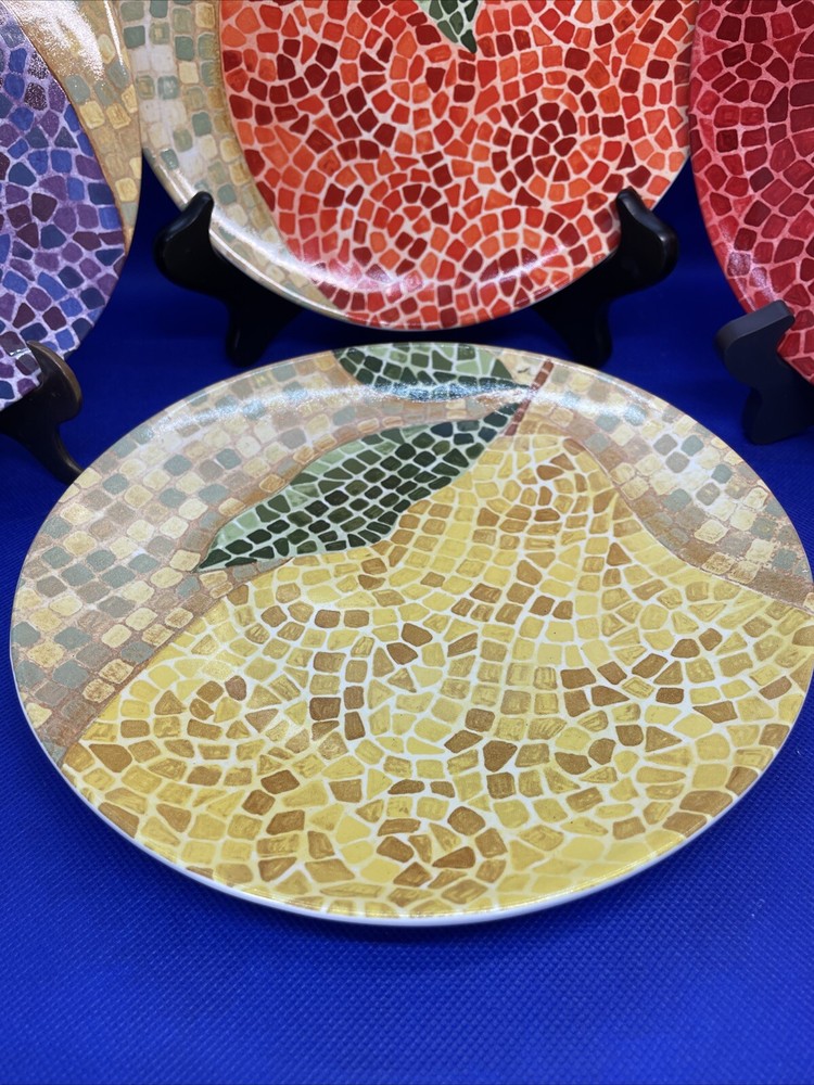 Add some stunning vivid color to your dining table with this set of four Pier 1 Imports Mosaic Fruits Plates. The set includes an apple plate, an orange plate, a plum plate, and a pear plate. They are ideal for serving a versatile palate of salads, dessert, side plates, or other dishes your imagination can create. These round plates measure 8 1/8 inches in diameter and feature a glossy finish with a colorful multicolor fruit design. The plates are stackable, microwave and dishwasher safe as noted on the Backstamp perfect for all occasions. Crafted from high-quality stoneware, these add inspired charm to your home as they are unique eye popping style. Consider them complementing some solid color dishes you already have for adventurous table setting and sure to impress your guests. All four plates are in excellent condition! No chips, cracks, or crazing. Very minor very random color marks on bottom only of plate footing rims where they rest on a table. Backstamps are very clear and unfaded. These plates appear to not have been used much at all. Thank you for visiting! Excited to sell what we know and love! Offering a legacy of quality possessions of life. Our background has been the love of memorable gatherings and family times around the table! We marvel at the artistry, skill in craftsmanship, and gorgeous designs of fine china, dinnerware, and flatware which we know as tableware! We think of Items worthy to own or even pass on for generations. Enjoy your purchase! We are working hard to provide vivid professional photos, describe items as we would want to know if we were the buyer, and work to offer only what passes our inspection! For instance, we check for defects such as cracks, chips, or crazing. We check flatware for spoon edge dents, bent fork tines, or bent knife tips too. Please feel free to easily communicate with us via “message” seller for questions. Our condition standards are as follows: Vintage Good - Age use marks present. NO damage such as NO chips, cracks, crazing, edge dents, bent tines, or tips. Very Good - Minor use marks present. NO damage such as NO chips, cracks or crazing, edge dents, bent tines, or tips. Excellent - Very faint minor use marks present. NO chips, cracks, crazing or in flatware no edge dents, bent tines, or tips. Near mint. Pristine Mint - NO use marks. NO damage such as NO chips, cracks, crazing, edge dents, bent tines or tips. Rarely used or new. We list top quality items in passed inspection condition. We absolutely care about our customer satisfaction with every purchase. Please feel free to communicate with us via “message” seller for questions. Positive “feedback” is appreciated and thank you for your time in doing this. Take Note: *We take pride in “quality”packing with the successful intent your items arrive in excellent shape! We as sellers deliver to the “shipper” within eBay required shipping window. Keep in mind, projected arrival times to the address of your item can be either ahead or delayed by the shipper once package is in transit. Tracking is provided. Please DOUBLE CHECK before ordering that your “ship to” address is the way you want it! *All our fine tableware items are washed and cleaned before listing so what you see in the pics is the representation at its best *We are absolutely committed to an awesome customer experience. Thank you again for your positive feedback and know we appreciate your decision to buy from us.
