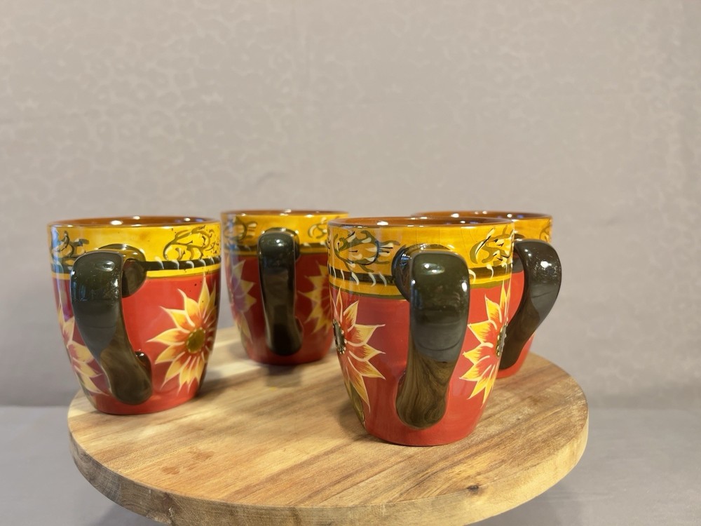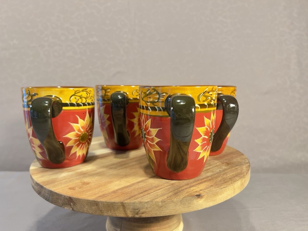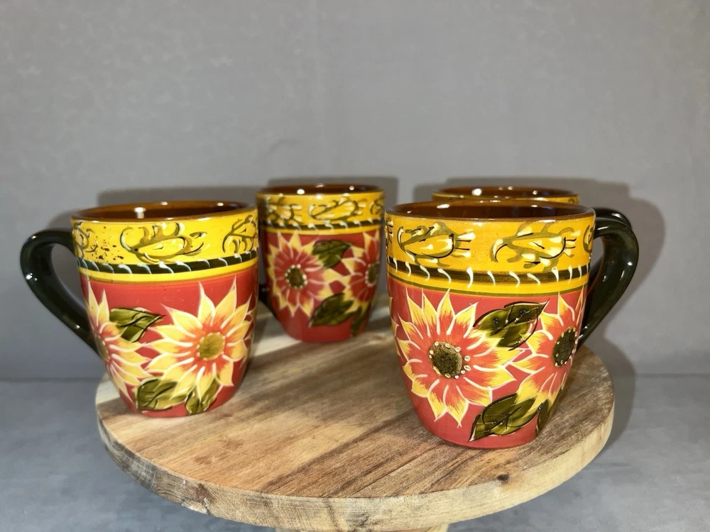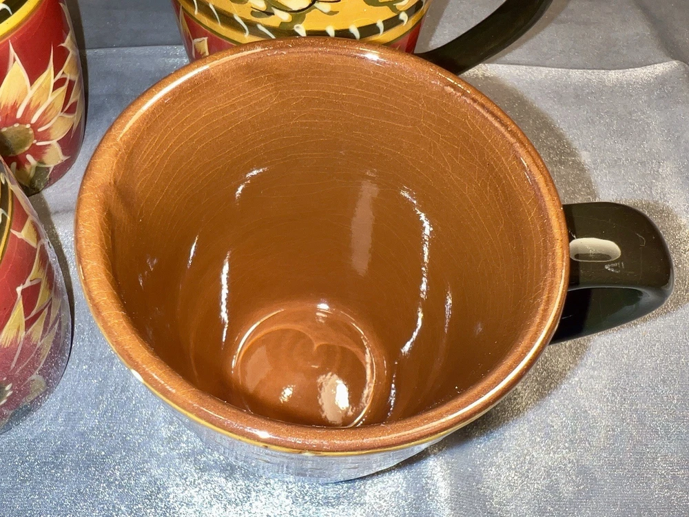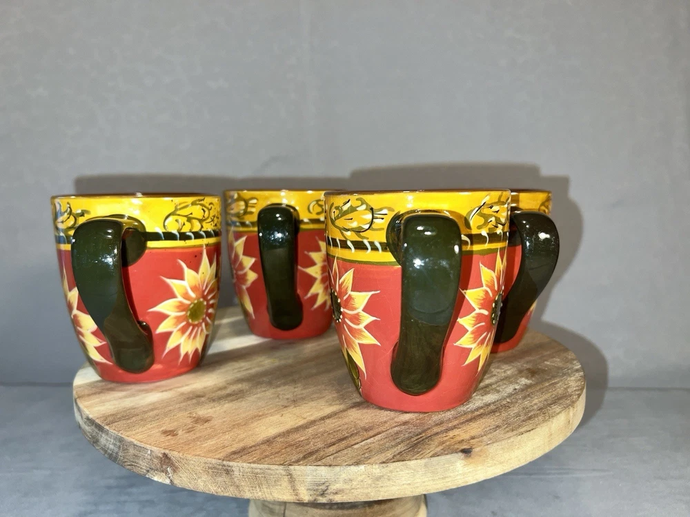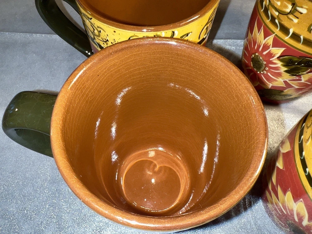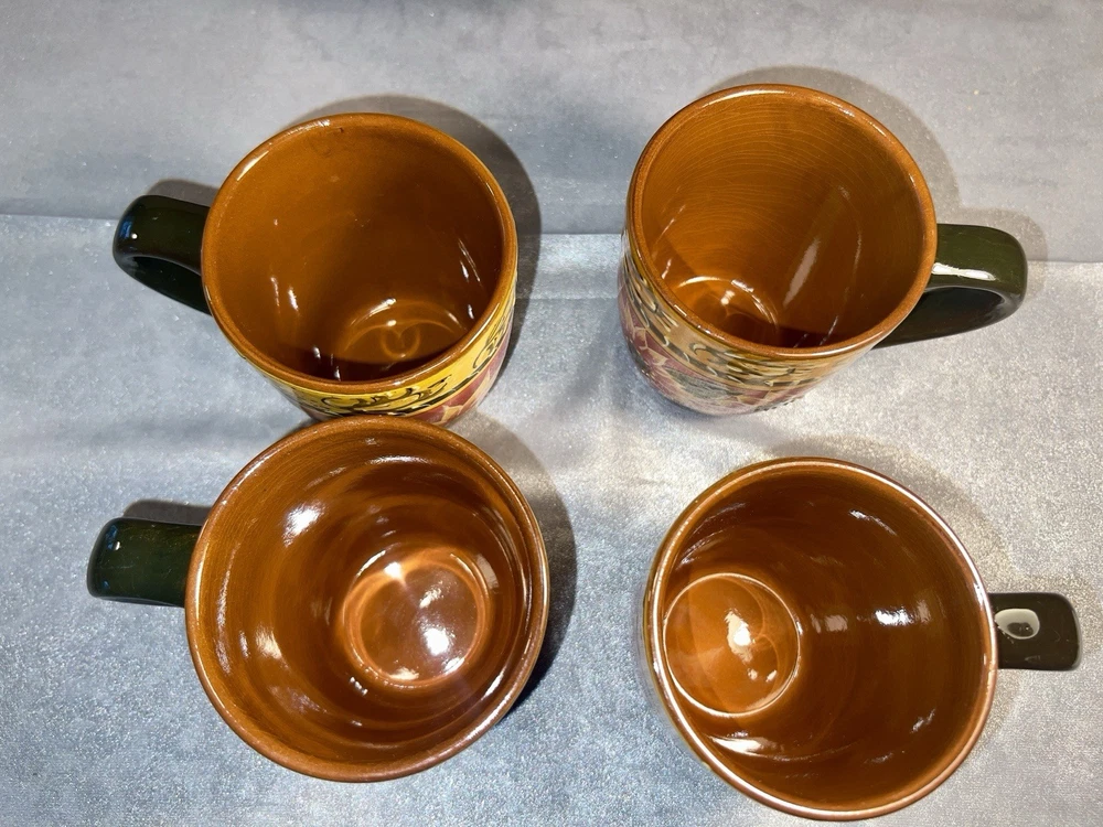 This is a very pretty pre-owned set of 4 hand painted terracotta mugs. There are no visible chips or cracks. There are a few very light surface scratches on a couple of the handles from normal use. Please check out all photos Thank you for looking.