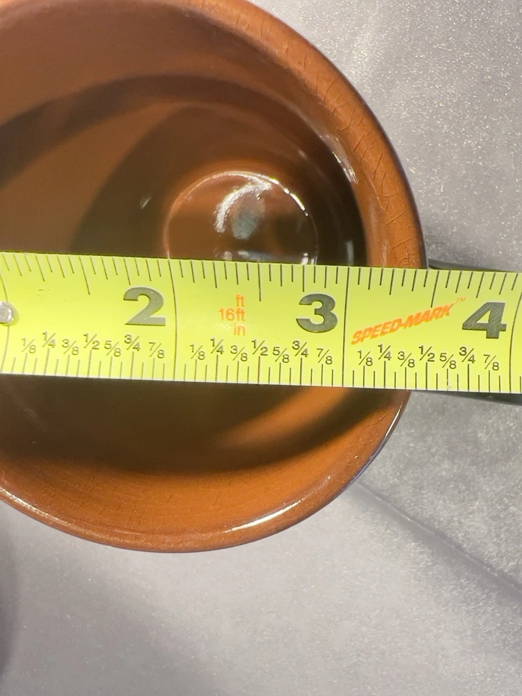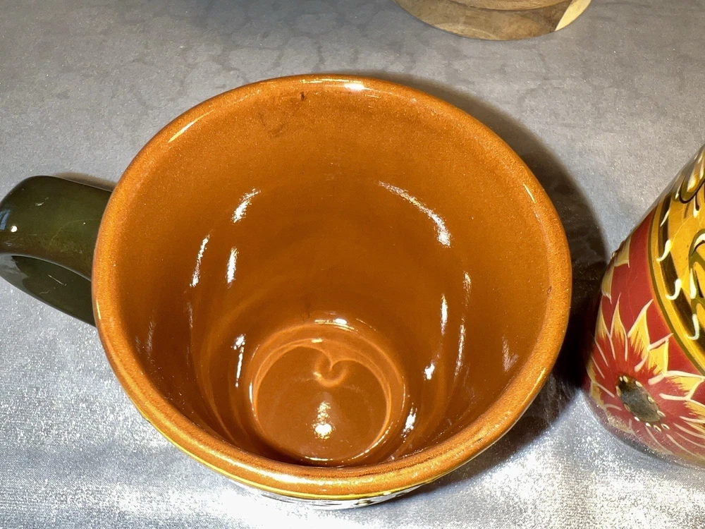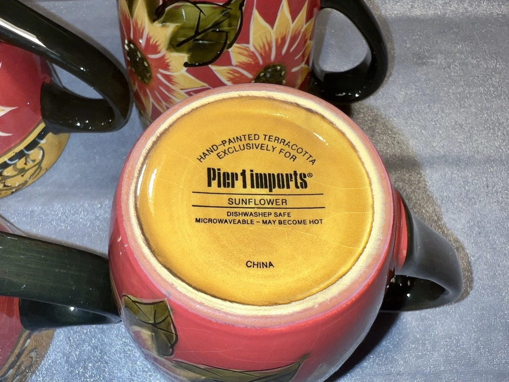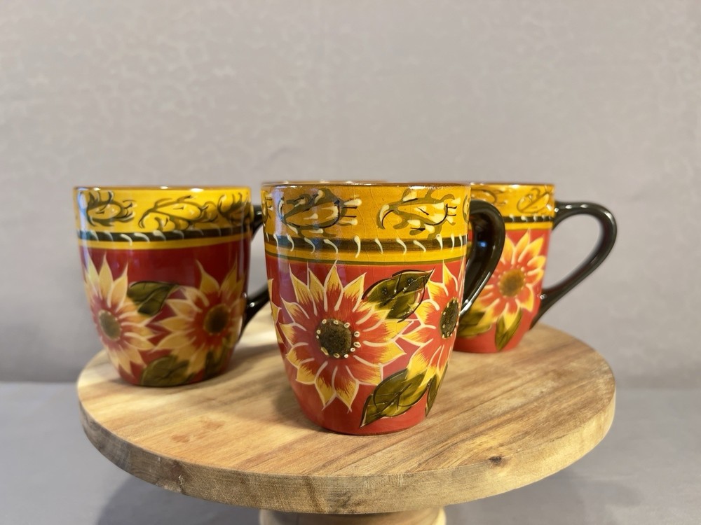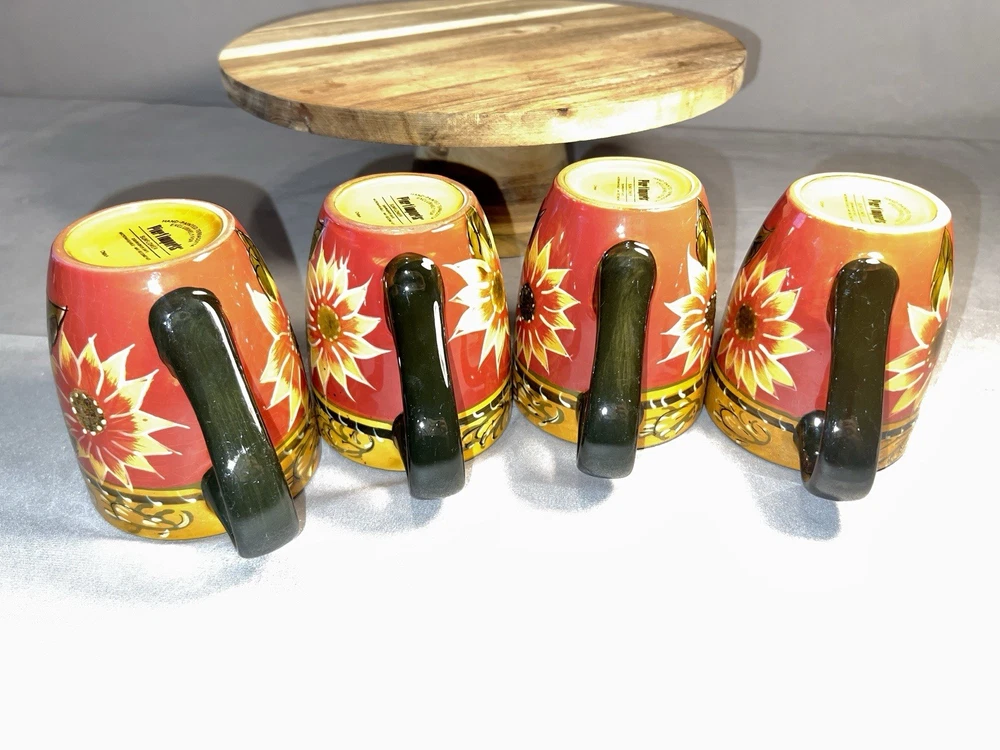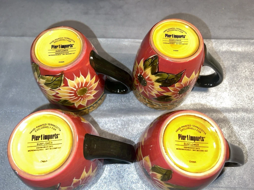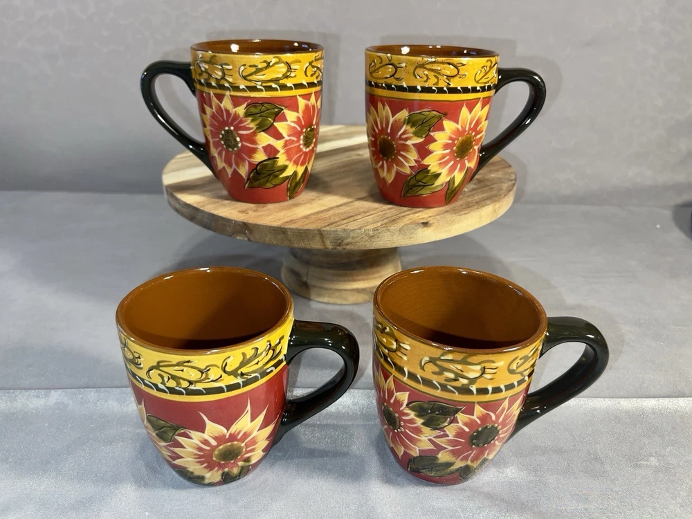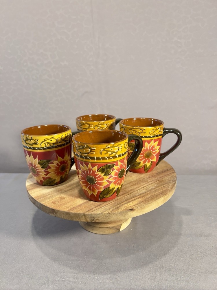 This is a very pretty pre-owned set of 4 hand painted terracotta mugs. There are no visible chips or cracks. There are a few very light surface scratches on a couple of the handles from normal use. Please check out all photos Thank you for looking.