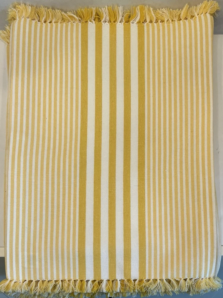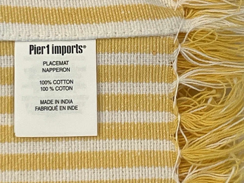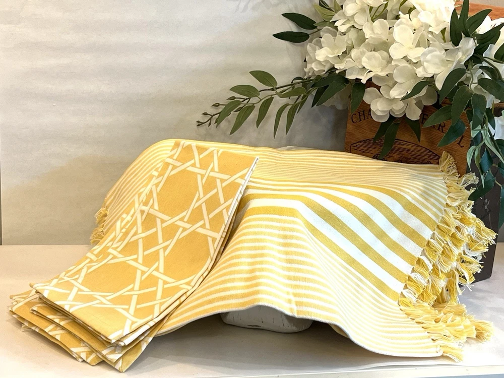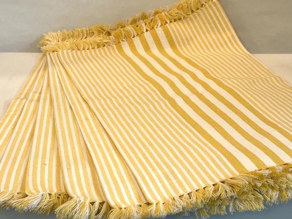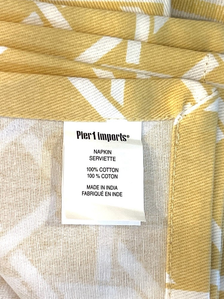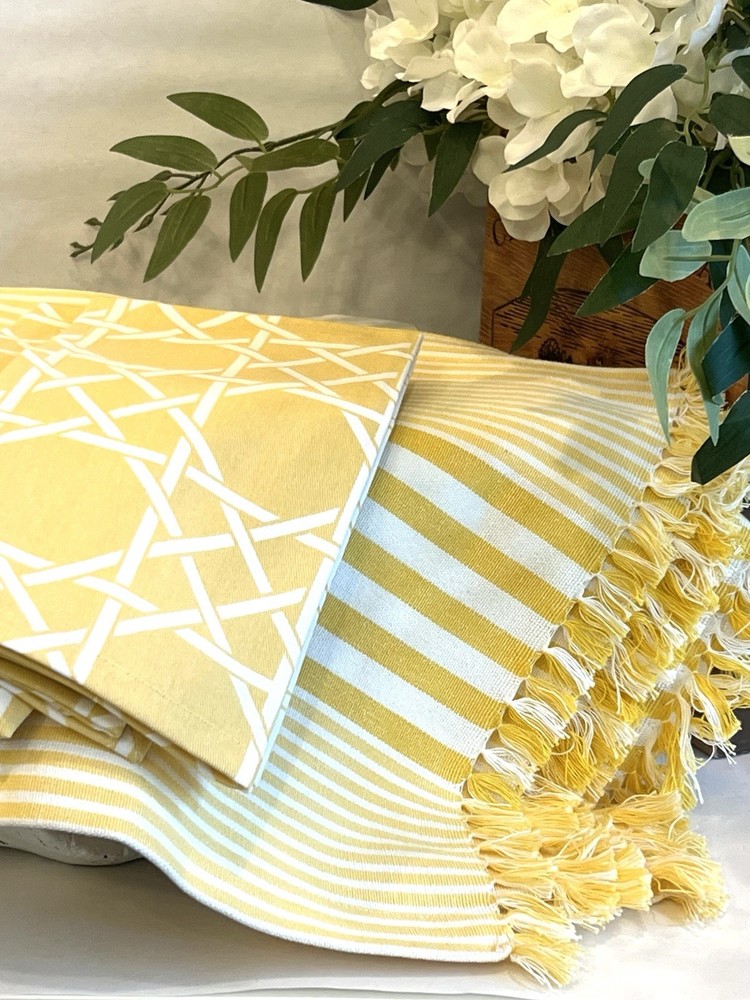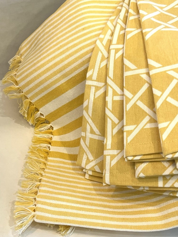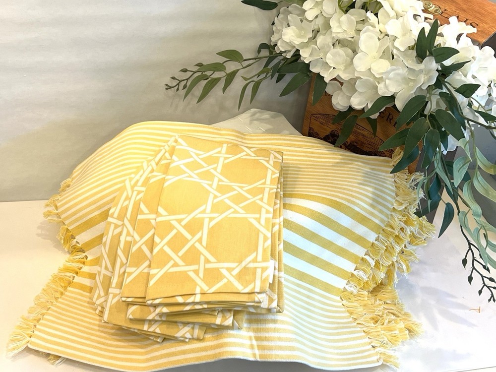 The product is a set of NEW yellow and white geometric patterned napkins and striped placemats from Pier 1 Imports. Perfect for Spring or Easter. This set includes 4 napkins, 20” X 21” AND six placemats, 21” X 13 1/4” all made of 100% cotton and machine washable for easy maintenance. These beautiful napkins and placemats are suitable for use in the kitchen or dining room. The yellow and white color scheme adds a vibrant touch to any dining table setting.