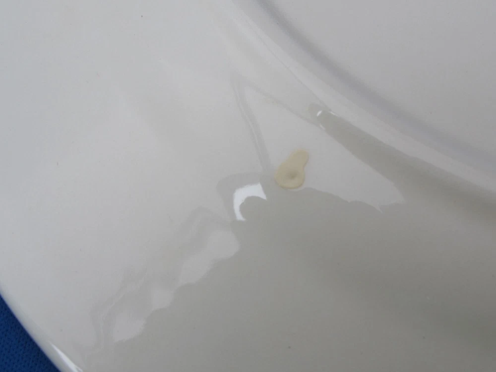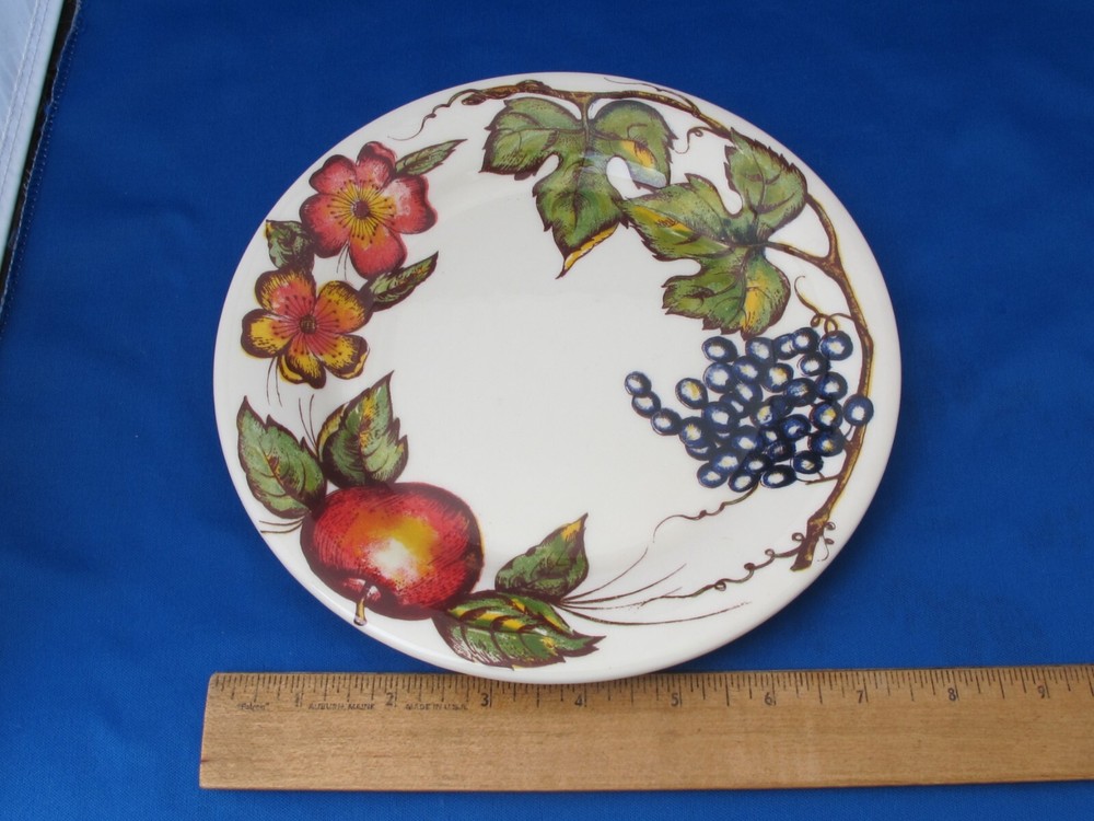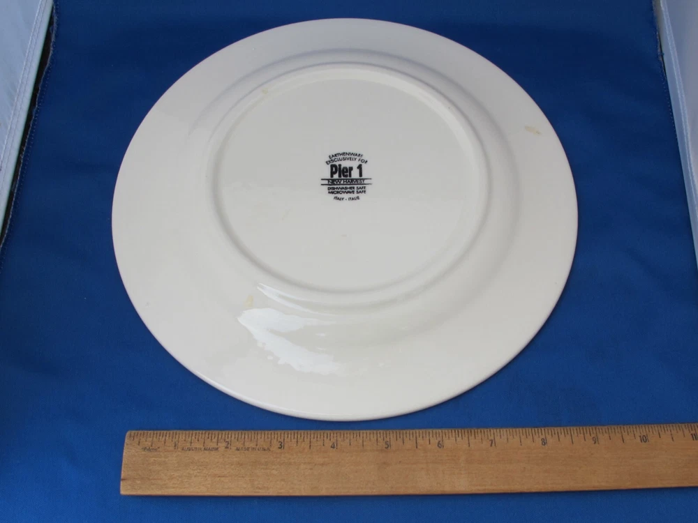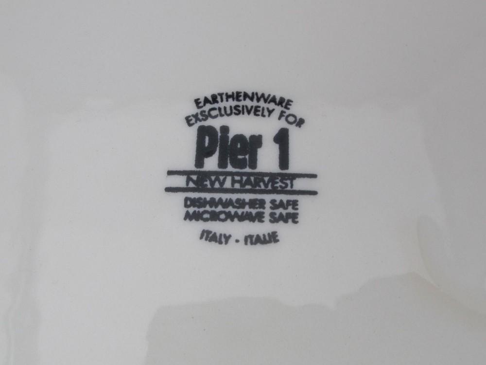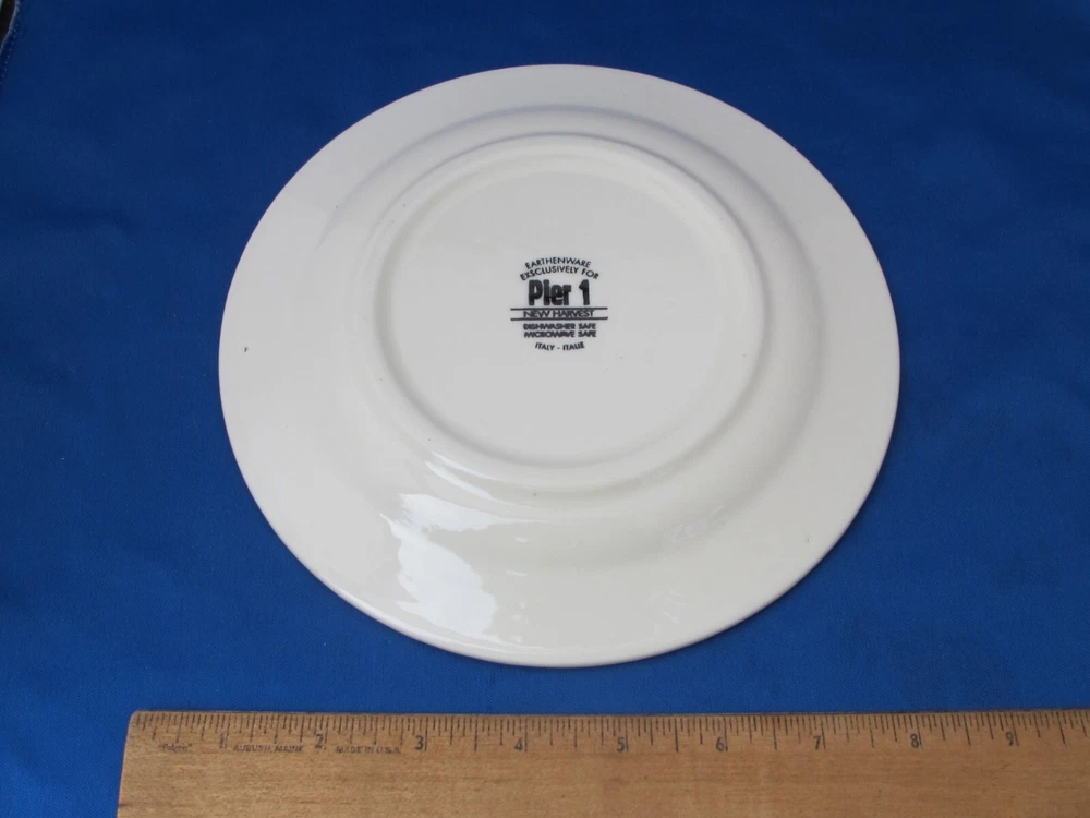 Up for bid are two dinner plates and a salad plate in the NEW HARVEST pattern by Pier 1 Imports. The dinner plates are 10 1/4 inches in diameter, and the salad plate is 7 7/8 inches. The plates are marked "EARTHENWARE / EXCLUSIVELY FOR / Pier 1 / NEW HARVEST / DISHWASHER SAFE / MICROWAVE SAFE / ITALY-ITALIE". Condition on the plates is fairly good. One dinner plate has a small glaze fracture through the mark, but it does not affect the body. The other dinner plate has a couple of yellowish patches on the back, and both have some overpainting of the stilt marks on the back. There are just a few light utensil scratches. Some decent plates in a fun fall pattern!