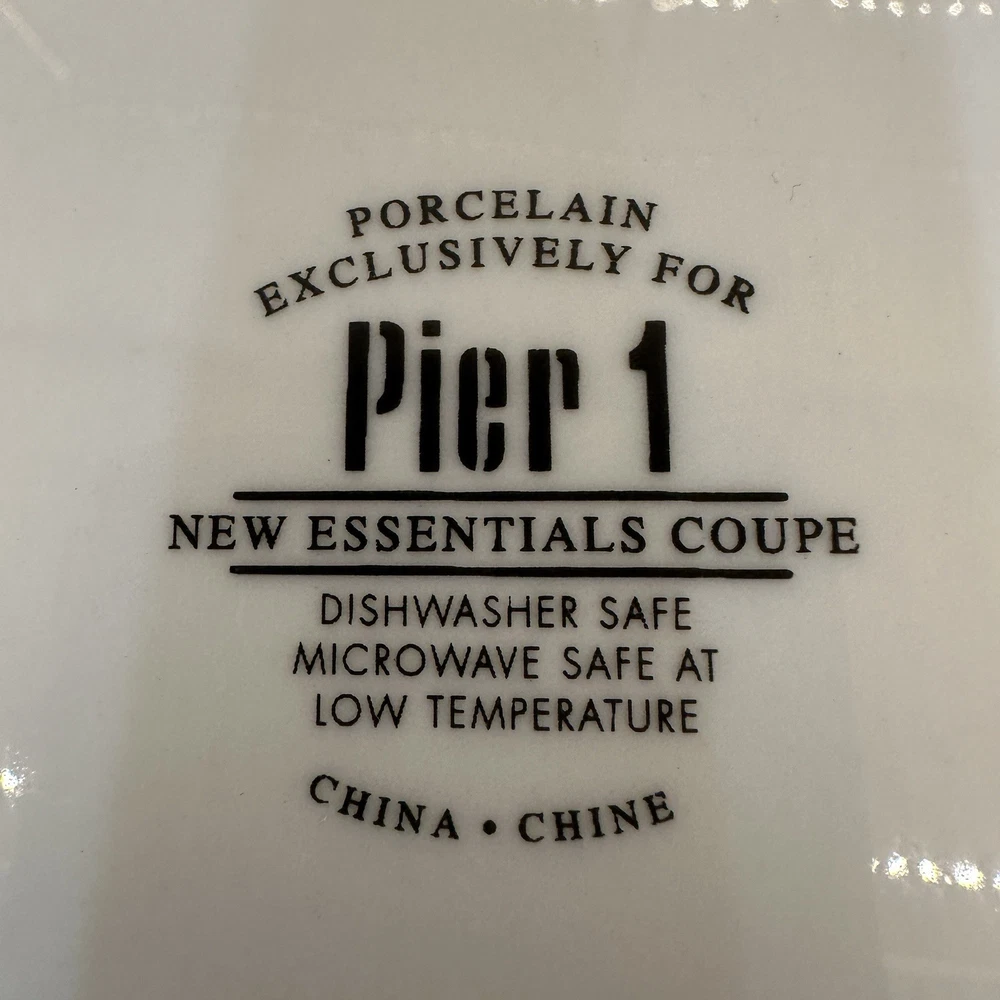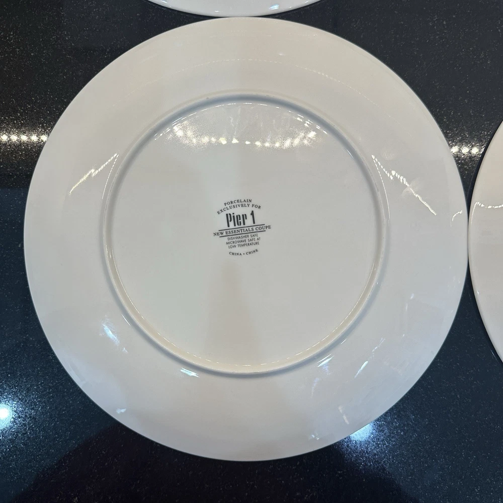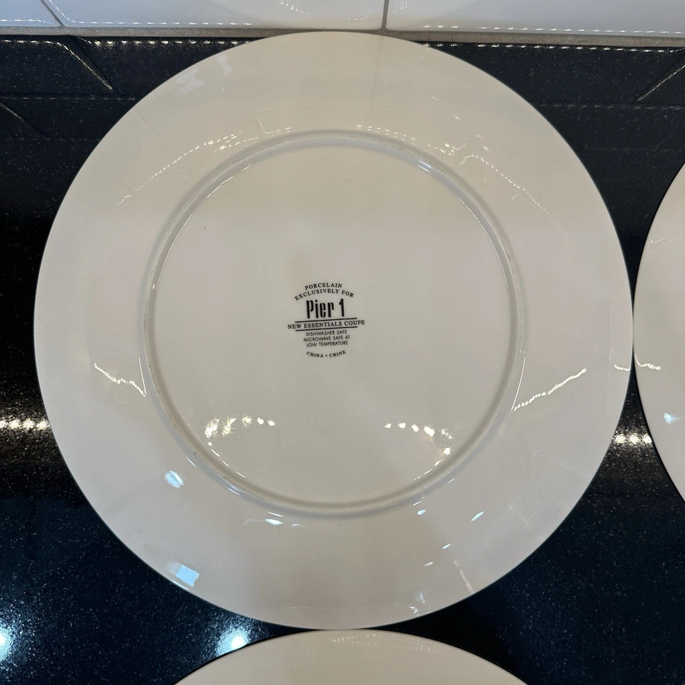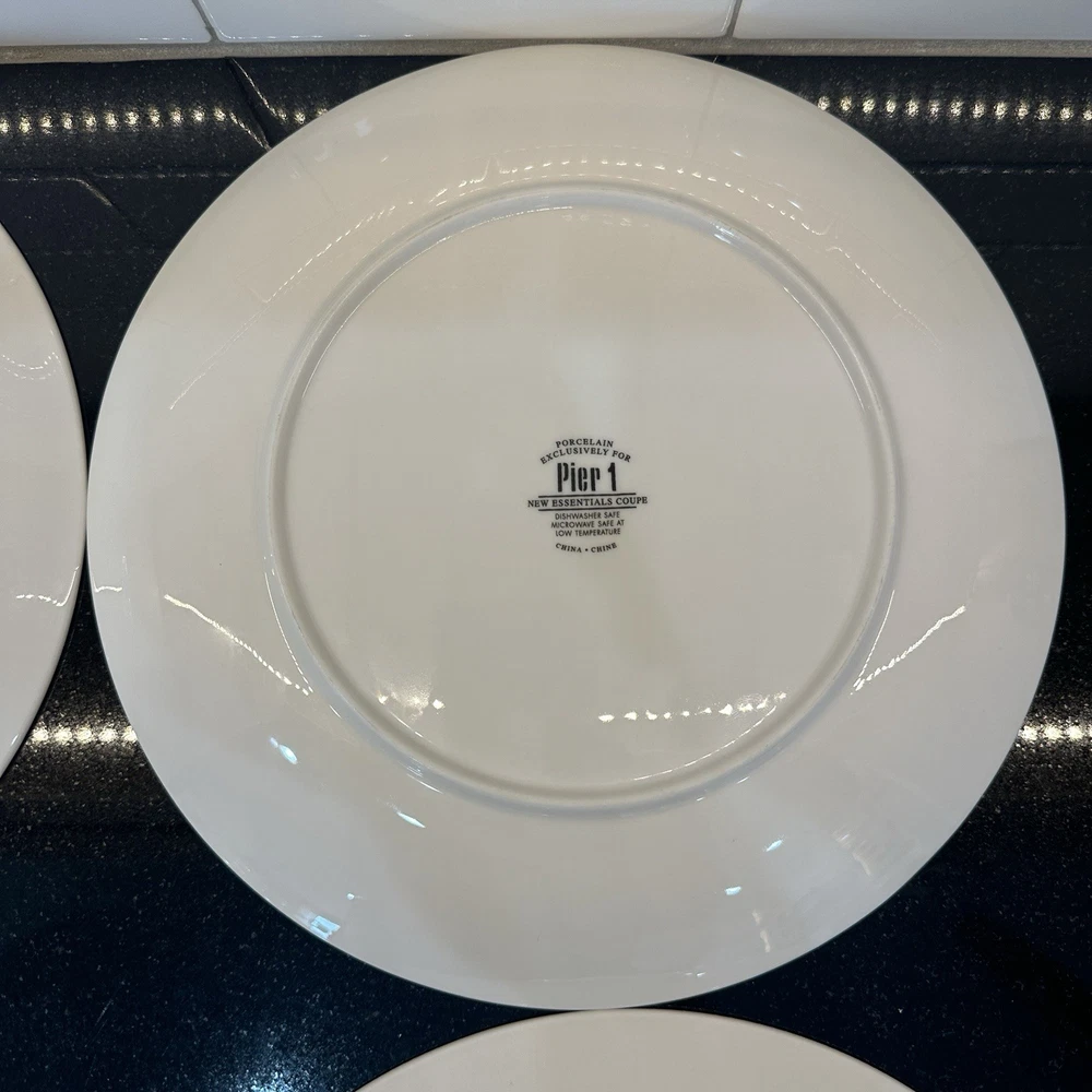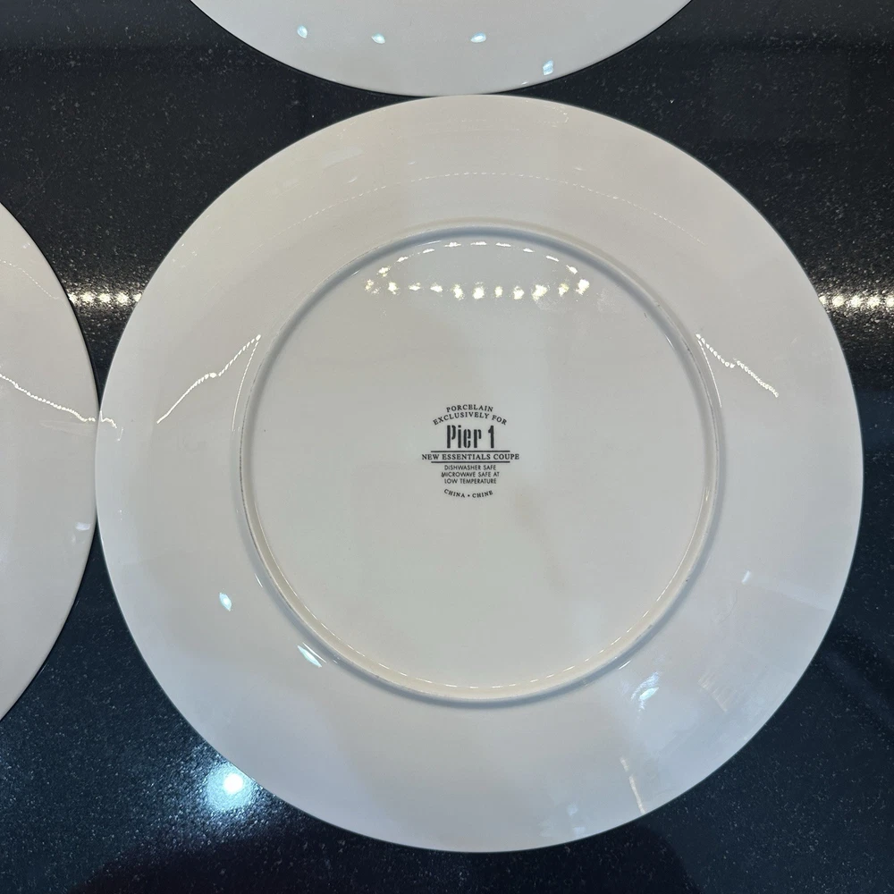 Add a touch of contemporary elegance to your dining table with this four-piece set of Pier 1 Imports New Essentials Coupe dinner plates. Made of high-quality porcelain, these round plates have a glossy finish and measure 11-1/8 inches in diameter. The all-white design makes them suitable for any occasion and complements any table setting. These plates are both dishwasher and microwave safe, making them practical as well as stylish. They feature a printed backstamp from Pier 1 Imports and belong to the Coupe product line. Whether you're hosting a formal dinner party or having a casual meal with your family, these plates are sure to impress your guests. Preowned and in excellent condition.