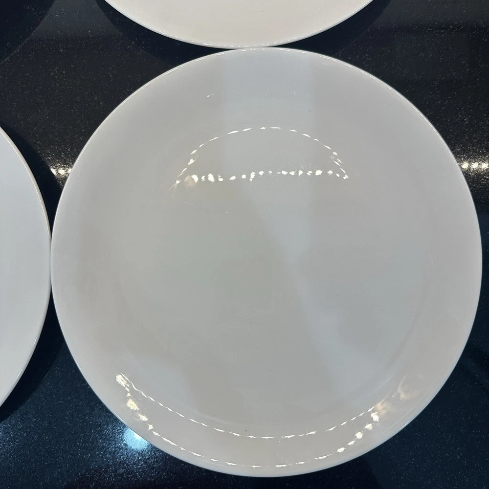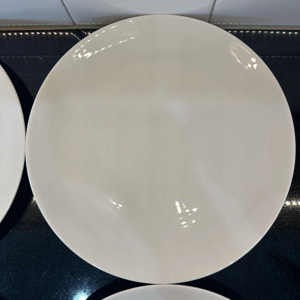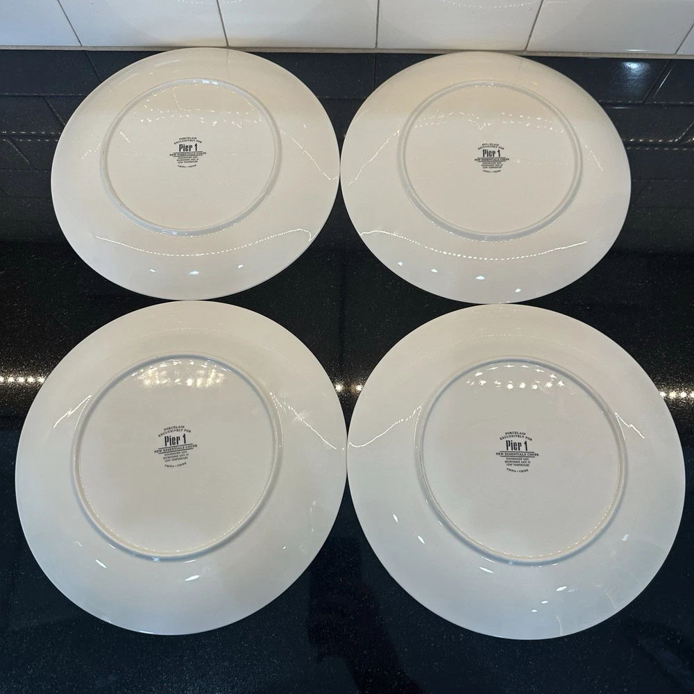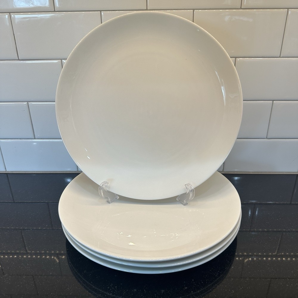 Add a touch of contemporary elegance to your dining table with this four-piece set of Pier 1 Imports New Essentials Coupe dinner plates. Made of high-quality porcelain, these round plates have a glossy finish and measure 11-1/8 inches in diameter. The all-white design makes them suitable for any occasion and complements any table setting. These plates are both dishwasher and microwave safe, making them practical as well as stylish. They feature a printed backstamp from Pier 1 Imports and belong to the Coupe product line. Whether you're hosting a formal dinner party or having a casual meal with your family, these plates are sure to impress your guests. Preowned and in excellent condition.