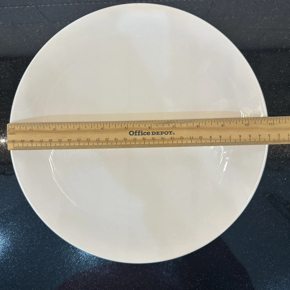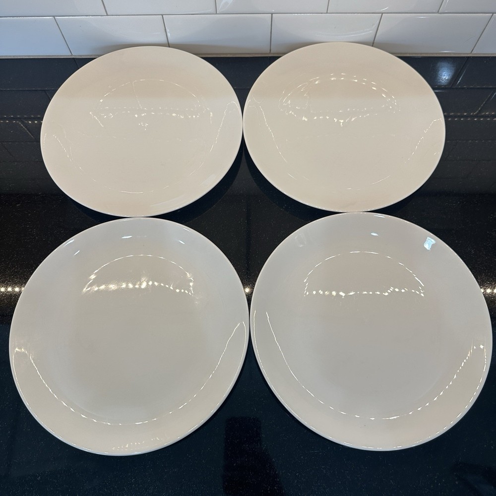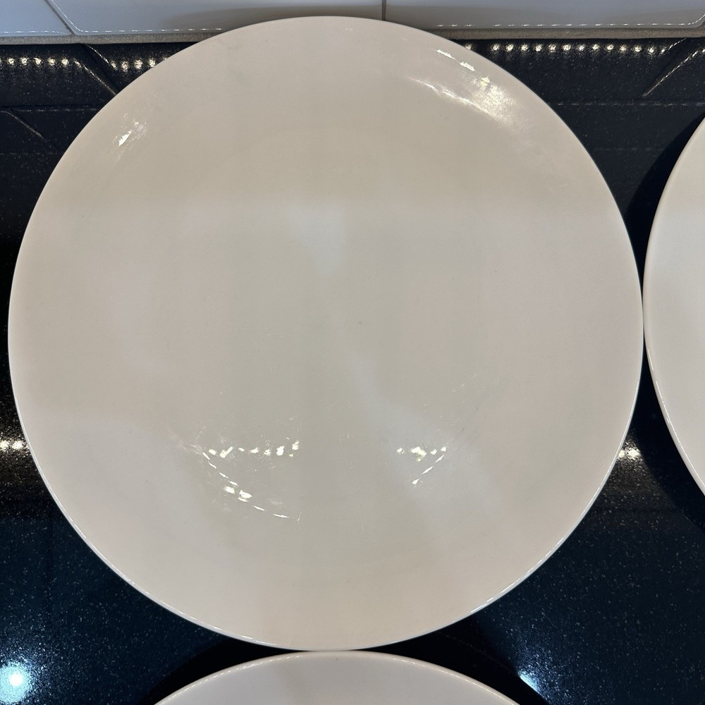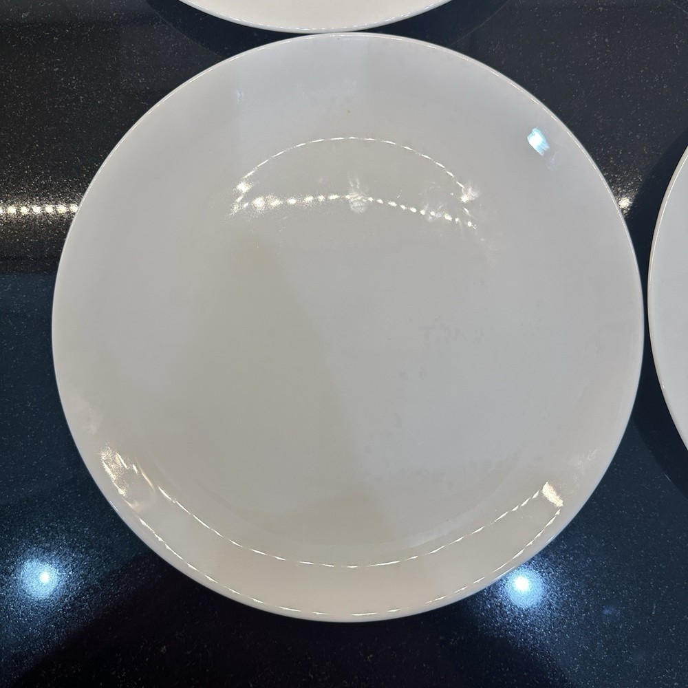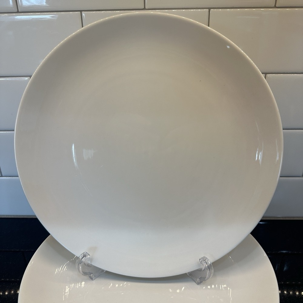 Add a touch of contemporary elegance to your dining table with this four-piece set of Pier 1 Imports New Essentials Coupe dinner plates. Made of high-quality porcelain, these round plates have a glossy finish and measure 11-1/8 inches in diameter. The all-white design makes them suitable for any occasion and complements any table setting. These plates are both dishwasher and microwave safe, making them practical as well as stylish. They feature a printed backstamp from Pier 1 Imports and belong to the Coupe product line. Whether you're hosting a formal dinner party or having a casual meal with your family, these plates are sure to impress your guests. Preowned and in excellent condition.