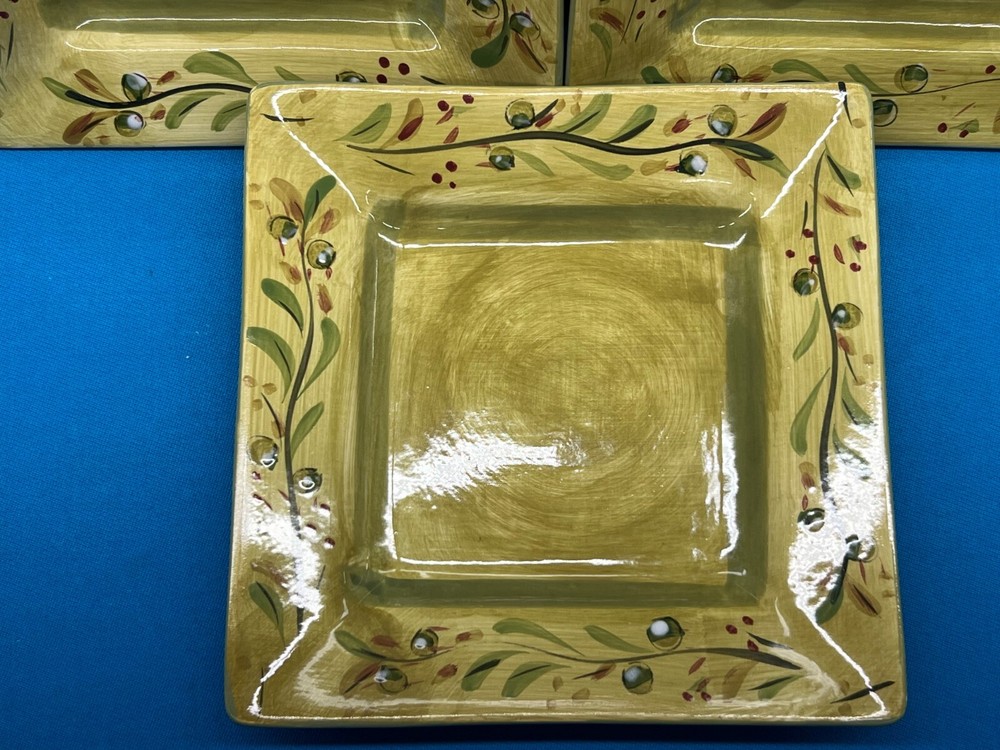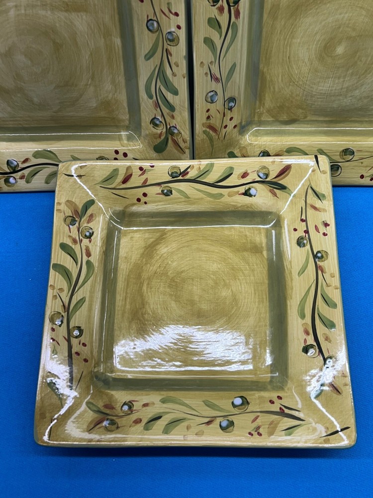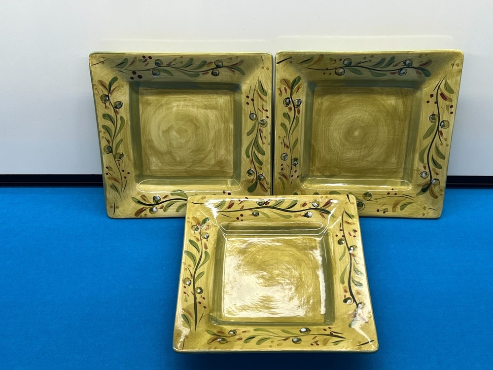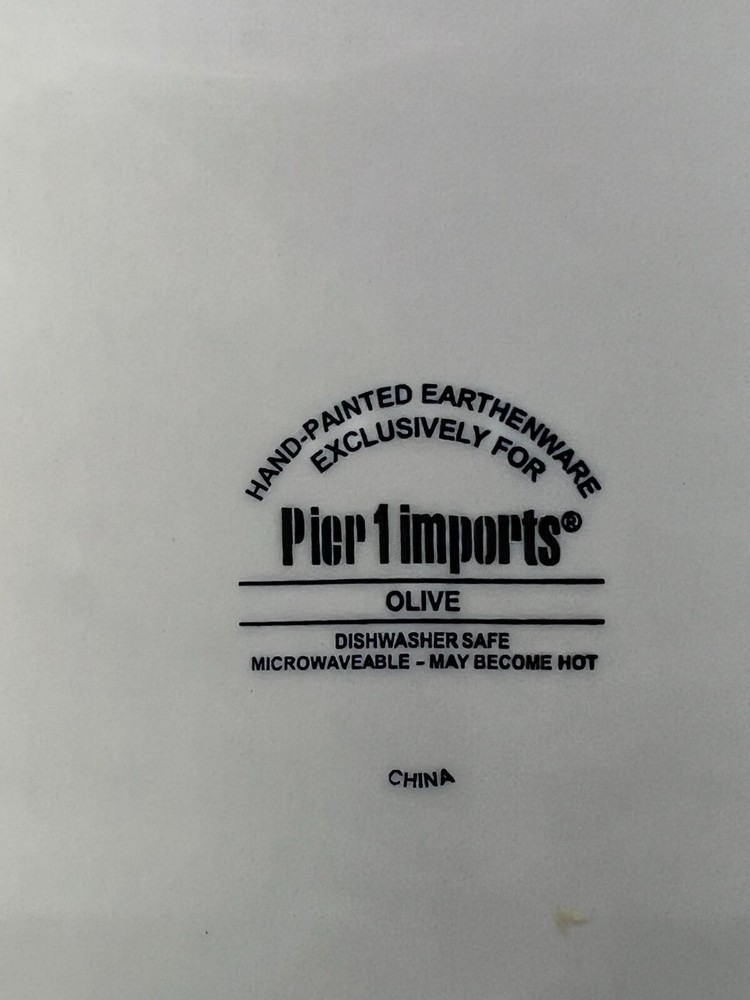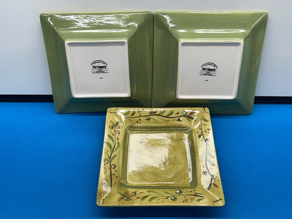 Add a touch of elegance to your dining table with these limited edition Pier 1 Imports OLIVE dinner plates. Each plate is hand painted with beautiful green vines and measures 8 inches in length and width. These earthenware plates are dishwasher safe and perfect for all occasions. The glossy finish and original art pottery production style make these plates a must-have for any collector. The set includes three plates and features the Olive theme. These plates were manufactured in 2009 in China using pottery production techniques. Upgrade your dinnerware collection with these unique and beautiful plates.