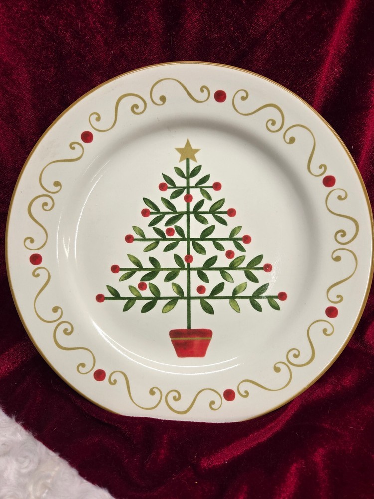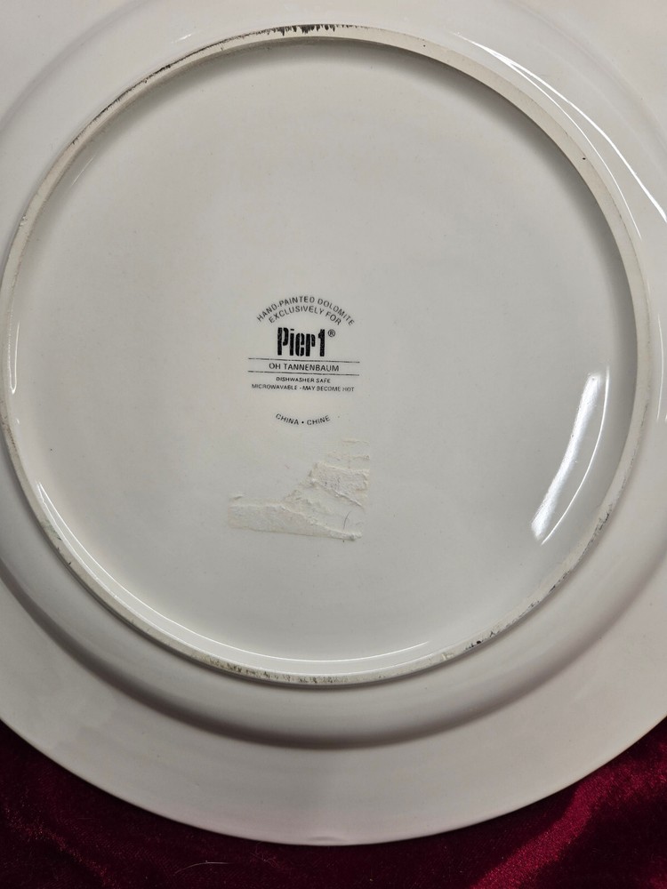 Add a festive touch to your dining table with this beautiful Pier 1 Imports "Oh Tannenbaum" Christmas Tree Dinner Plate. The round plate features a cream-colored base with a green, red, and mustard-colored tree design, perfect for the holiday season. Made of high-quality dolomite material and produced using art pottery techniques in China, this dinner plate is a must-have for any collector or lover of unique and stylish dinnerware. The plate has a printed backstamp. Get ready to impress your guests with this one-of-a-kind Christmas Tree Dinner Plate from Pier 1 Imports. Previously Owned - Excellent Condition - NO chips - NO cracks!