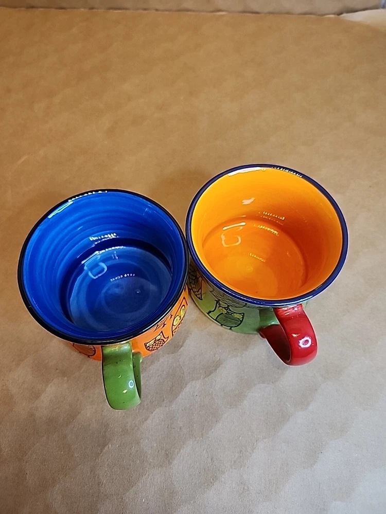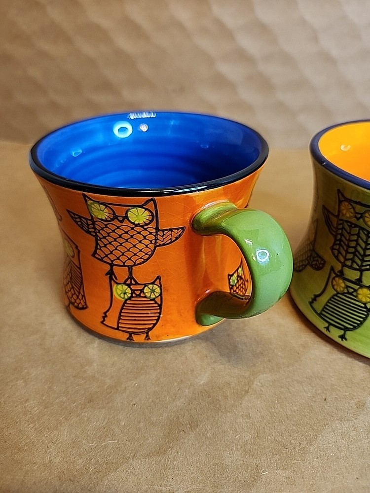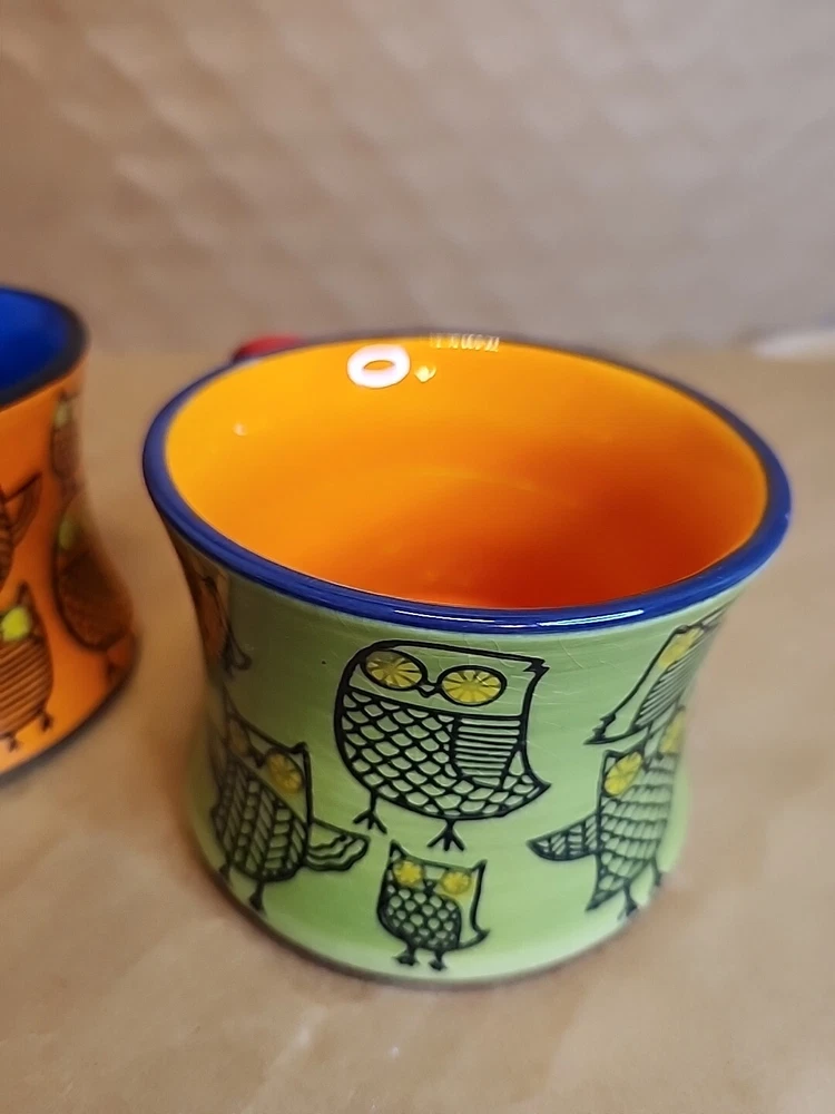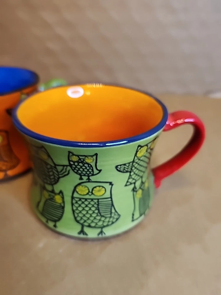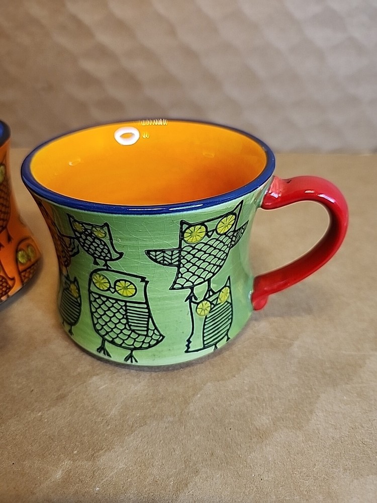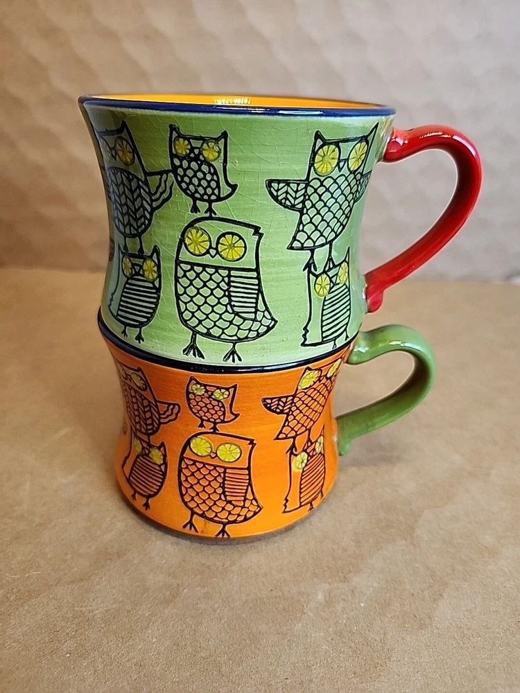 Add a touch of whimsy to your morning routine with this set of two Pier 1 Imports Owl Coffee Tea Cups. These ceramic mugs feature a colorful, hand-painted design with a bohemian style that is perfect for all occasions. The round shape and stackable design make them easy to store and transport, while the 3-inch height and 4-inch width provide a comfortable size for hot or cold beverages. The set includes both a tea cup and a coffee cup, each with a unique animal print pattern featuring owls. They are machine washable and made in China, ensuring durability and easy care. These mugs are ideal for teens and unisex adults who love to enjoy a hot or cold drink in style.