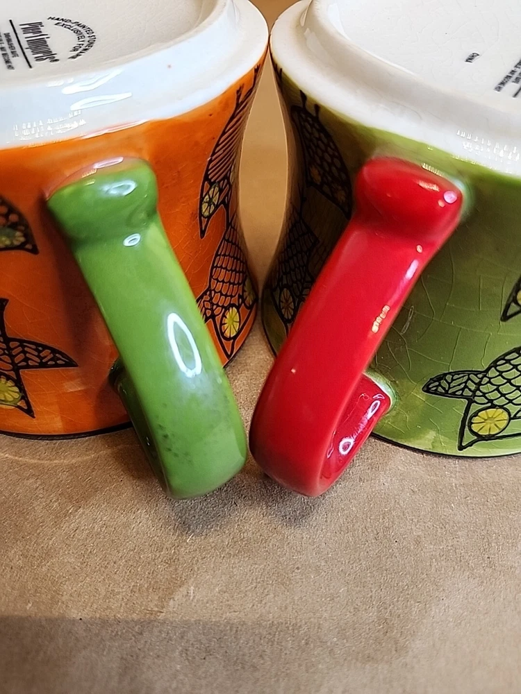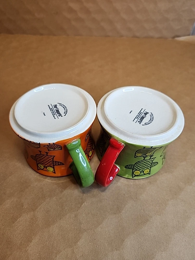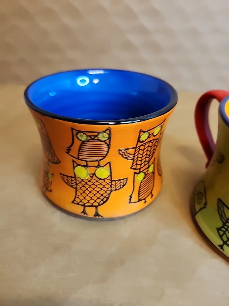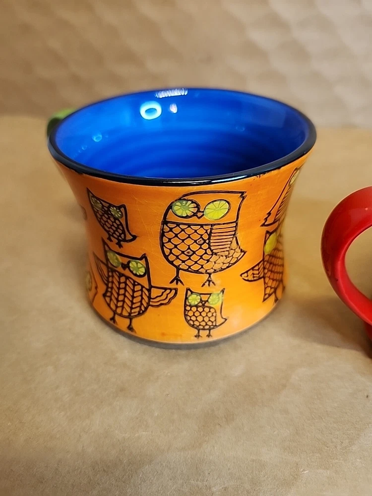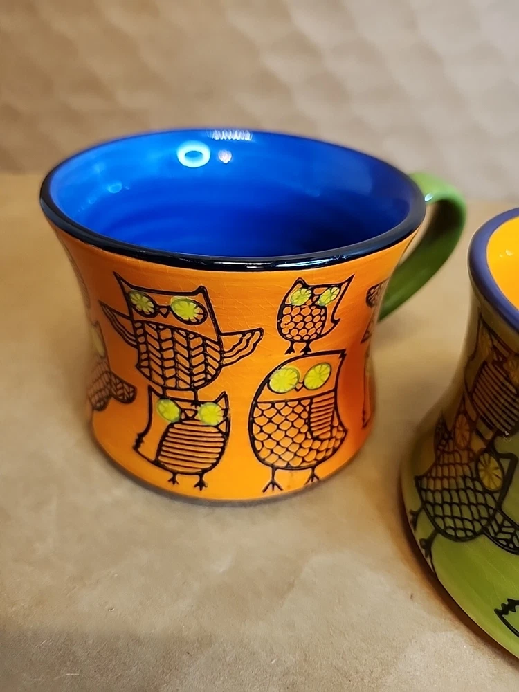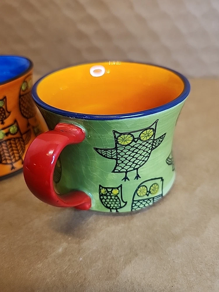 Add a touch of whimsy to your morning routine with this set of two Pier 1 Imports Owl Coffee Tea Cups. These ceramic mugs feature a colorful, hand-painted design with a bohemian style that is perfect for all occasions. The round shape and stackable design make them easy to store and transport, while the 3-inch height and 4-inch width provide a comfortable size for hot or cold beverages. The set includes both a tea cup and a coffee cup, each with a unique animal print pattern featuring owls. They are machine washable and made in China, ensuring durability and easy care. These mugs are ideal for teens and unisex adults who love to enjoy a hot or cold drink in style.