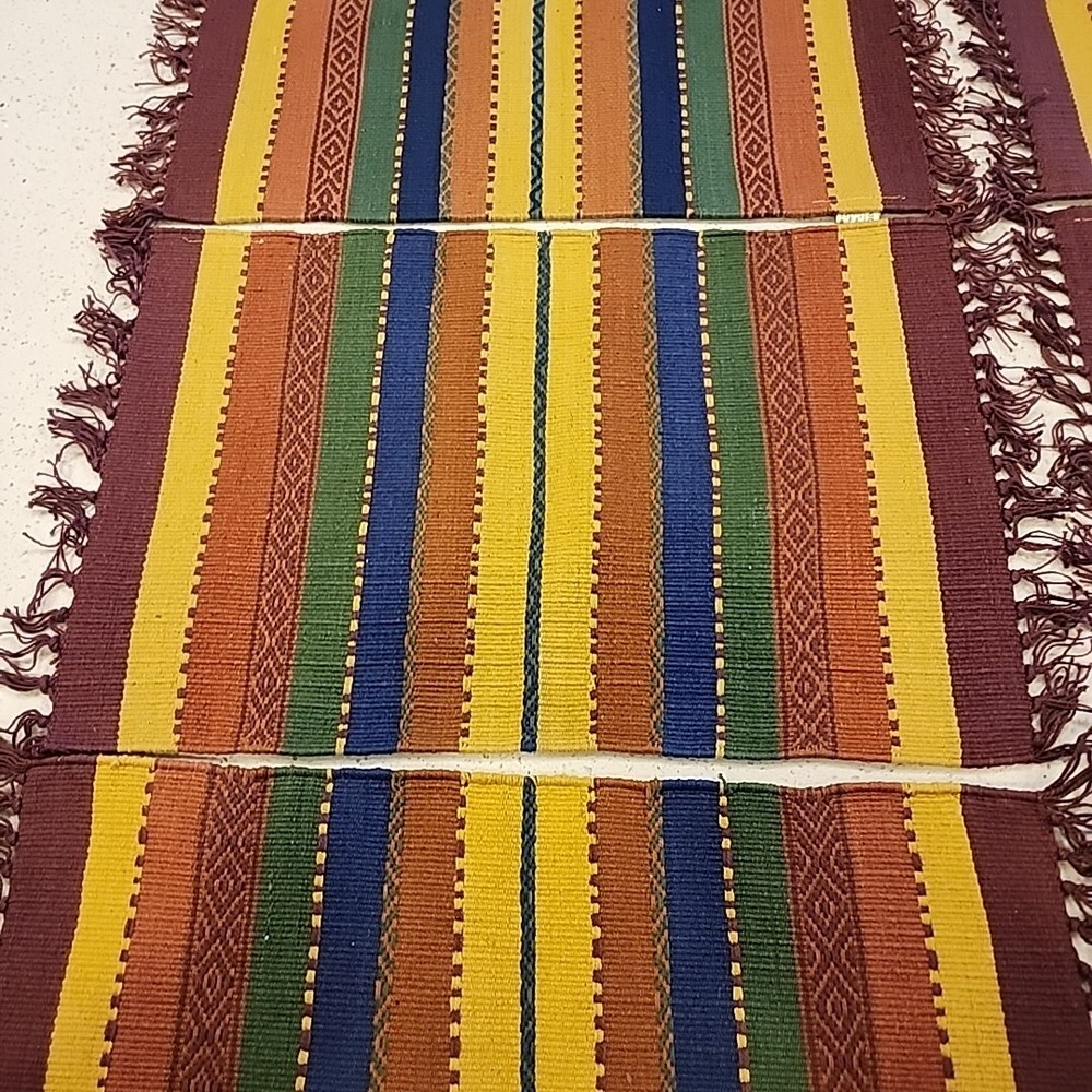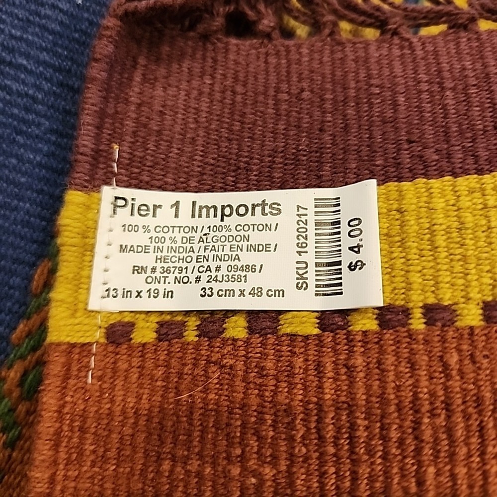 Add a touch of bohemian fashion to your dining table with this set of 8 Pier 1 Imports placemats. The multicolor striped pattern and fringed edges make them perfect for any occasion, whether it's a surprise birthday party or a casual family dinner. Measuring 19 inches in length and 13 inches in width, these rectangular placemats are made of 100% cotton and are woven for durability. Hand wash only and suitable for use in India, these placemats are a great addition to your collection. No stains or tears. Ships from a smoke-free home. Please ask any questions in advance. I combine shipping whenever possible to save you money. Thank you for your interest!