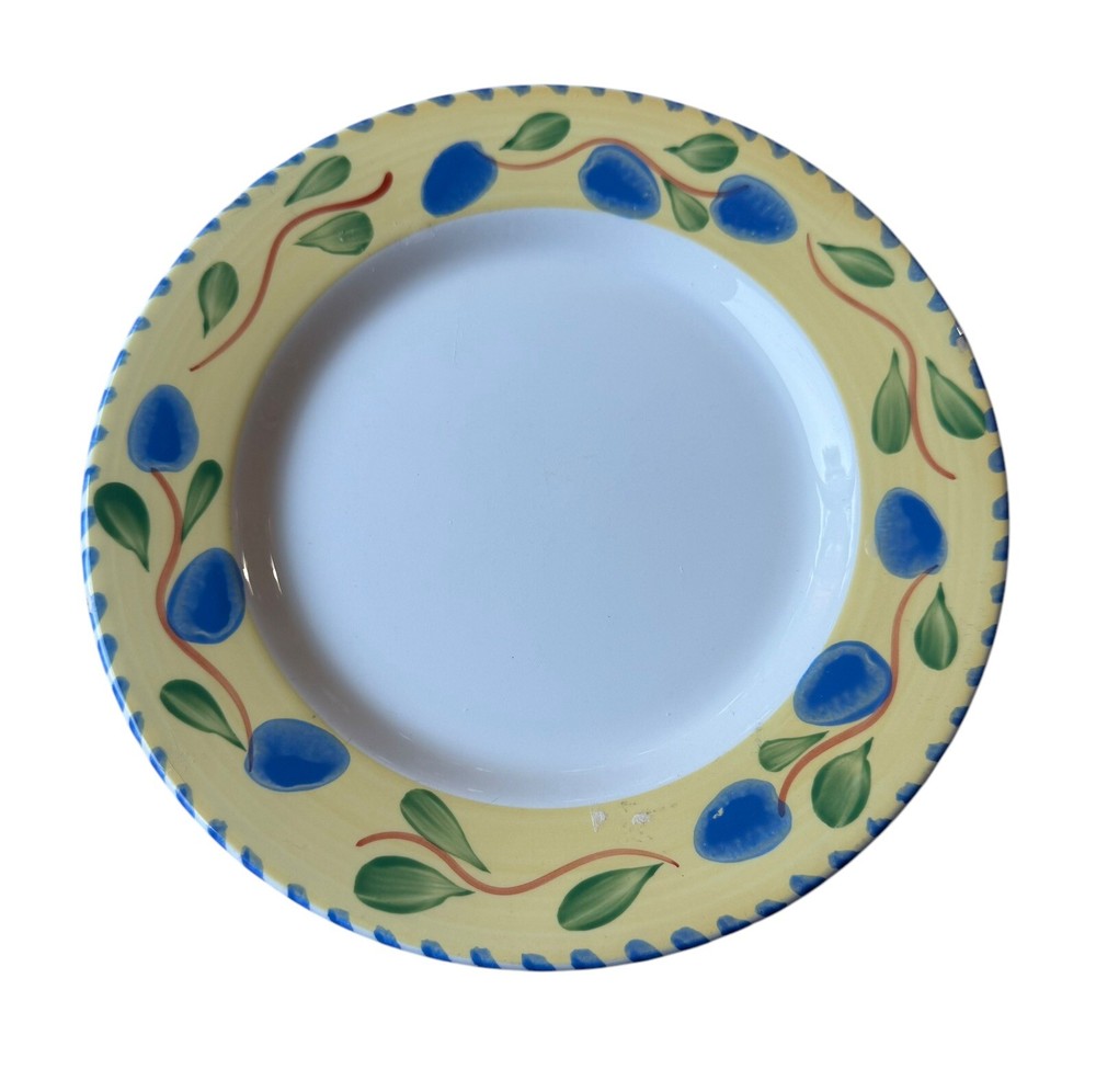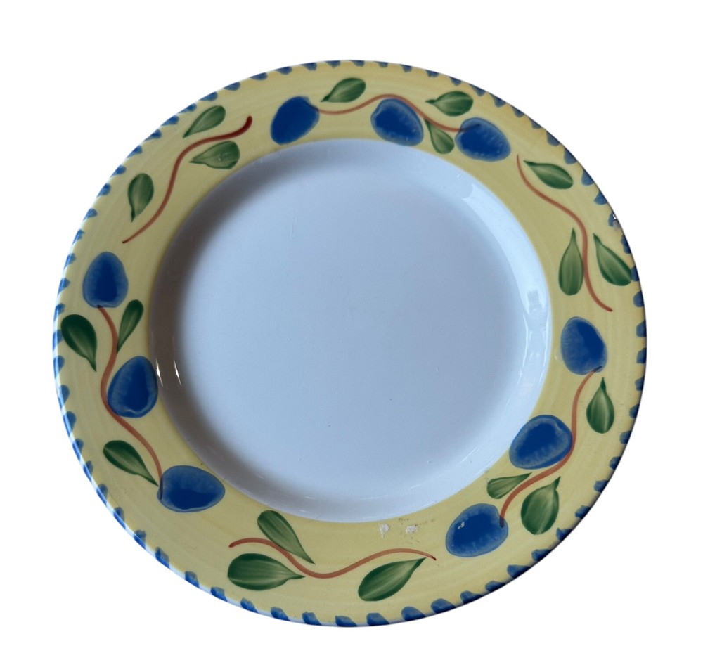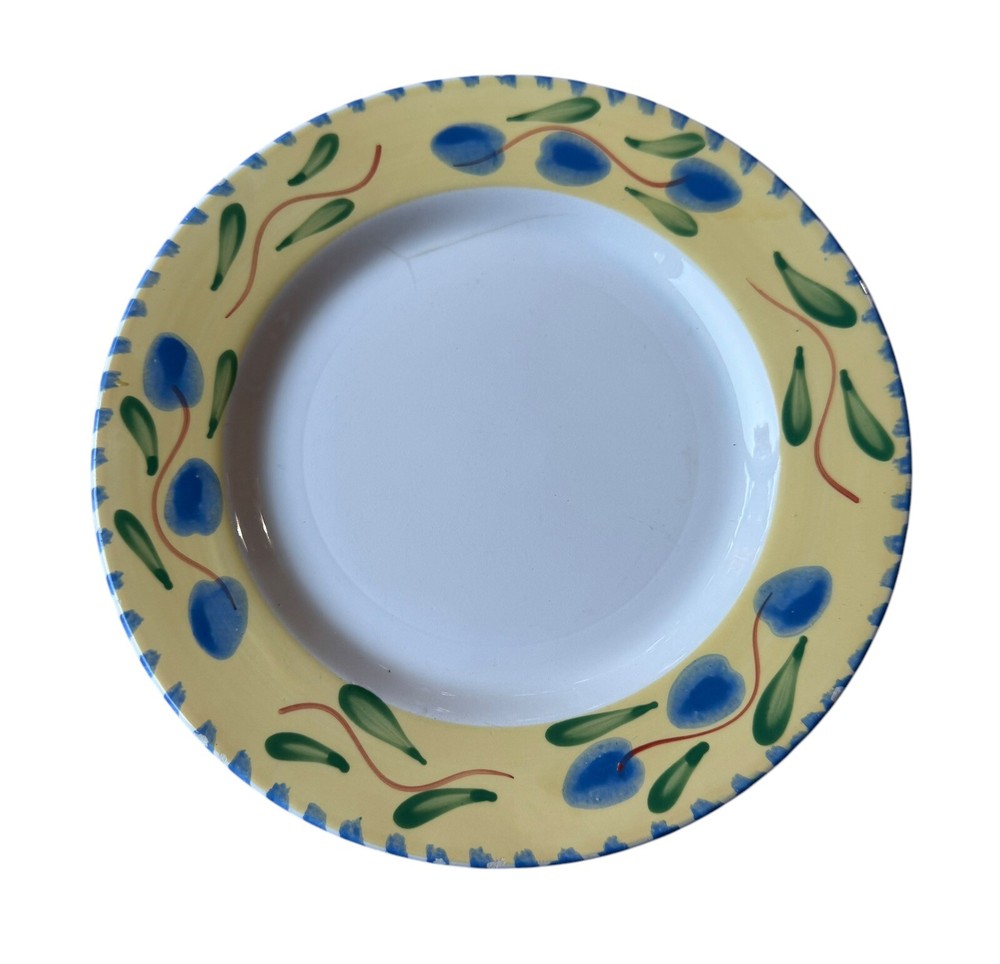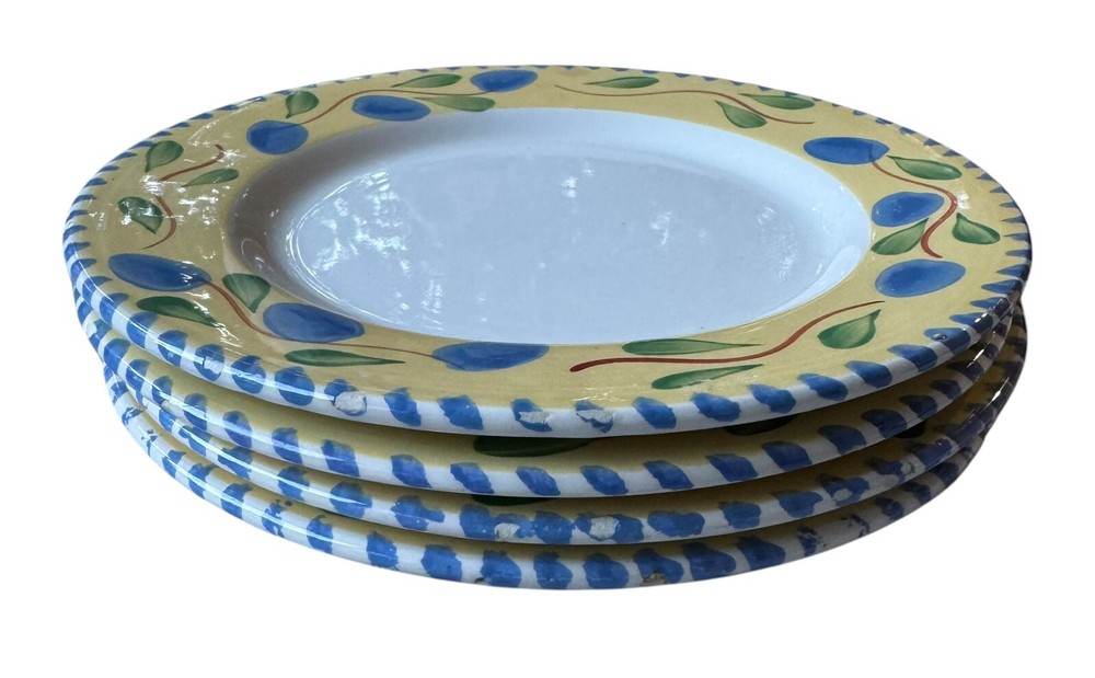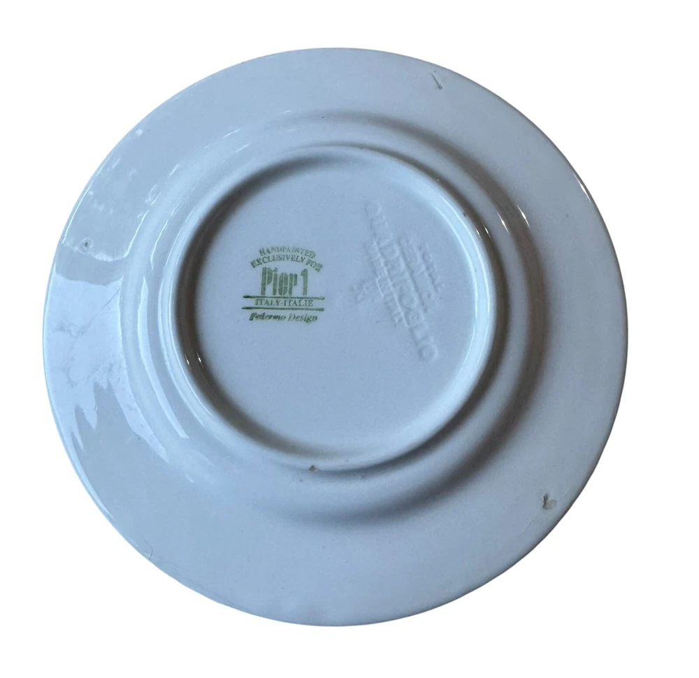 The edges of these plates have tiny surface abraisions. One has a small chip in the back side at the rim. From the top they all look good. Please refer to photos. This set includes four vintage Pier 1 Imports Palermo hand-painted dessert plates featuring a grape theme in yellow, blue, and green colors. They are handmade ceramic plates from Italy, with a round shape and a diameter of 8 inches. The set includes dessert and salad plates, each with a height of .75 inches and a weight of 10.4 oz. The plates are decorated with a Palermo design and are suitable for all occasions.