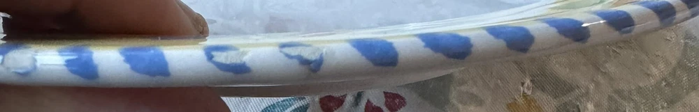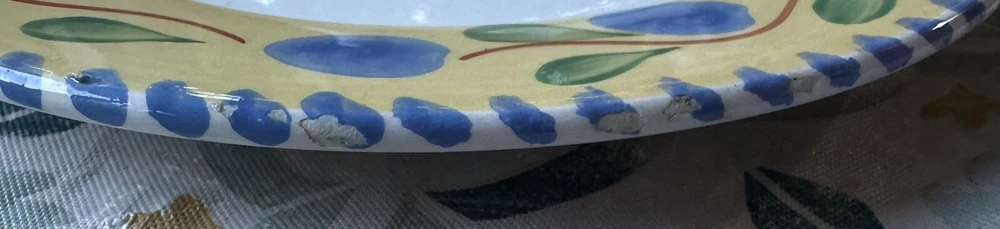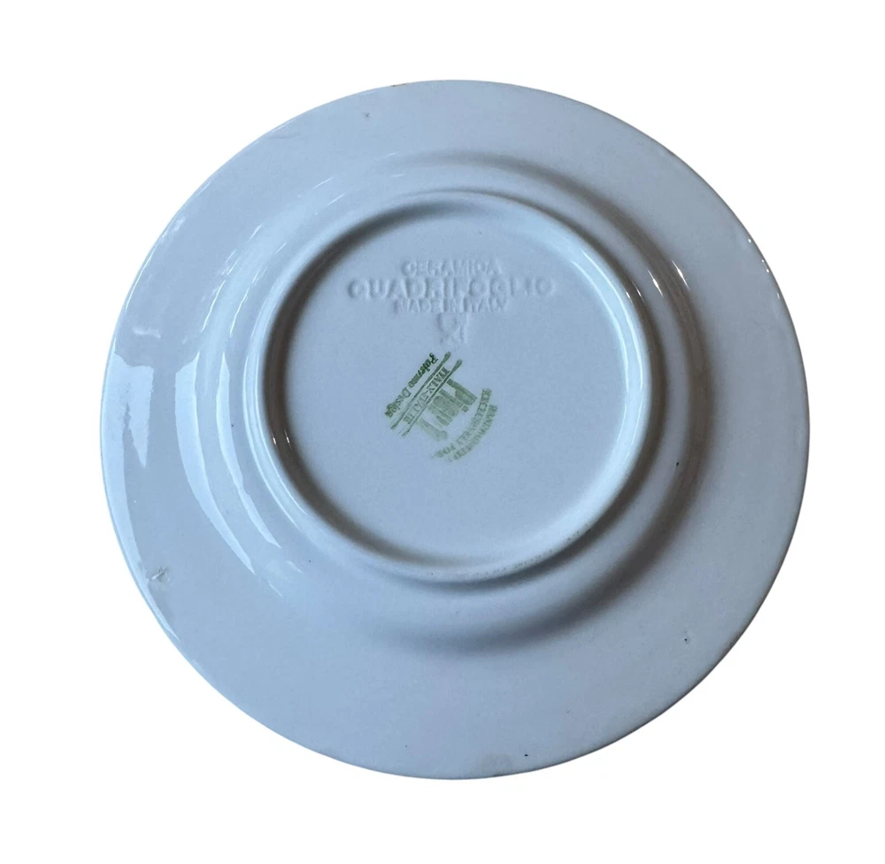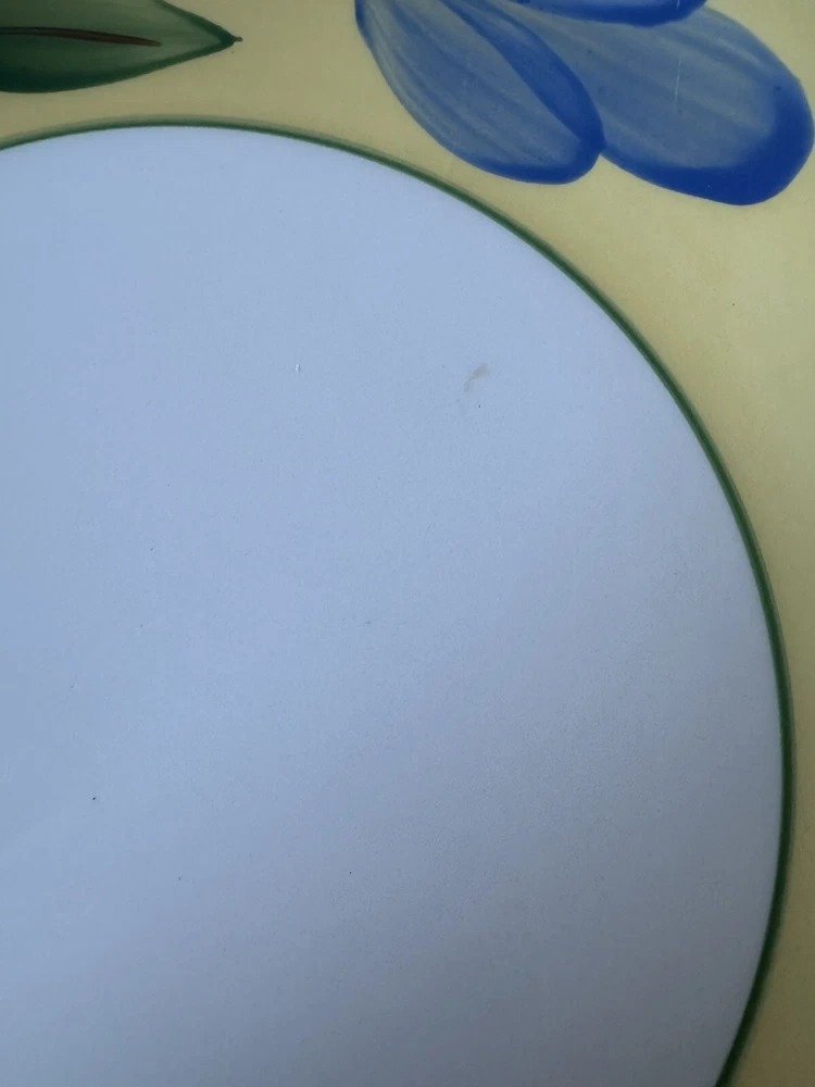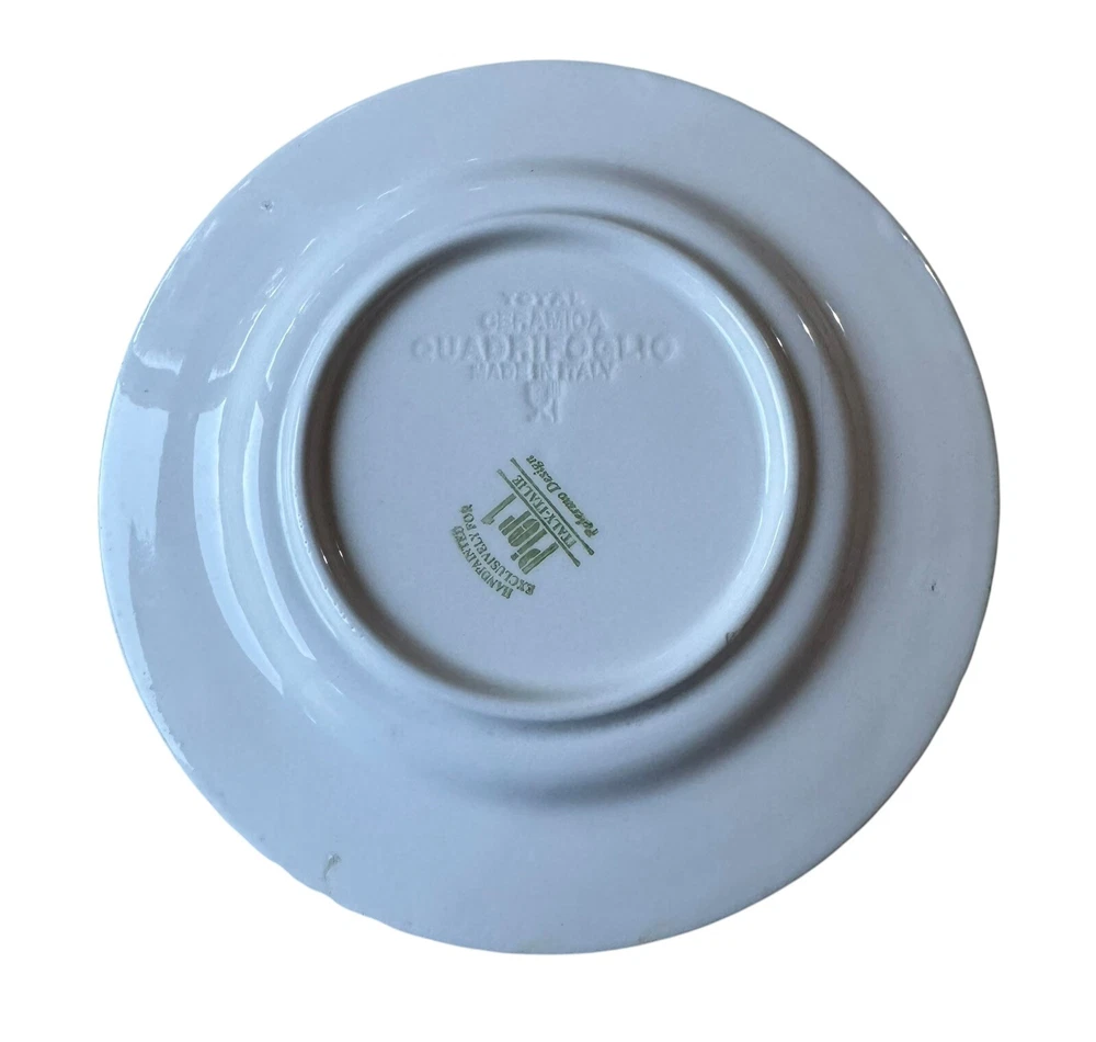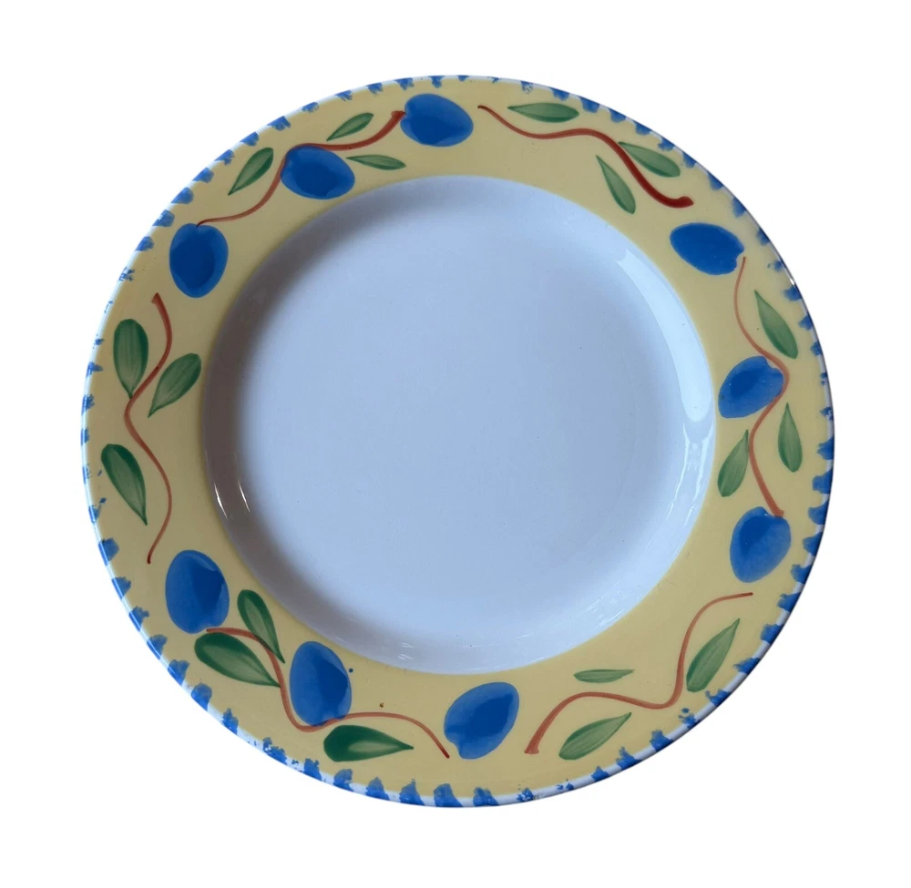 The edges of these plates have tiny surface abraisions. One has a small chip in the back side at the rim. From the top they all look good. Please refer to photos. This set includes four vintage Pier 1 Imports Palermo hand-painted dessert plates featuring a grape theme in yellow, blue, and green colors. They are handmade ceramic plates from Italy, with a round shape and a diameter of 8 inches. The set includes dessert and salad plates, each with a height of .75 inches and a weight of 10.4 oz. The plates are decorated with a Palermo design and are suitable for all occasions.