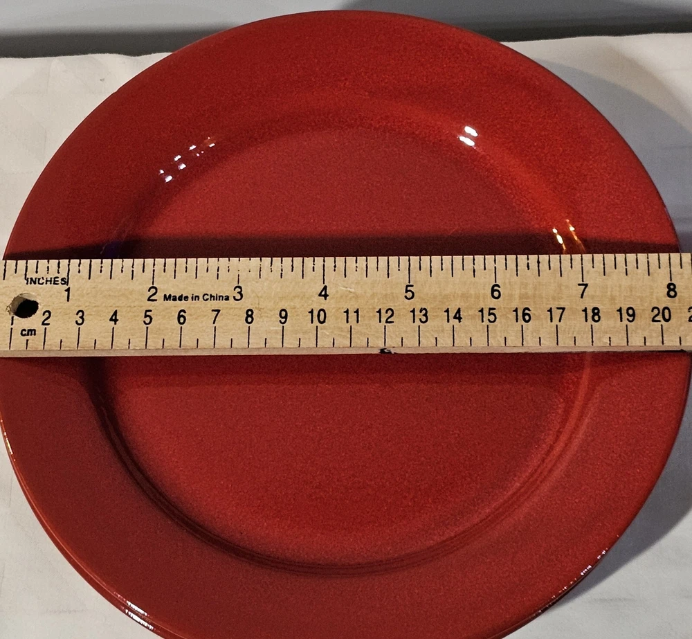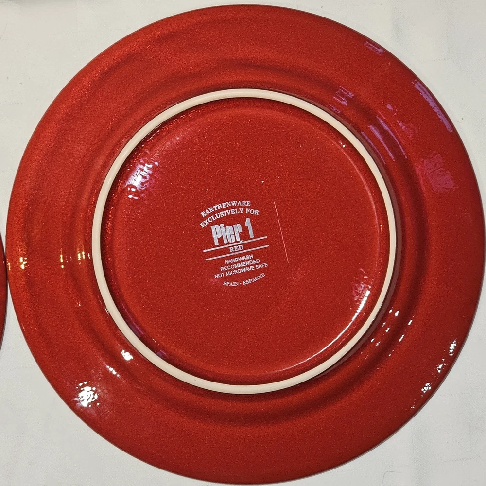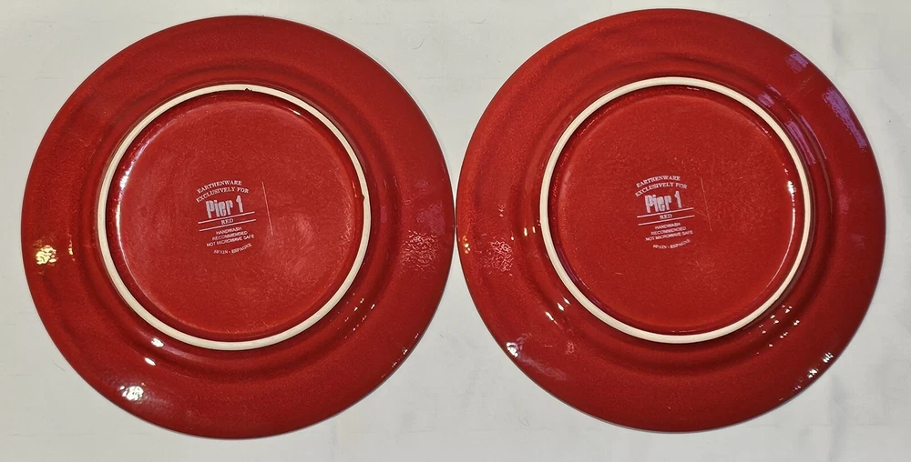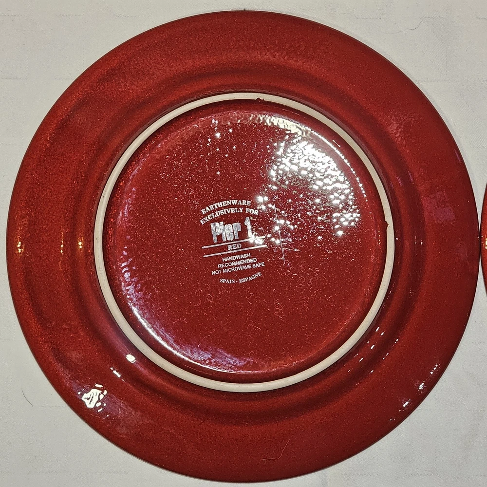 Pier 1 Imports "Pattern" RED Earthenware Salad Plate Spain Pier [Set Of 2] Add a pop of color to your table setting with this set of two round Pier 1 Imports Salad Plates. The plates are made of sturdy stoneware material with a contemporary red pattern that is perfect for all occasions. The 8" diameter plates are perfect for serving salads, desserts, and other small dishes.