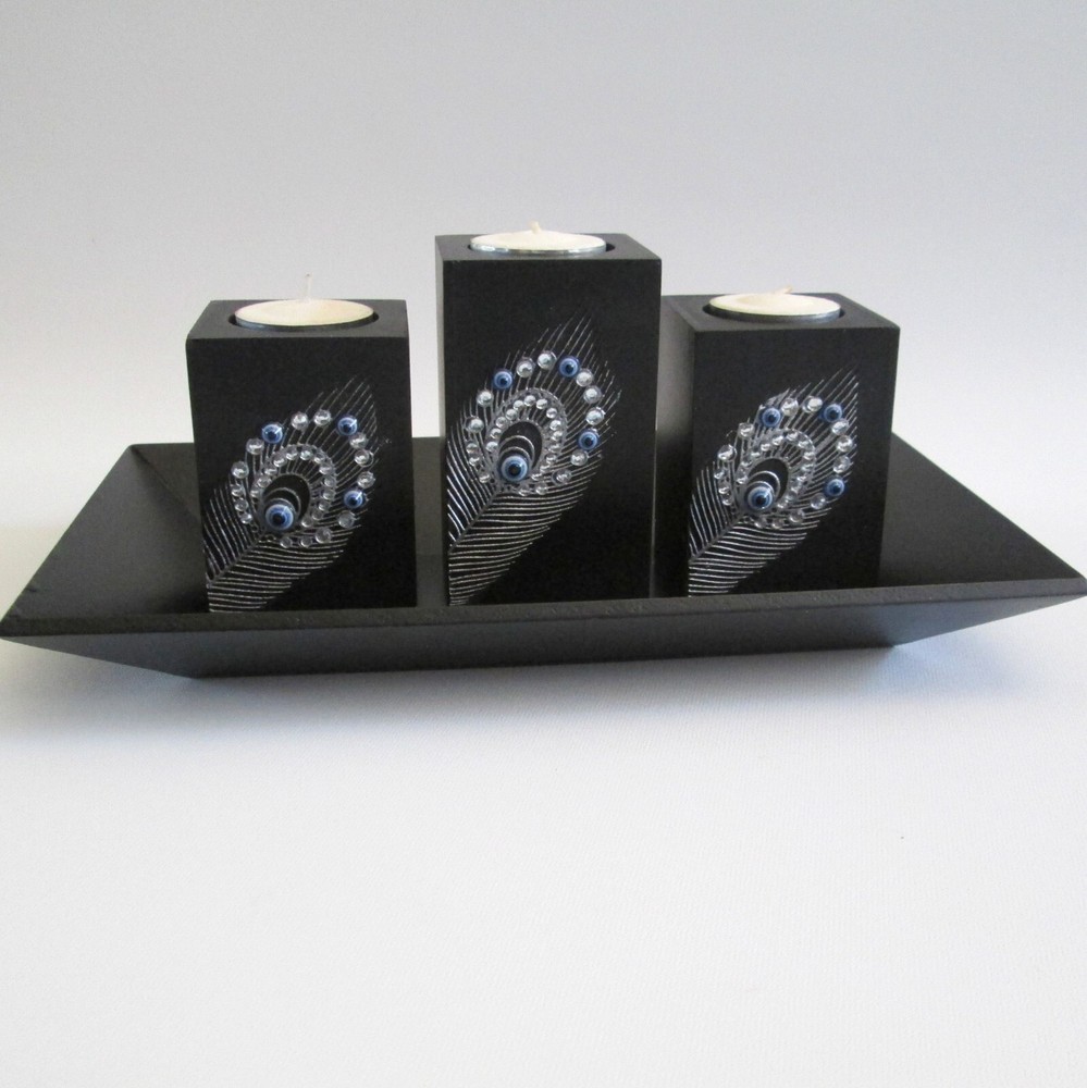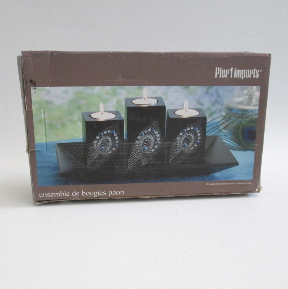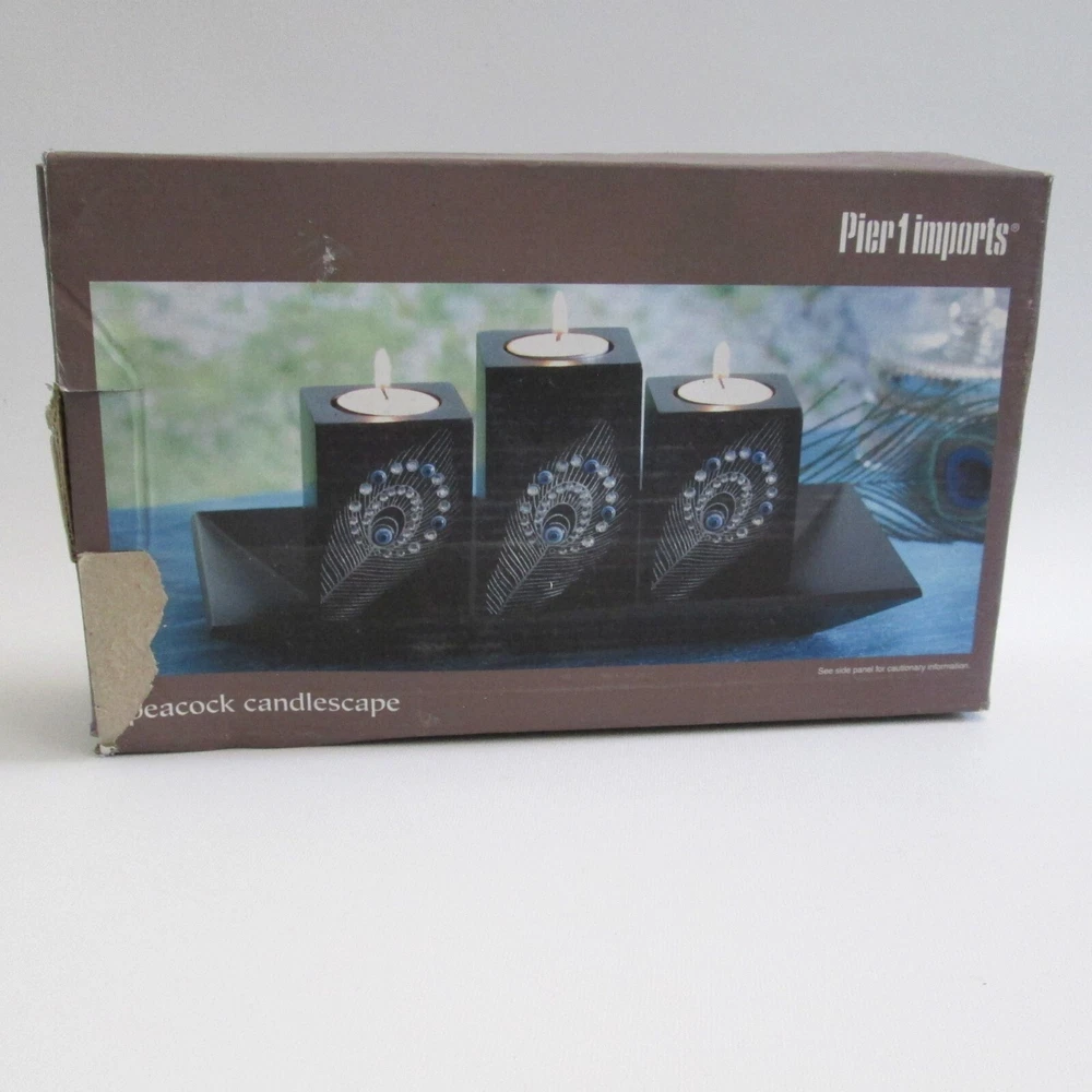 Pier 1 Imports Peacock Candlescape tea light candle holder. 3 wood holders with silver feather design and rhinestone bling. Holders measure between 3 1/2" - 4 1/2" tall. Tray measures 7" x 11". Chip on one corner, that's been touched up. Also, paint drips on edge of tray.