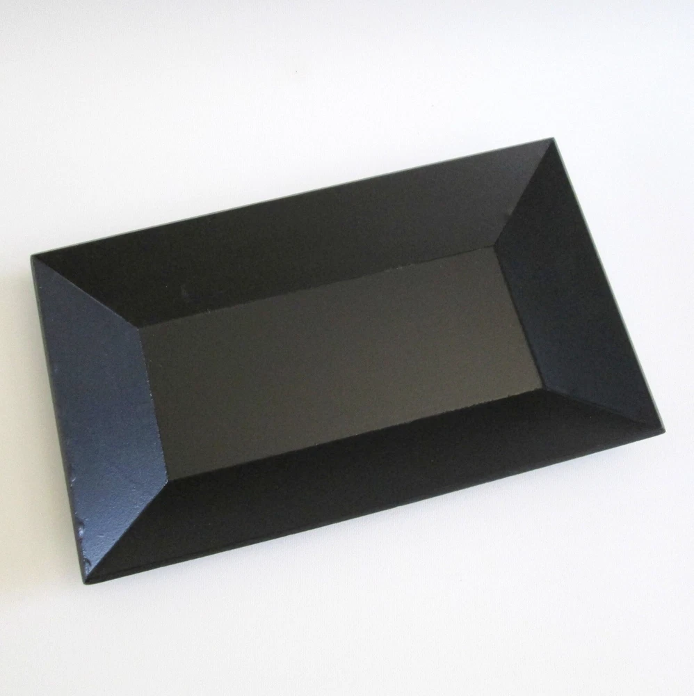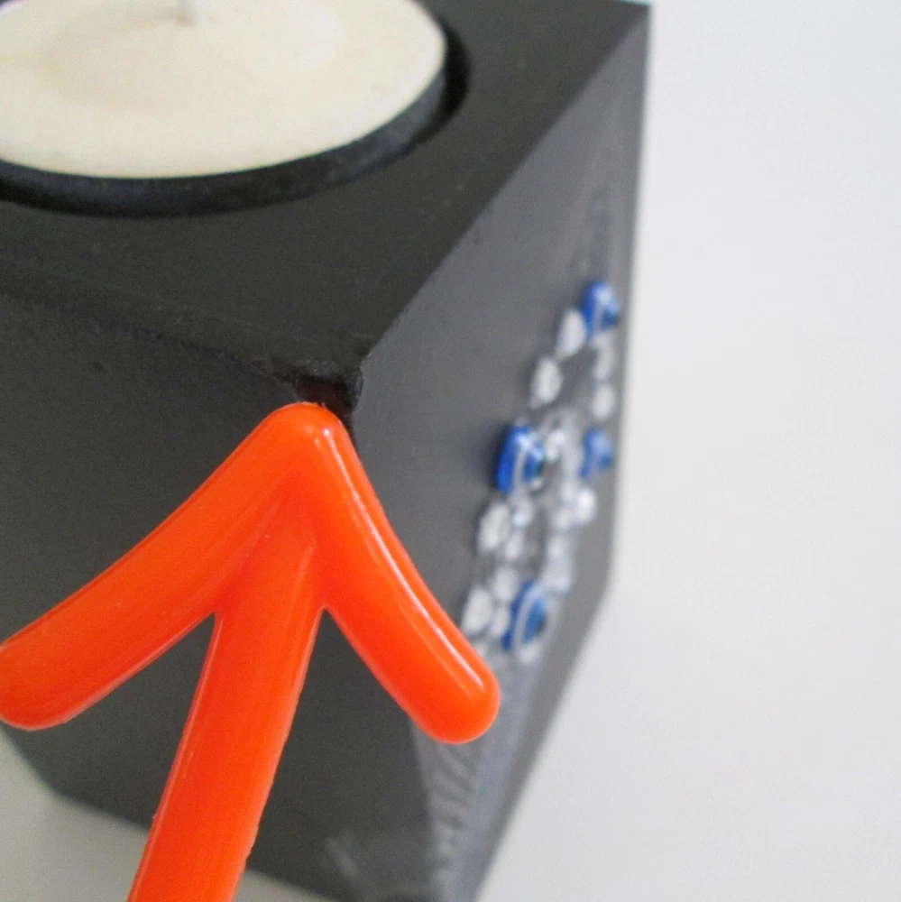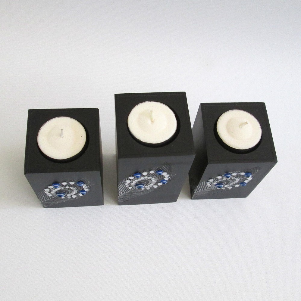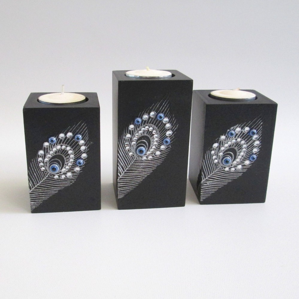 Pier 1 Imports Peacock Candlescape tea light candle holder. 3 wood holders with silver feather design and rhinestone bling. Holders measure between 3 1/2" - 4 1/2" tall. Tray measures 7" x 11". Chip on one corner, that's been touched up. Also, paint drips on edge of tray.