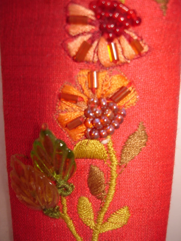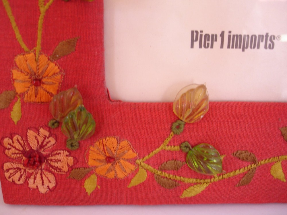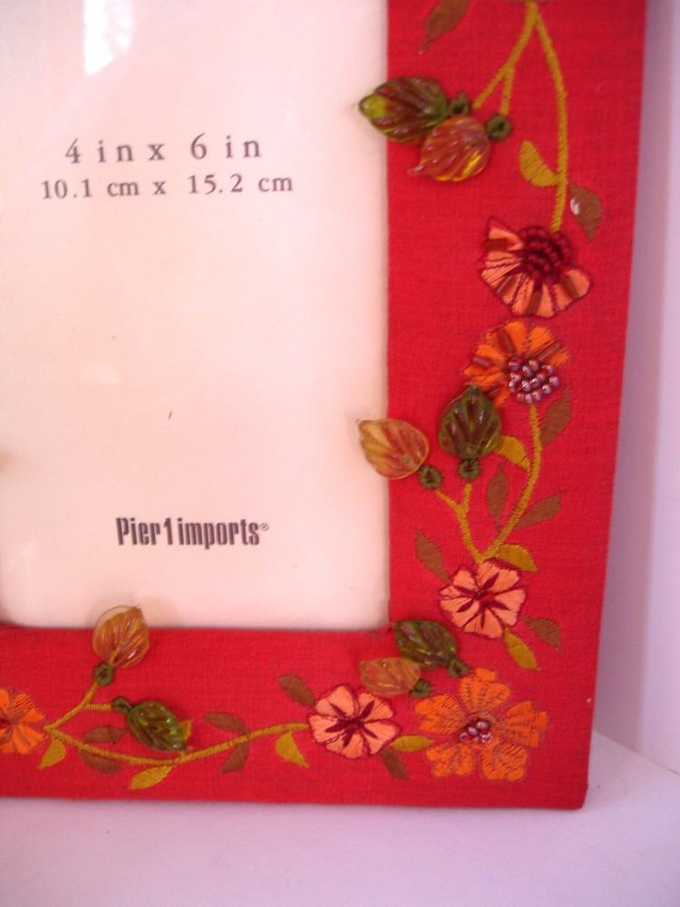 Pier 1 Imports Persimmon Red/Orange Satin Fabric Beaded & Embroidered Floral Design Seed beads on flowers with leaf shaped beads. 4"X6" Picture Frame Frame dimension is 7"x9" The clear glass front protects your photo while allowing a full view. Free-standing design makes it easy to display on any surface. Designed to fit a 3.5"x5" inch photo. The rear-loading feature allows for quick and easy photo insertion and removal. NO INTERNATIONAL SHIPPING Postage: As you may have heard USPS has raised shipping costs substantially. Delivery Confirmation and Tracking Included: I print my shipping labels through Ebay, so you can track your package right here on Ebay. Terms of sale: You are responsible for reading the description and all information contained in the listing, as well as looking at all pictures. There are no returns accepted.