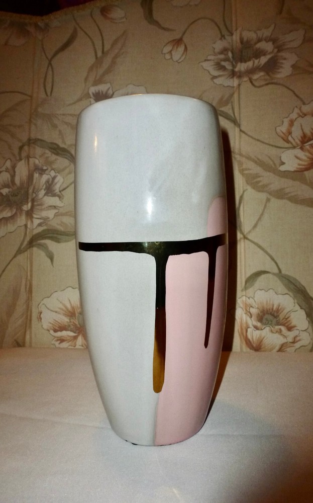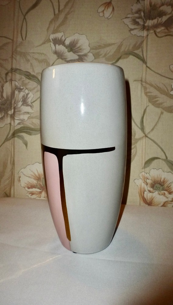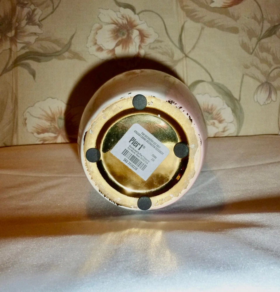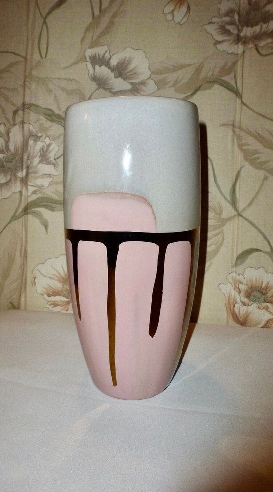 This is a Pier 1 Imports Pink and Gray 11" Ceramic Vase with Gold Drip Design - Retired. It is in very good, preowned condition. Came from a smoke free home. This item has not been thoroughly cleaned, merely wiped off with a soft, damp cloth. It is being sold just as it is shown. Please ask any questions prior to purchase. Please! If you're happy with your purchase, please remember that leaving feedback is super important to small sellers like myself. It's the best way for other shoppers to know how each transaction went, and it lets them know that I can be trusted to handle their items safely and efficiently. If there is a problem, please message me and I will do my best to correct the issue. I'd like everyone to be happy with their new treasures, and to shop with me again. Thank you! B-1