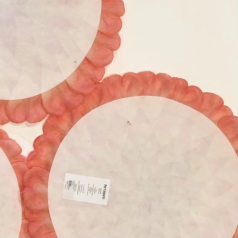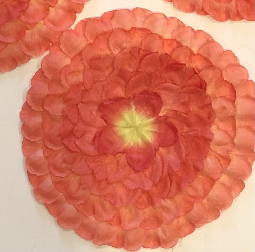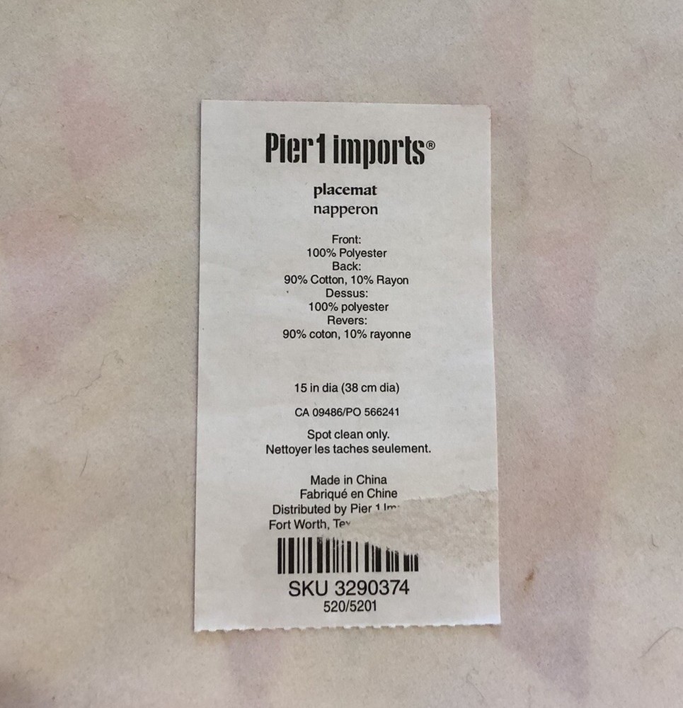 Pier 1 Imports Placemats Napperon Orange Flower Petal Fabric Backed Vintage, new old stock. Set of four vintage Pier 1 Imports Flower Petal Placemats in very good condition. These 15" diameter placemats have a fabric back with tags still attached. There are no stains or discolorations.