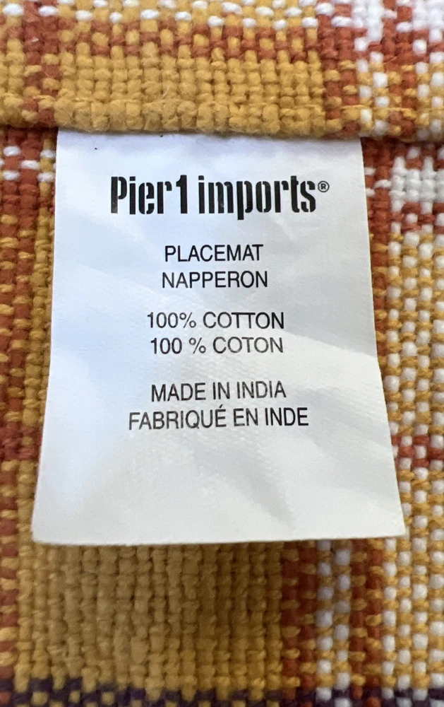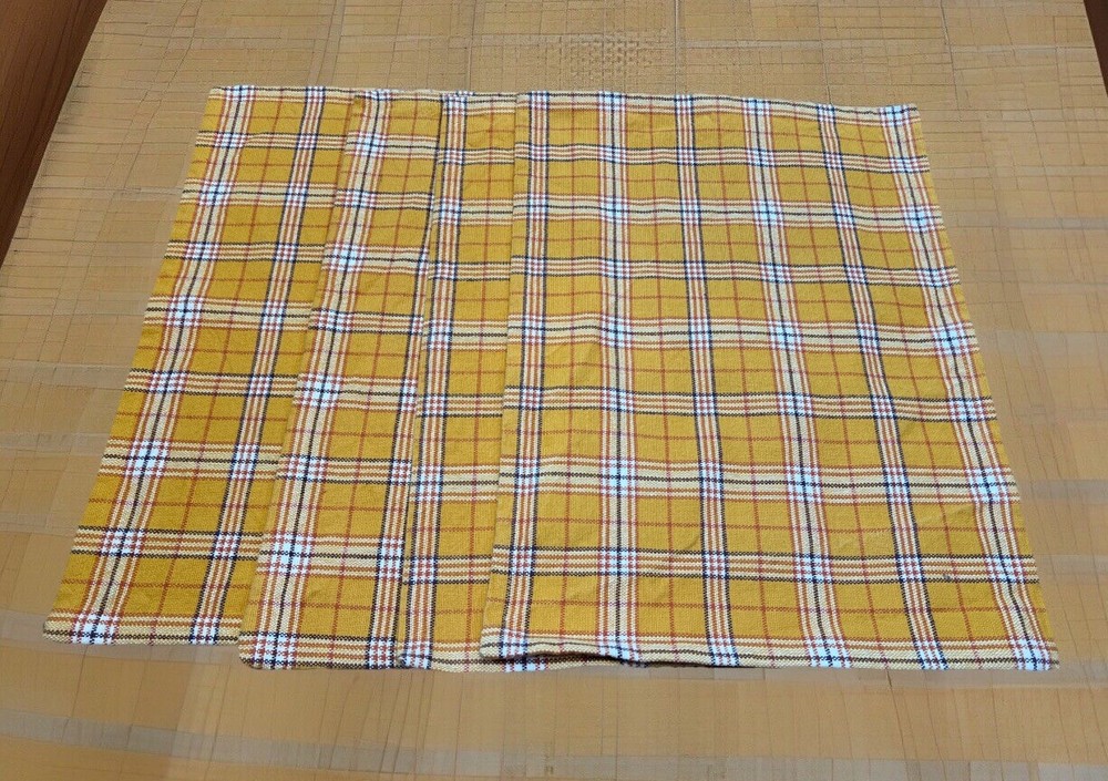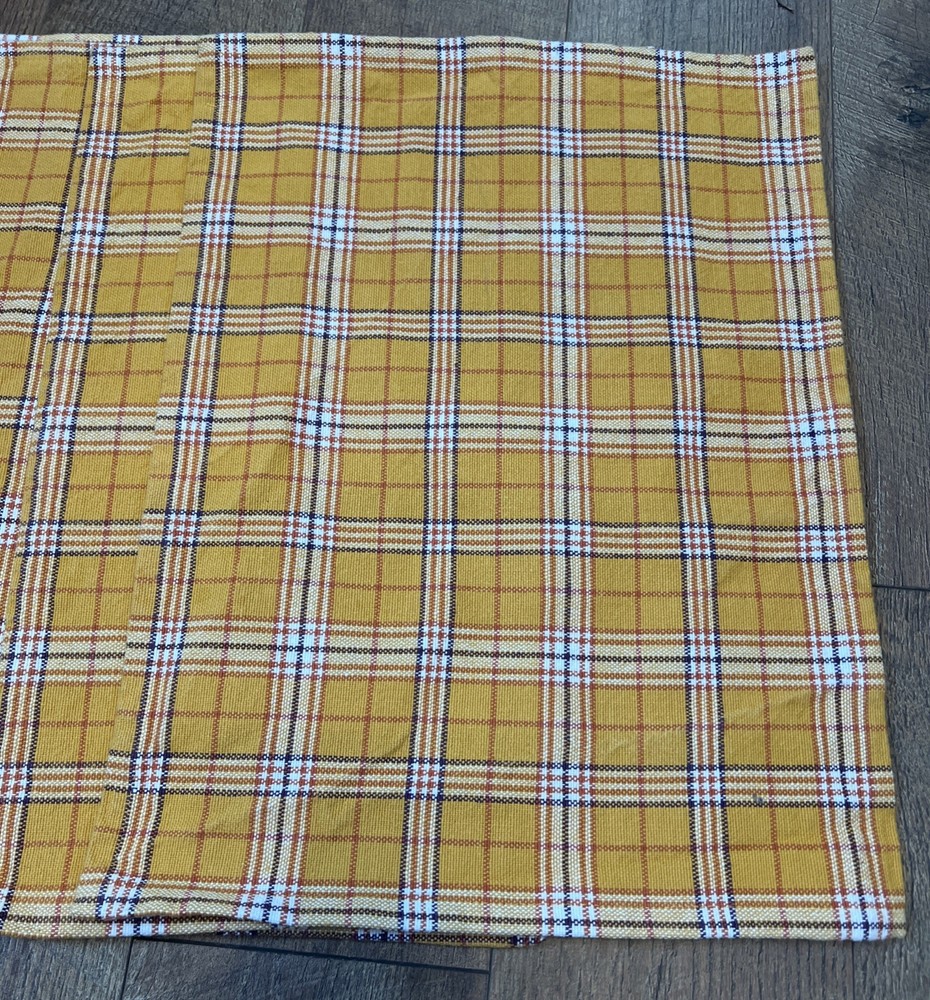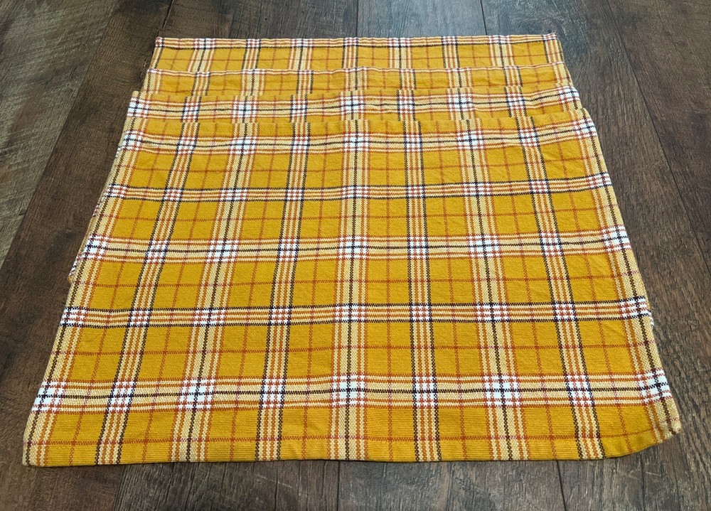 Set a four pier one yellow gold plaid placemat. Previously used. Very good condition clean no stains. Perfect for fall or farmhouse decor. Measurements are in the photos. 100% cotton.