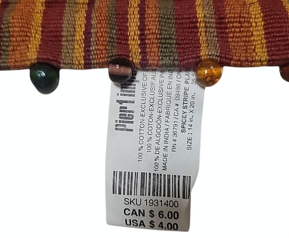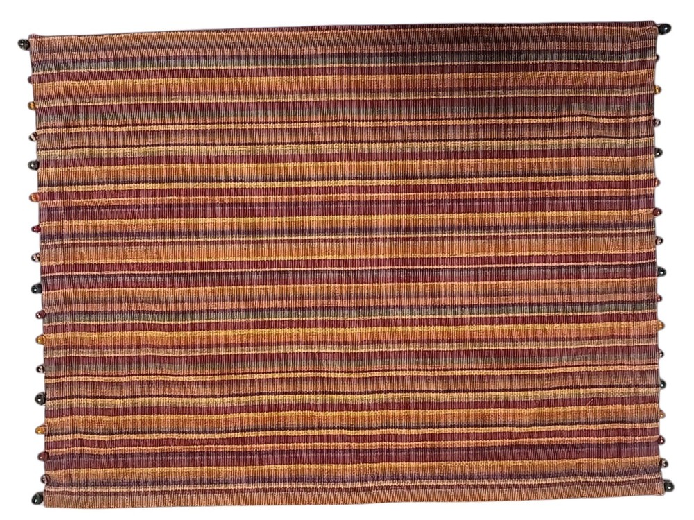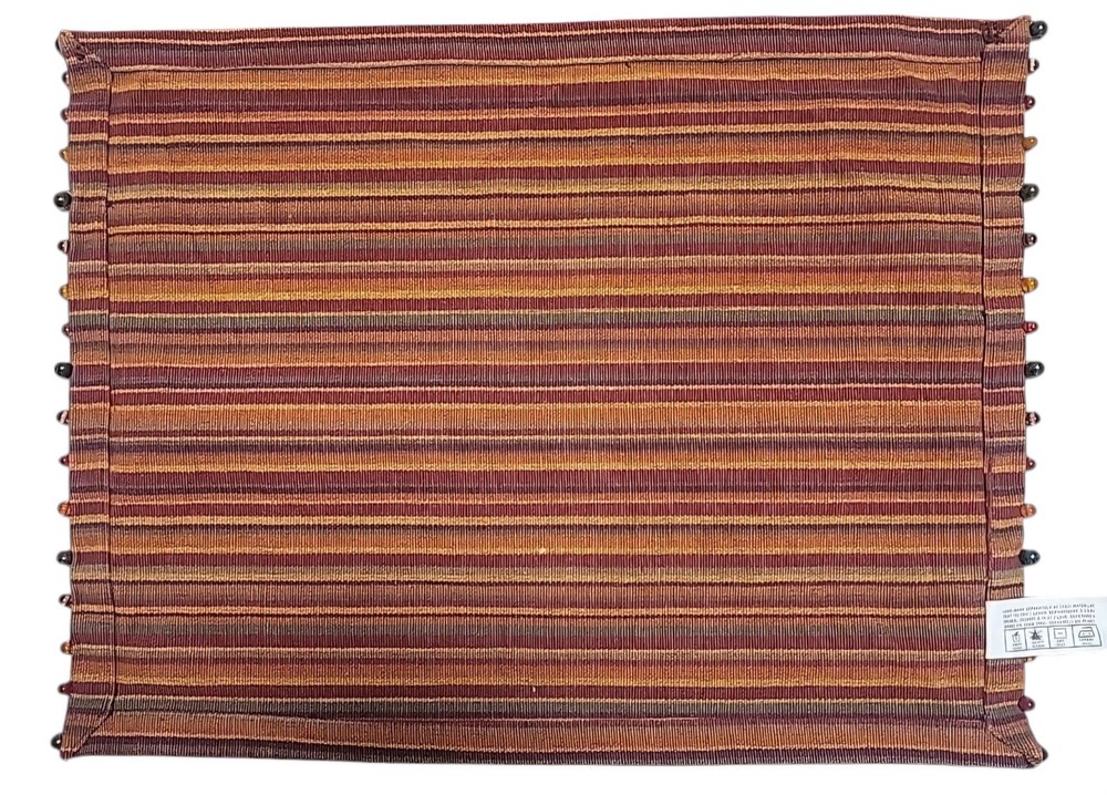 Add a touch of fall colors to your dining table with this set of 8 Pier One placemats. The striped pattern and beaded accent add a charming and elegant touch to any occasion. Made of 100% cotton, these rectangle placemats are perfect for any multipurpose use. Crafted with care, these placemats will enhance the look of your dining table and make your meals more enjoyable. The multicolor design is perfect for a fall-themed dining experience. Get your hands on this beautiful set of 8 Pier One placemats today!