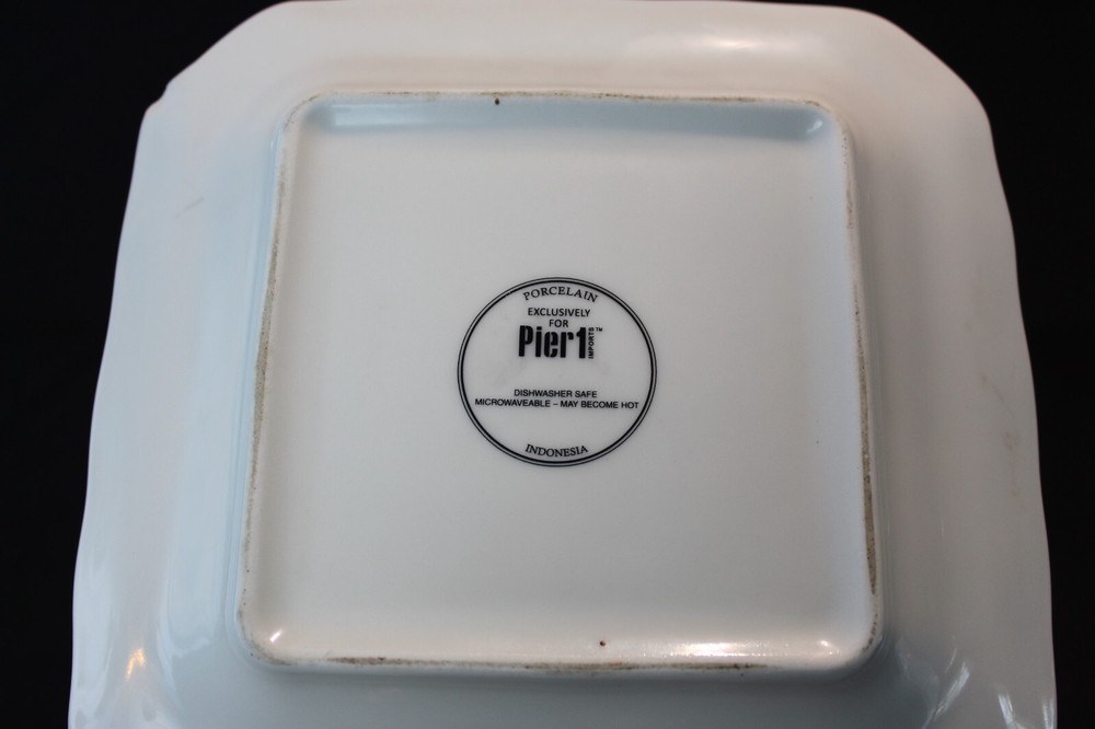 The Pier 1 Imports Adrianna Salad Plate is a square porcelain plate measuring 8.5 inches in length and width. It features a vibrant blue color with a glossy finish and a floral pattern adorned with butterflies and birds. The plate is from the 2010-2019 time period and bears a printed backstamp. Perfect for all occasions, this decorative piece adds a touch of elegance to any dining setting.