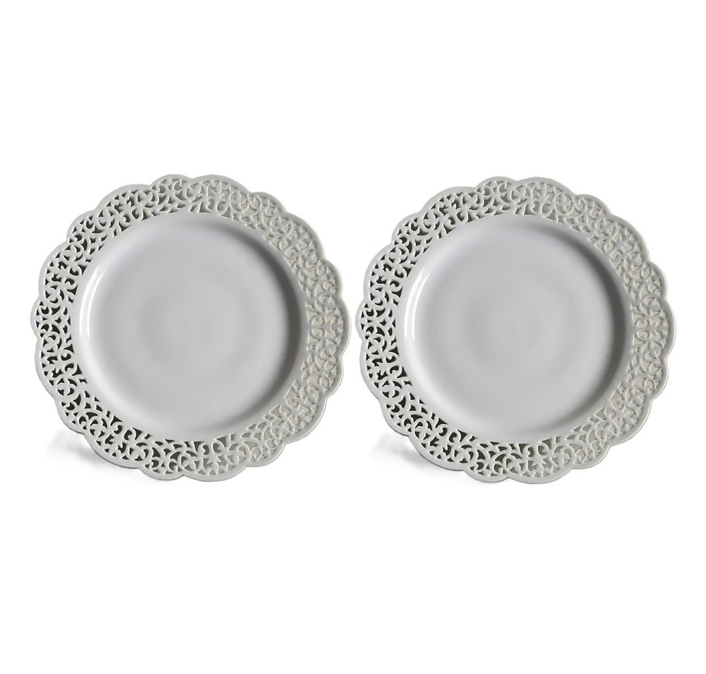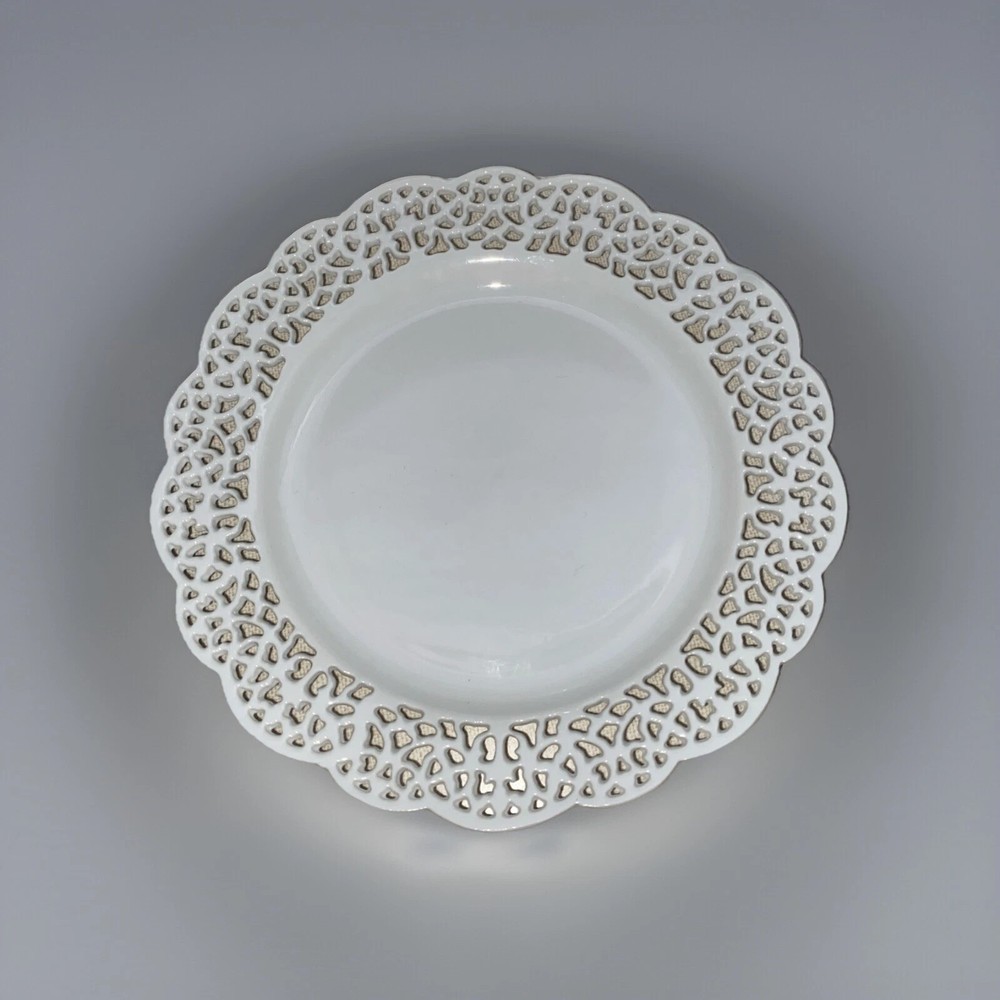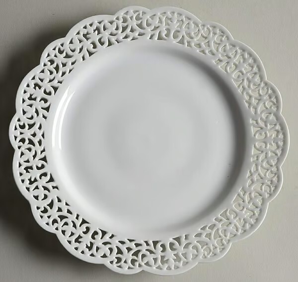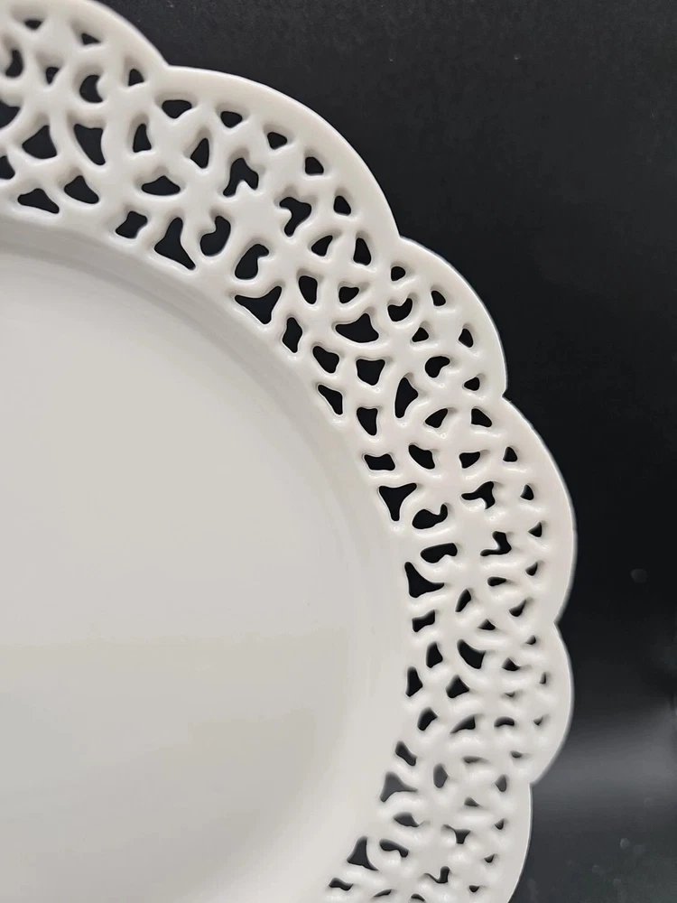 Elevate your dining experience with the Pier 1 Imports "Doily" lace design, reticulated salad/dessert plate. Crafted from high-quality porcelain, this round plate measures 7.5 inches in diameter, perfect for presenting appetizers, desserts or sides. The intricate lace detailing adds a touch of elegance to any table setting, suitable for all occasions. Whether you're hosting a formal dinner or enjoying a casual meal, this plate is a versatile addition to your dinnerware collection. One plate