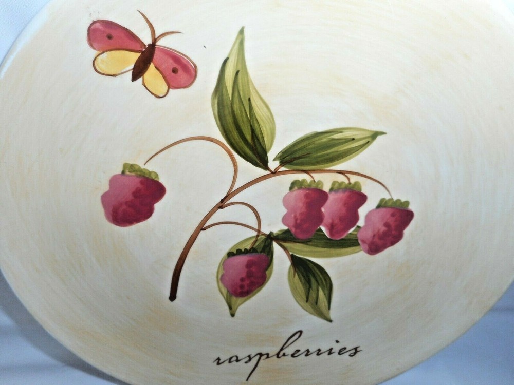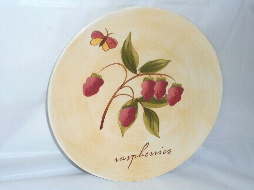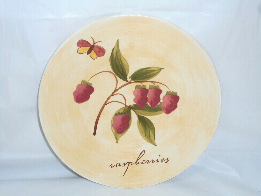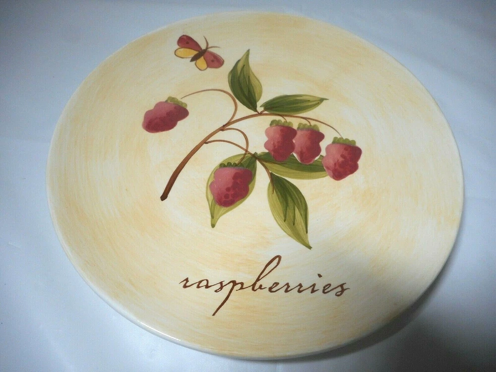 Pier 1 Imports Ceramic or Porcelain Provence Raspberries 7 3/4" plate. The design is bright and vivid. Nice shiny glossy finish. Thick and heavy. The image on the front of the plate shows a raspberry plant with ripe fruit, green leaves, brown stems. And an added feature is a cute burgundy, brown, and yellow butterfly. I do have 4 of these plates to offer. 3 are in perfect like brand new condition. ***There is 1 that has a tiny chip on the top rim. When you purchase the plate you will receive the perfect ones first. The last one sold will be that tiny chipped plate. *** Measures 7 3/4 inches in diameter x 3/4 inches tall