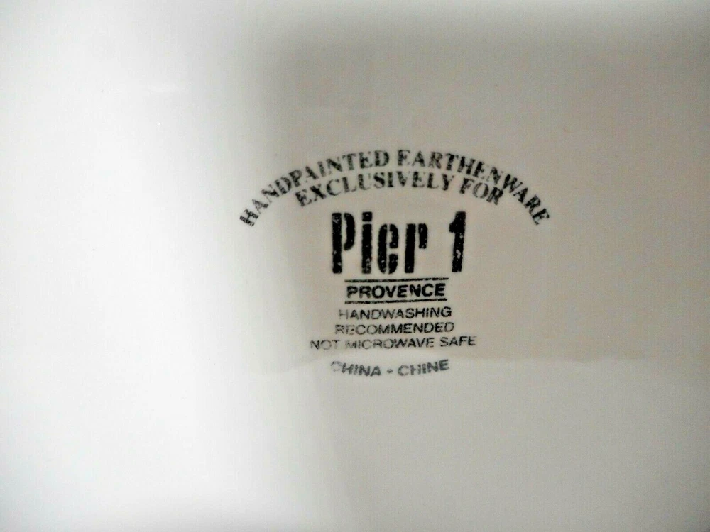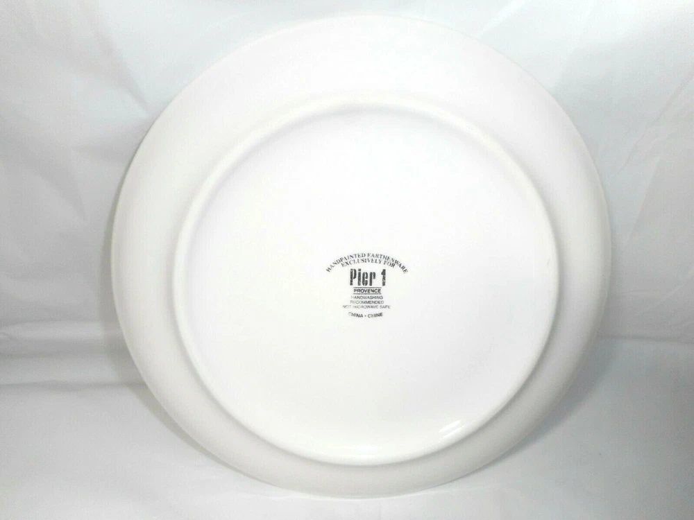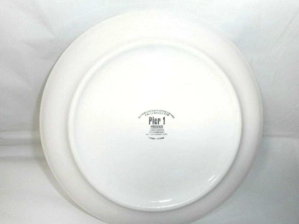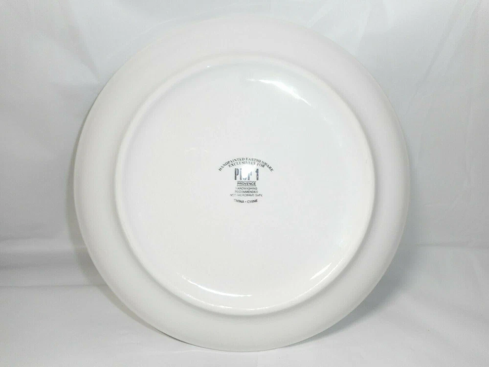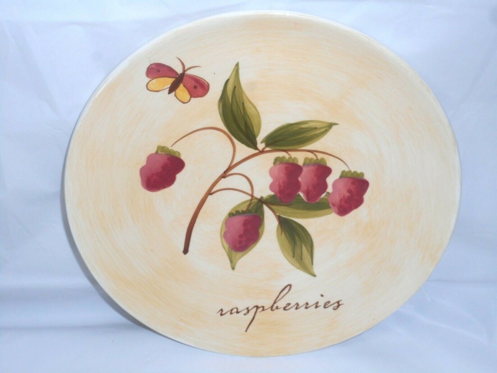 Pier 1 Imports Ceramic or Porcelain Provence Raspberries 7 3/4" plate. The design is bright and vivid. Nice shiny glossy finish. Thick and heavy. The image on the front of the plate shows a raspberry plant with ripe fruit, green leaves, brown stems. And an added feature is a cute burgundy, brown, and yellow butterfly. I do have 4 of these plates to offer. 3 are in perfect like brand new condition. ***There is 1 that has a tiny chip on the top rim. When you purchase the plate you will receive the perfect ones first. The last one sold will be that tiny chipped plate. *** Measures 7 3/4 inches in diameter x 3/4 inches tall