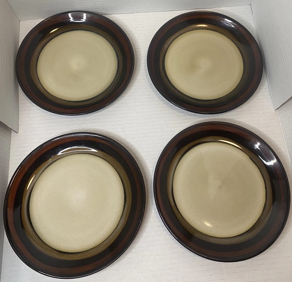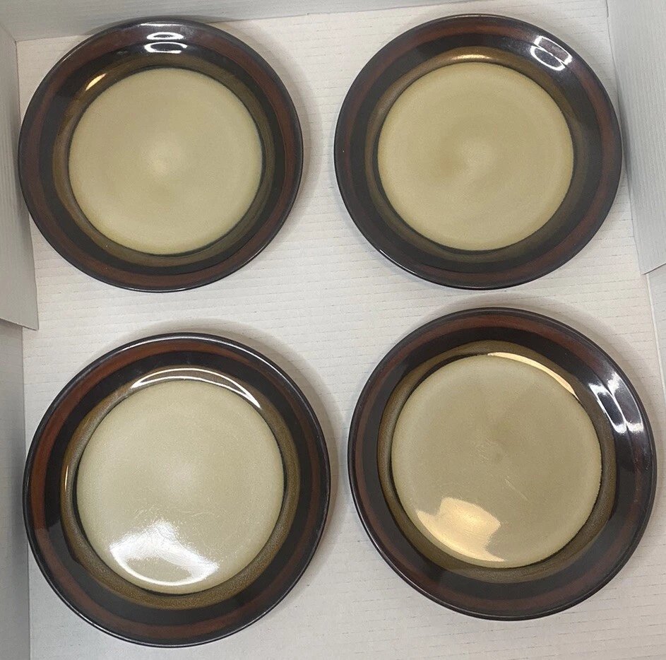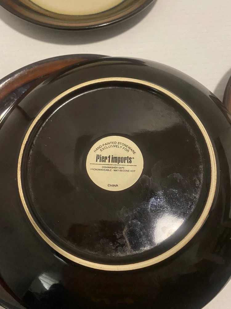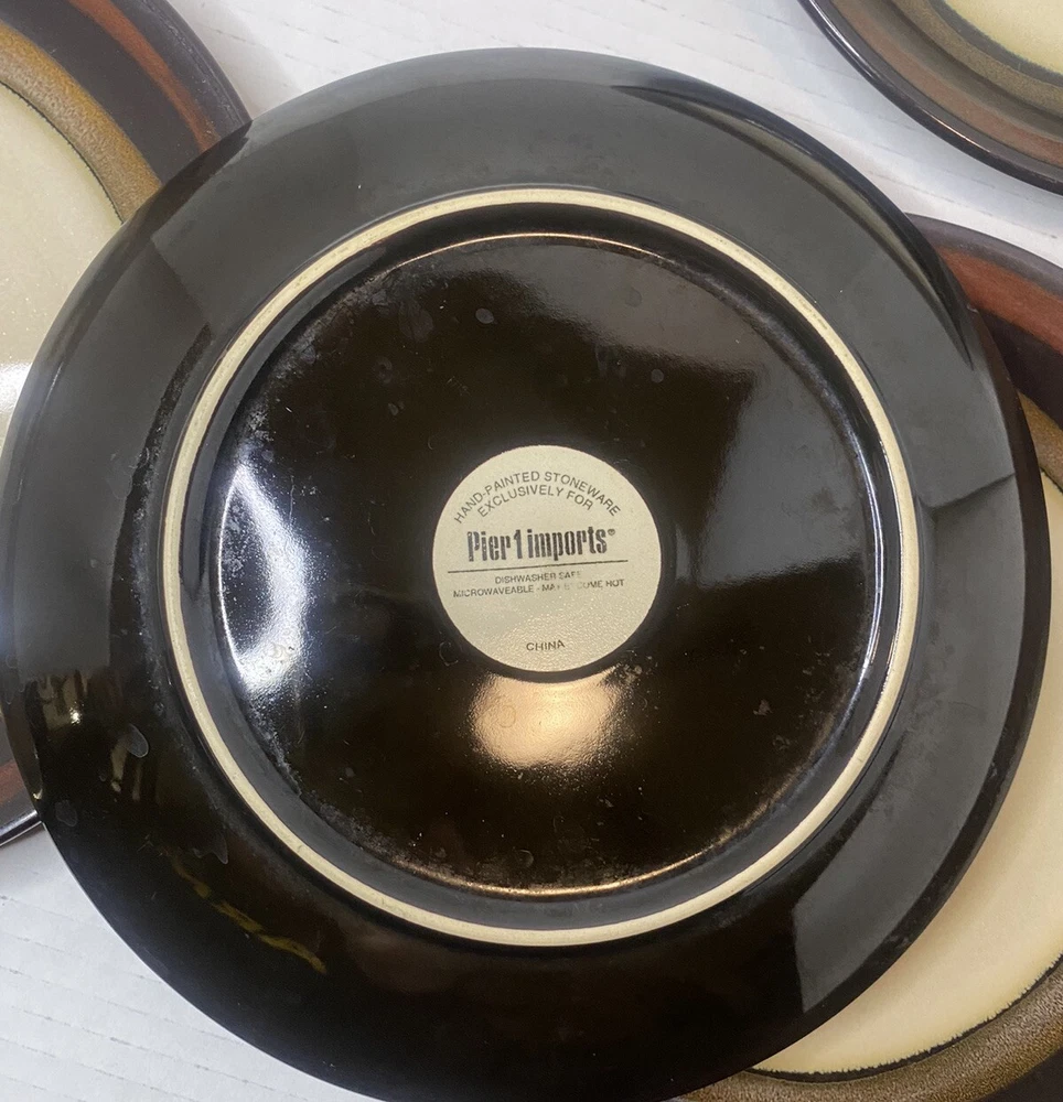 Add a touch of color to your dining table with this set of four Pier 1 Imports Reactive Stripe salad plates. The plates measure 8-1/4 inches in diameter and feature a hand-painted multicolor design on a shine finish. They are microwave and dishwasher safe, making them perfect for all occasions. The plates are made of stoneware and are an original production style of earthenware. The backstamp is printed, and the plates are not antique or licensed reproductions. They are perfect for any adult department and come from the Reactive Stripe product line. Order now and add a stylish touch to your dinnerware collection! 3