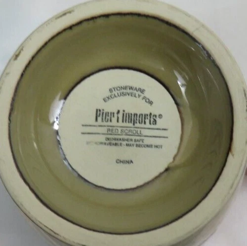 Today I have up for consideration a Pier 1 Imports Coffee Mug. This piece is 5" Tall and 4-1/8" in Diameter at the Rim. This piece is in the Red Scroll Pattern. This piece is Brown and Red with a Red Scroll Pattern. This piece holds 14 oz. To see similar items like this, check out our Store at the bottom of the page or Click "Visit Store" below our name on the right side of the page. Not all items show up in the E-Bay search! At DemiQ-Dishes-N-More we believe that our buyers deserve quality merchandise at a reasonable price, with all the information needed in order to make an inform decision! DemiQ-Dishes-N-More Offers next day shipping, Hassle Free returns & 100% satisfaction guarantee, so you can buy with confidence! We provide Replacement China, Dinnerware, Stoneware, Glass Ware, Collectibles & a wide Variety of other items. We hope you enjoy what you see & we hope to see you again soon! If you like what you see please add us to your list of favorite sellers. Thank you for your business! Package weight: 2 - lbs. Weight includes item(s). box, bubble wrap & packing materials. NOTE: I DO NOT set the shipping rate That is done By The USPS! Shipping cost is based on Location & weight of the package! PLEASE review the shipping cost BEFORE you buy!!!! I pack all fragile pieces well, however some pieces are VERY FRAGILE & I have no control on how packages are handled after they leave my possession, if something does break during delivery, I will request pictures of the broken item (s) before I will offer a refund. Positive feedback is sent as soon as positive feedback is received! Thank you for your time & Purchase!