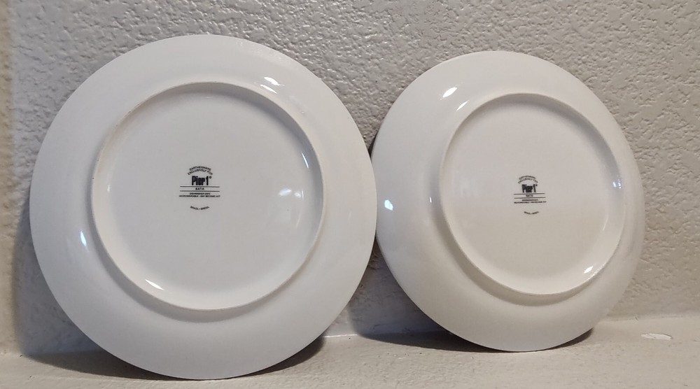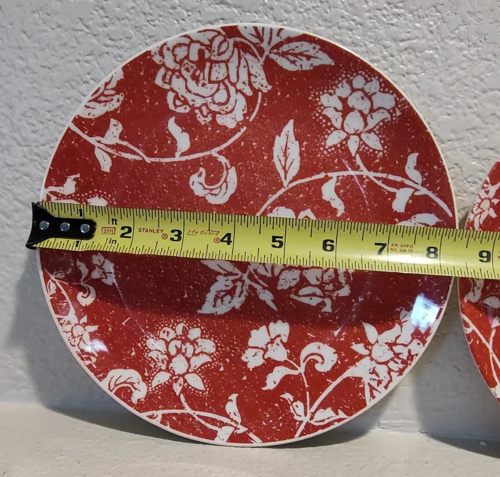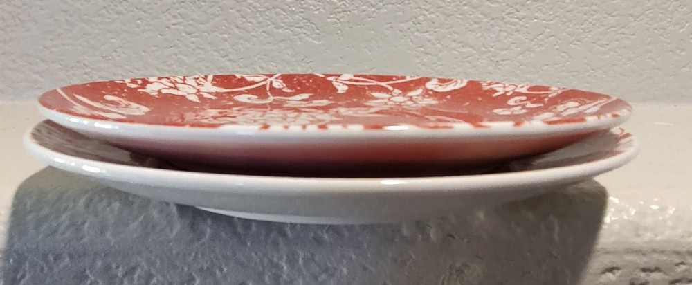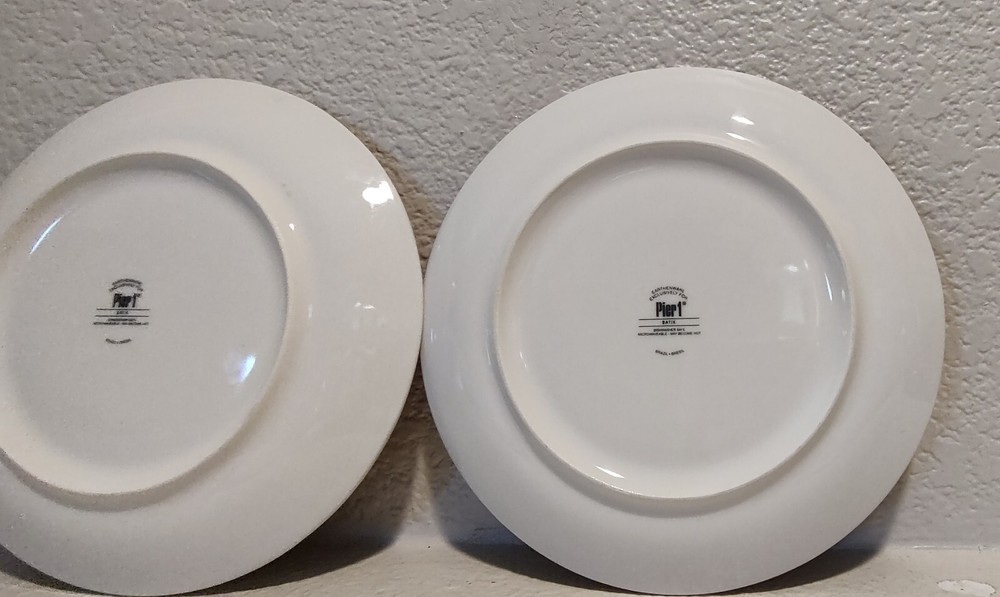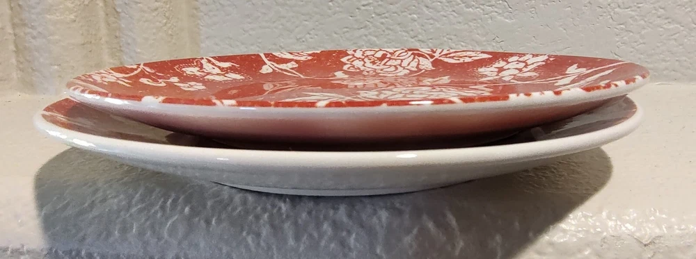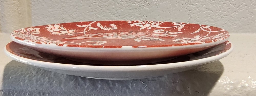 Elevate your dining experience with the chic elegance of Pier 1 Imports Floral Batik Luncheon Dessert Plates. The classic white base is beautifully adorned with a red floral pattern, creating a striking contrast that is sure to complement any table setting. These plates are crafted from high-quality glass and earthenware, promising durability and a touch of sophistication to your meals. Each plate in this set of two showcases the exquisite pottery production technique, reflecting the craftsmanship of Brazilian artisans. The backstamp is printed, confirming the authenticity of the product. Whether for a special occasion or everyday use, these luncheon and dessert plates are a tasteful addition to your dinnerware collection.