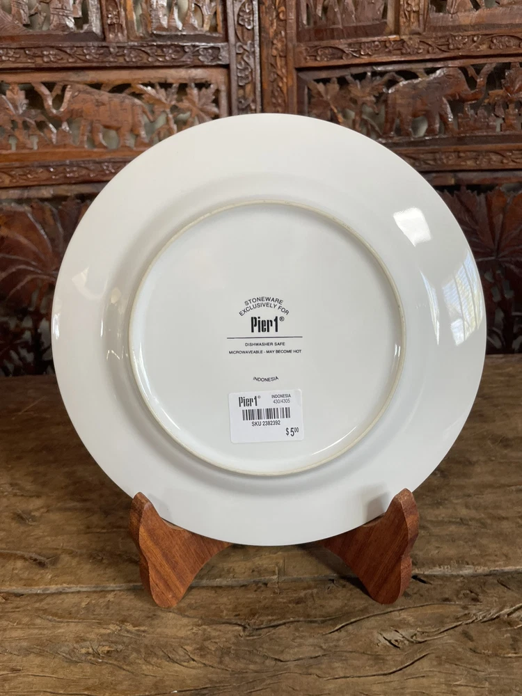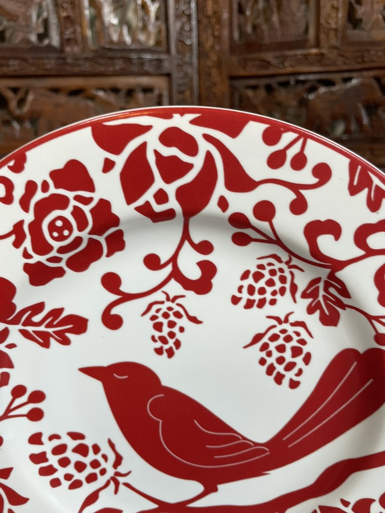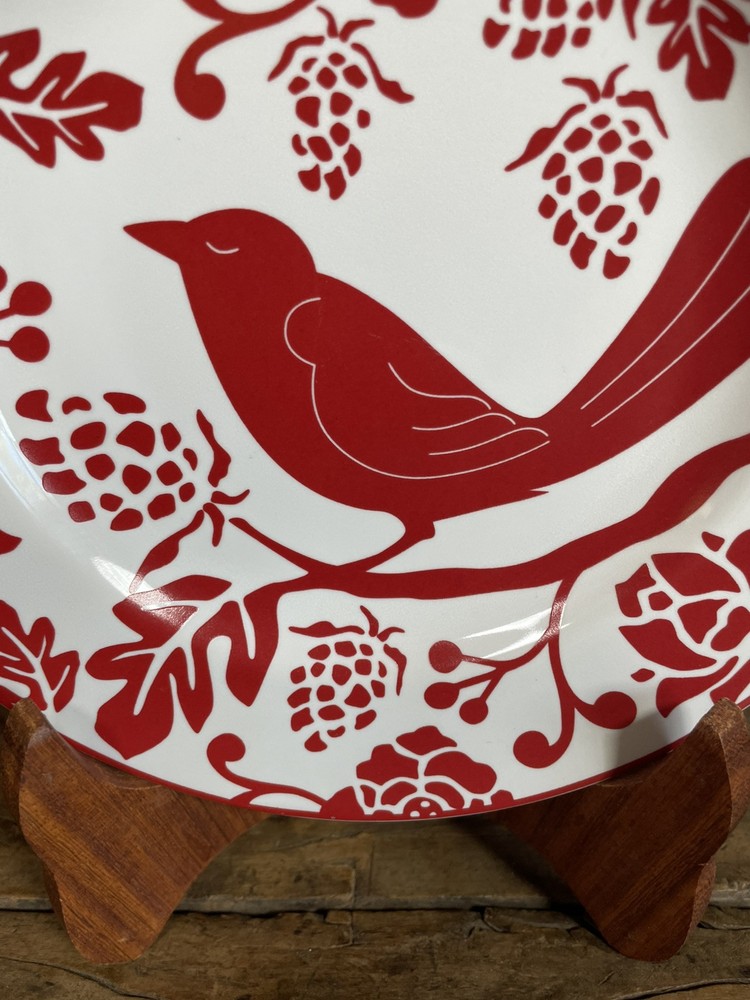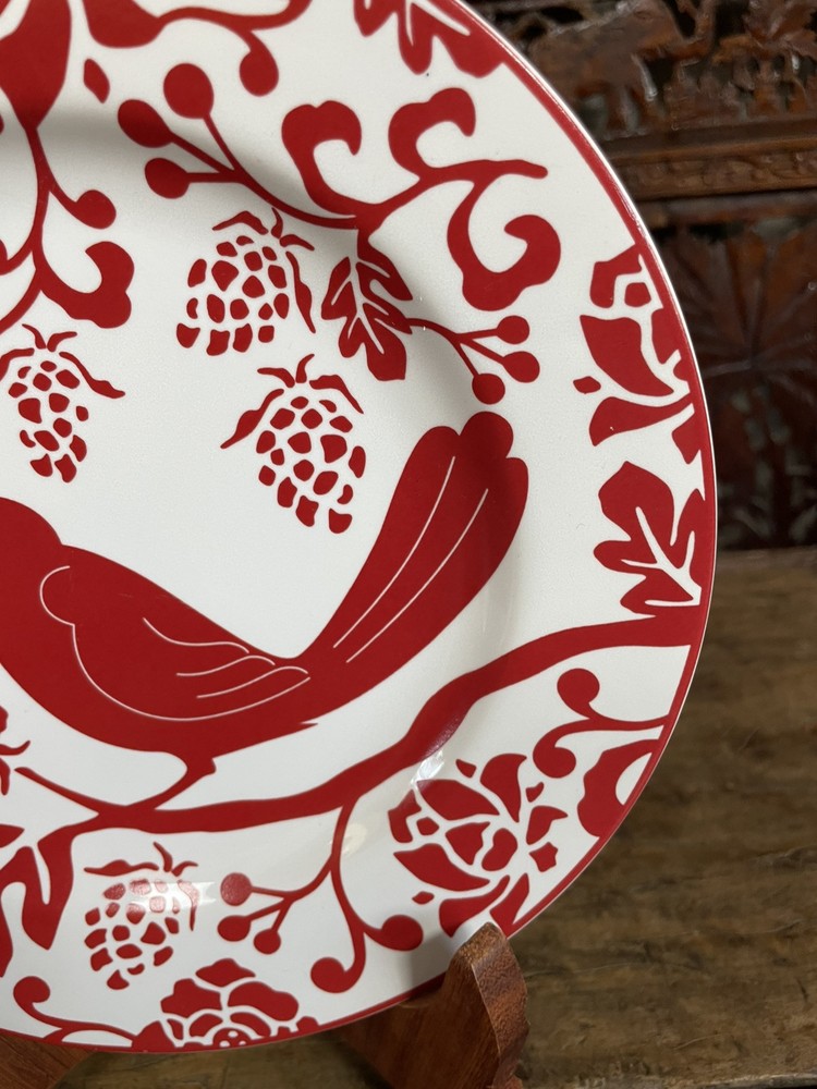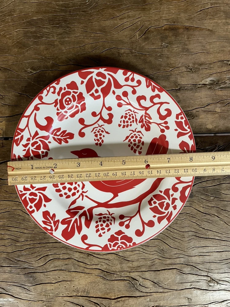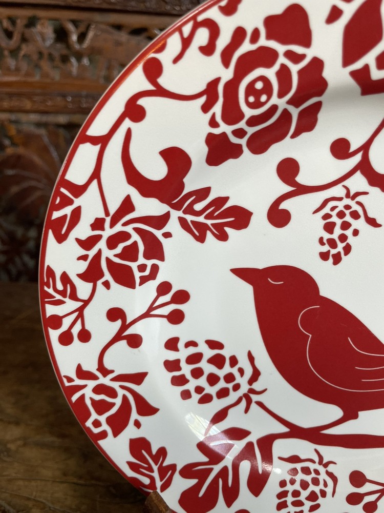 This Pier 1 Imports luncheon plate features a round shape with a red color and a contemporary design of a bird on a branch with flowers. Made of stoneware, it has a glossy finish and measures 8.25" in diameter. The plate is decorated with a printed backstamp and is suitable for all occasions. Made in Indonesia, this new plate is a stylish addition to your tableware collection.