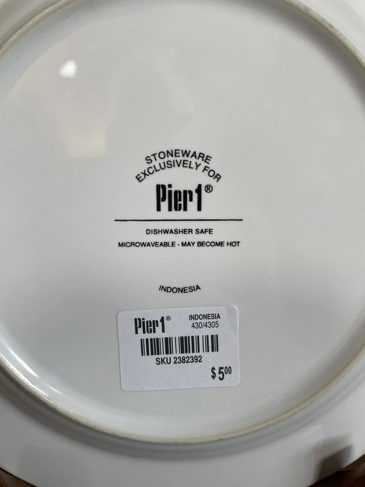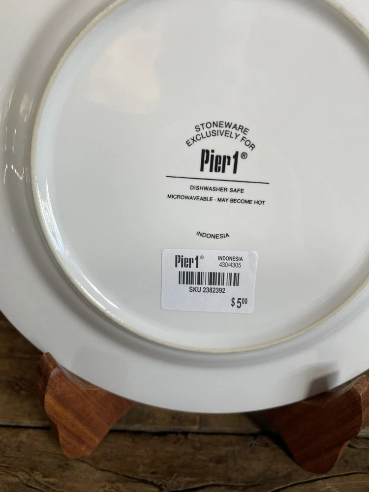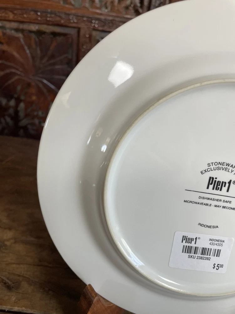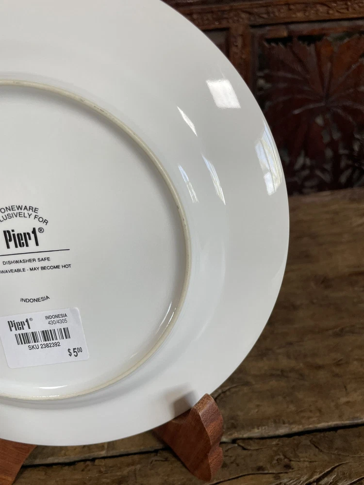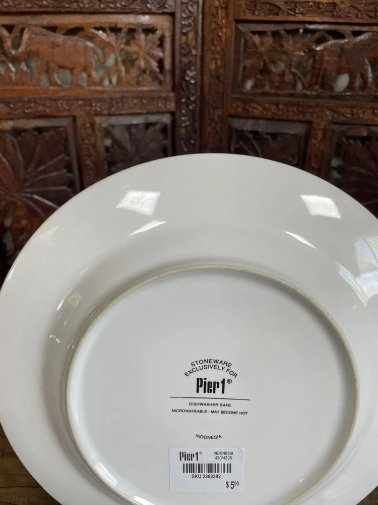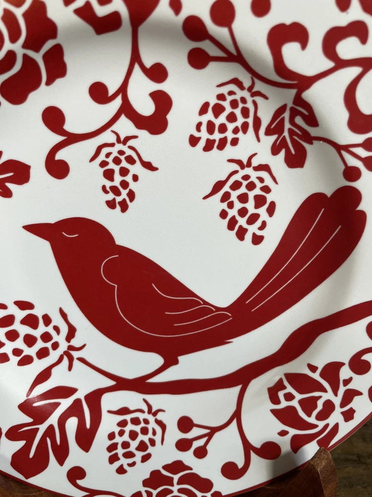 This Pier 1 Imports luncheon plate features a round shape with a red color and a contemporary design of a bird on a branch with flowers. Made of stoneware, it has a glossy finish and measures 8.25" in diameter. The plate is decorated with a printed backstamp and is suitable for all occasions. Made in Indonesia, this new plate is a stylish addition to your tableware collection.