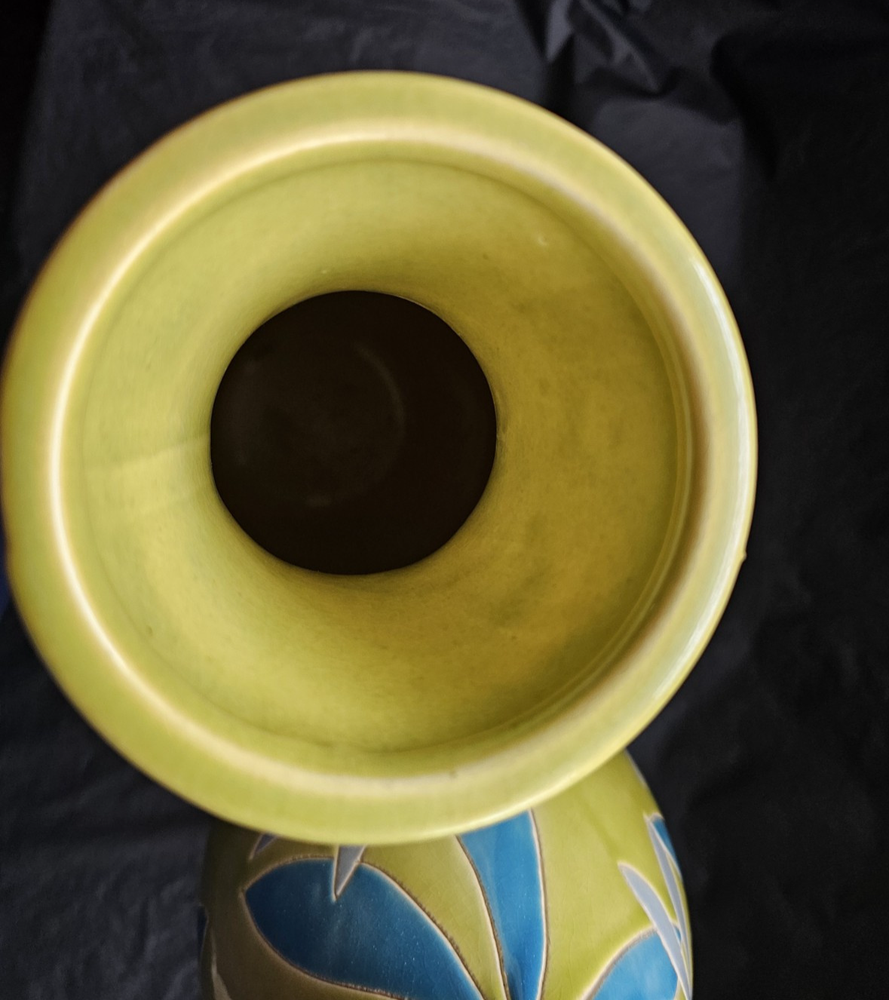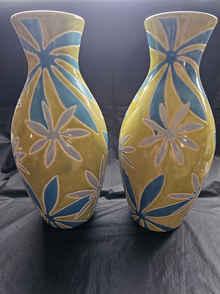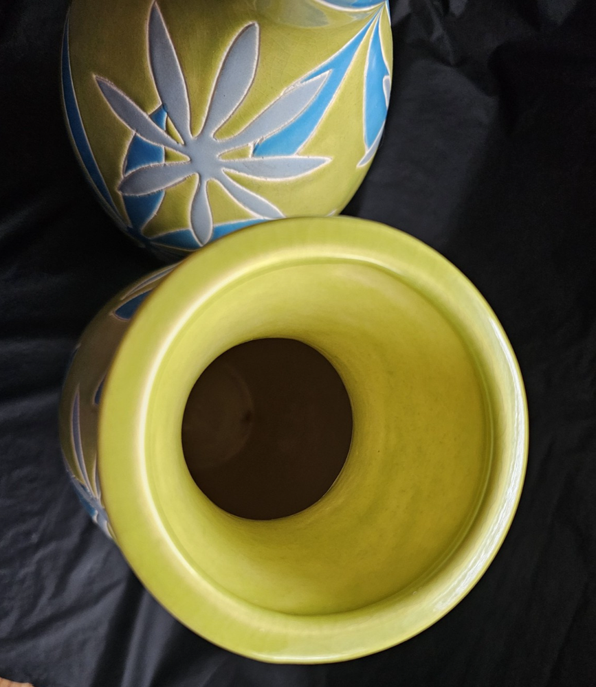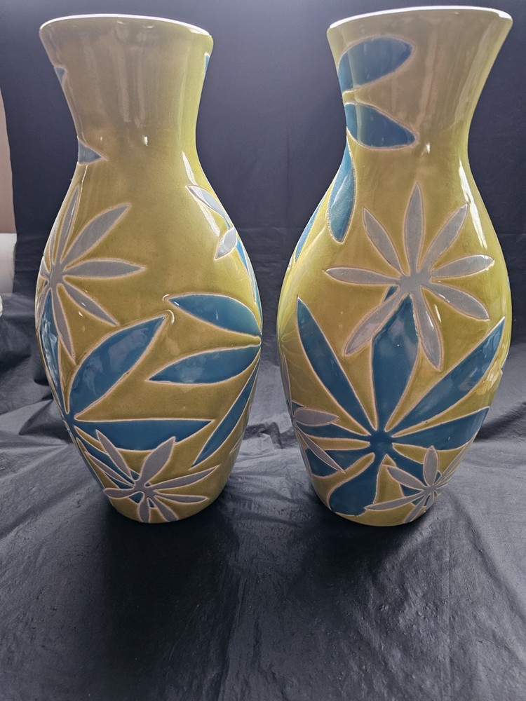 Pier 1 Imports Retro Vase Turquoise Lime Flowers Abstract Design 13 1/2" Retro style flower power design. The vase has a lime green background with large turquoise and powder blue/gray flowers. Both are in great clean condition with no chips, cracks or repairs. There are some natural blemishes, one vase has an uneven lip on one side. See photos Measures approx. 13 1/2"h Largest part of vase has a 20 1/2" circumference Vases are sold separately