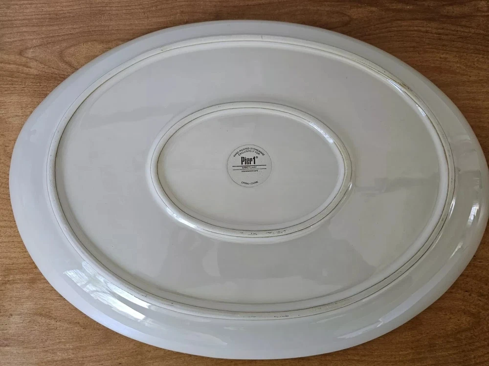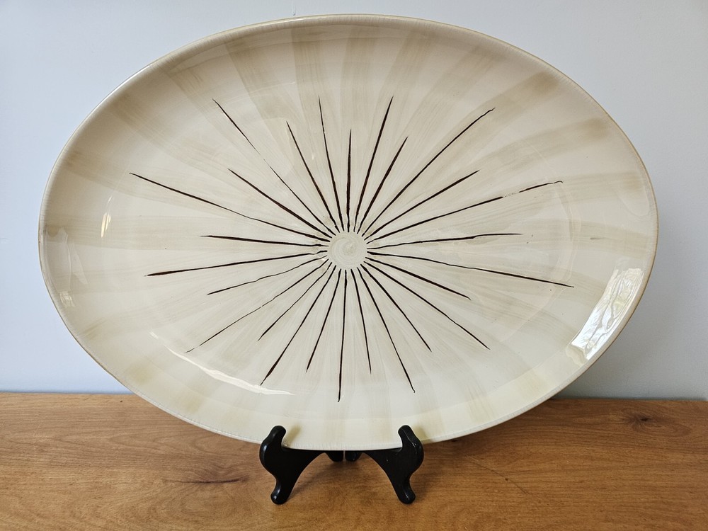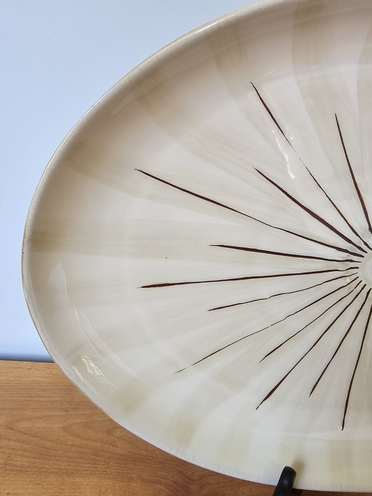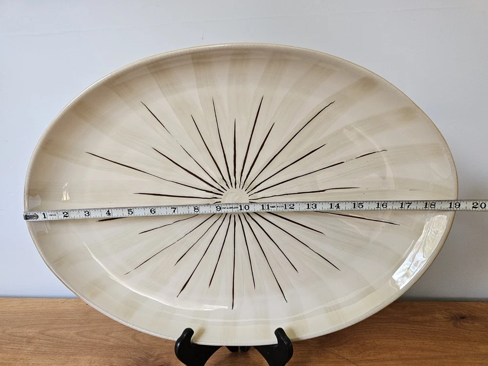 This Pier 1 Imports "SANCTUARY" Large Oval Serving Platter is a must-have for any mid-century modern enthusiast. With a stunning starburst pattern in multi-color, this platter is sure to impress. Made of high-quality ceramic, it is both stackable and decorative, perfect for any occasion. At 19 inches in diameter and 1.25 inches in height 13.5 width, this platter is the ideal size for serving your favorite dishes. Its glossy finish adds to its charm, while the printed backstamp confirms its originality. Don't miss out on this discontinued piece from the Wildflower product line. See pictures for detailed condition and measurements. One section of the starburst is missing. Platter is very heavy. Pre owned in great condition.
