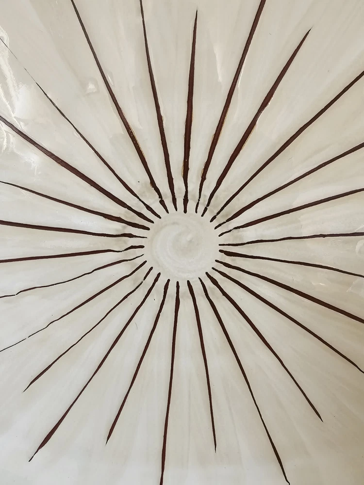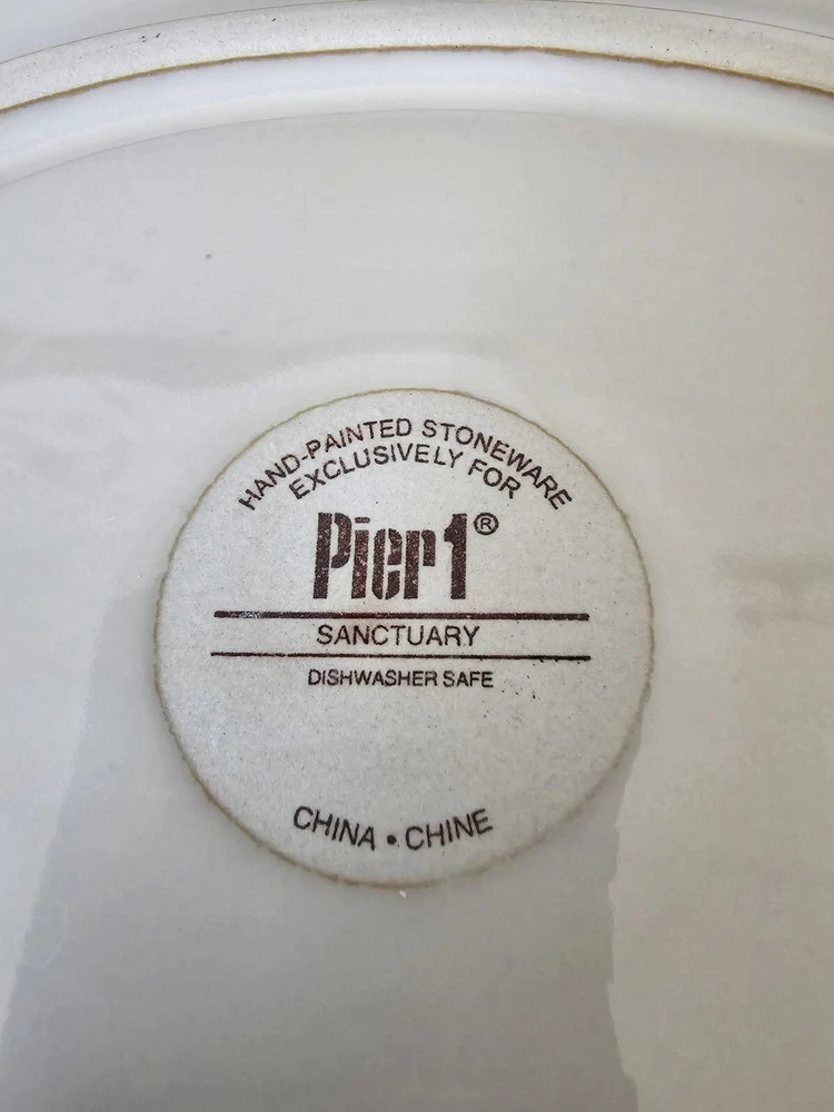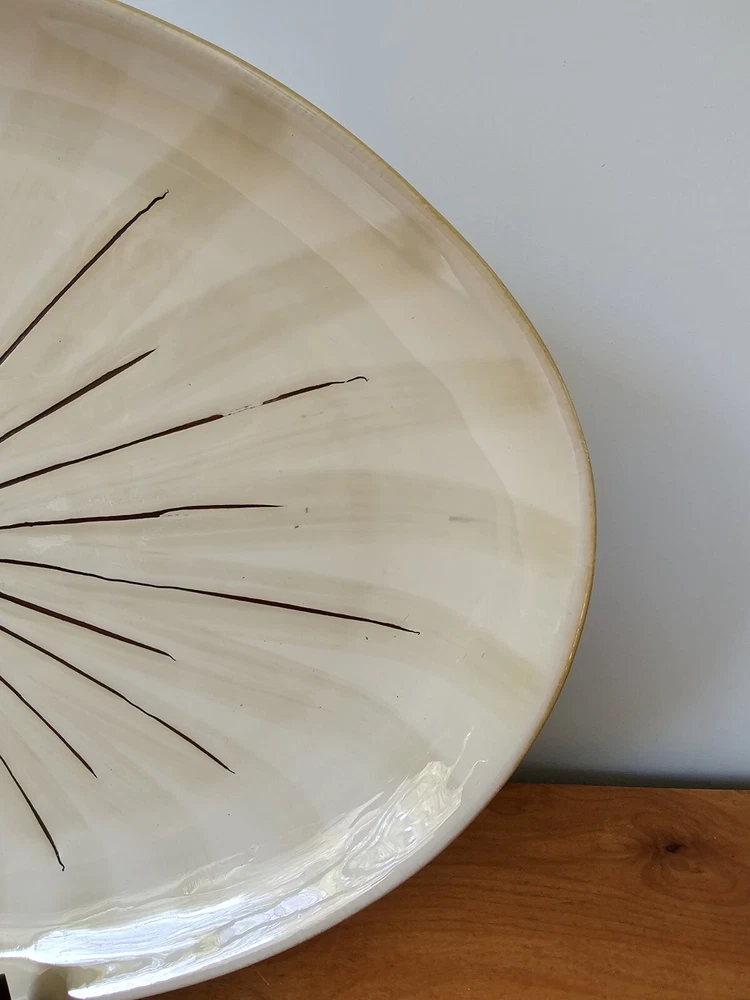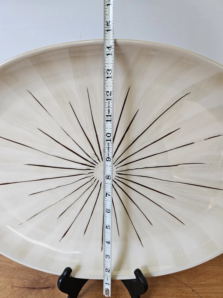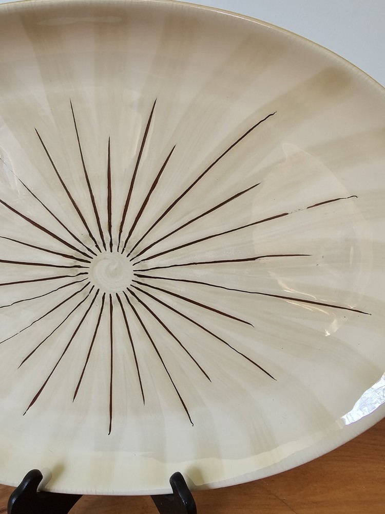 This Pier 1 Imports "SANCTUARY" Large Oval Serving Platter is a must-have for any mid-century modern enthusiast. With a stunning starburst pattern in multi-color, this platter is sure to impress. Made of high-quality ceramic, it is both stackable and decorative, perfect for any occasion. At 19 inches in diameter and 1.25 inches in height 13.5 width, this platter is the ideal size for serving your favorite dishes. Its glossy finish adds to its charm, while the printed backstamp confirms its originality. Don't miss out on this discontinued piece from the Wildflower product line. See pictures for detailed condition and measurements. One section of the starburst is missing. Platter is very heavy. Pre owned in great condition.