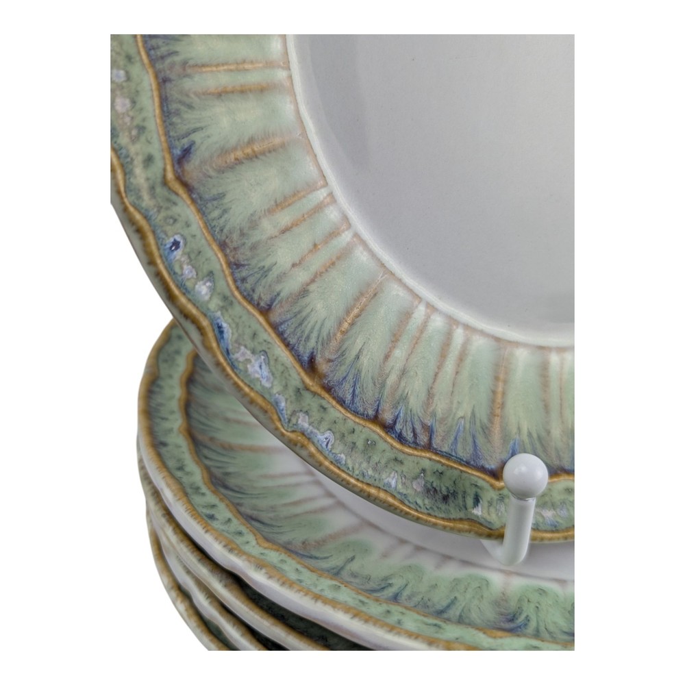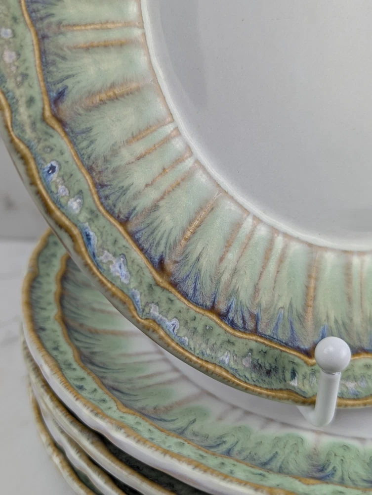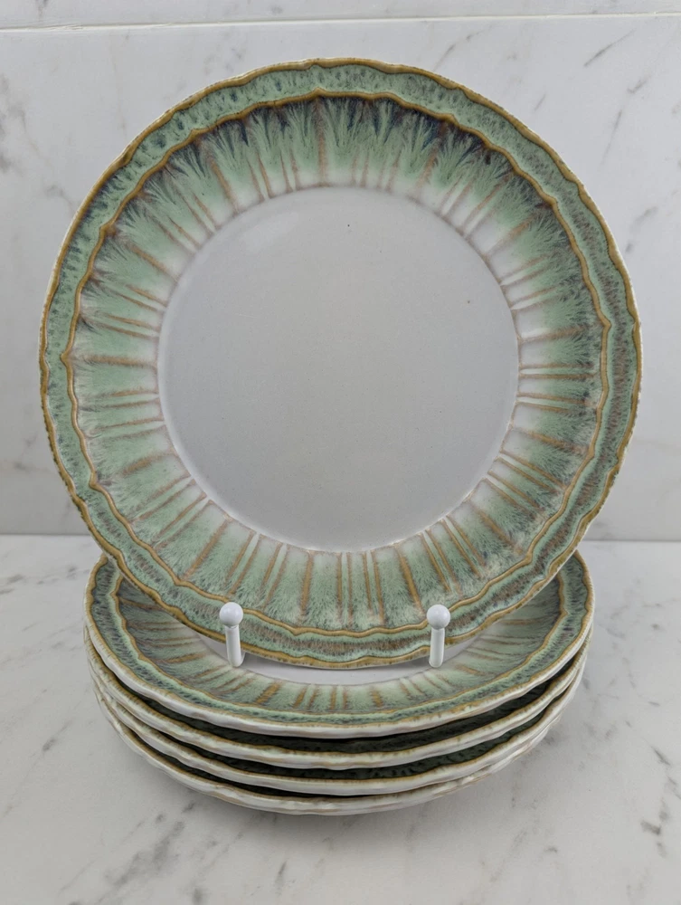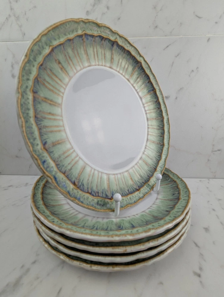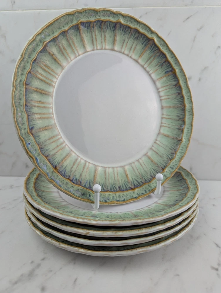 Set of 5 Pier 1 Imports SEASIDE salad plates featuring a contemporary scalloped edge in green with a cream-colored center . Perfect for all occasions, these round salad plates are ideal for serving salads, desserts or lunch in a stylish and elegant manner. Made in China, these plates are a great addition to any adult's kitchen or dining room, adding a touch of sophistication to the table setting. The plates are in great used condition with light utensil marks visible. We use ground shipping to maximize the value of your purchase. Rest assured that your items will still be packed with care. Please visit our eBay store for more Pier 1 Imports items and other unique finds including collectibles, vintage cookware, MCM tabletop, retro sporting gear, and cool barware! https://www.ebay.com/str/irvandolive Thank you, Irv & Olive