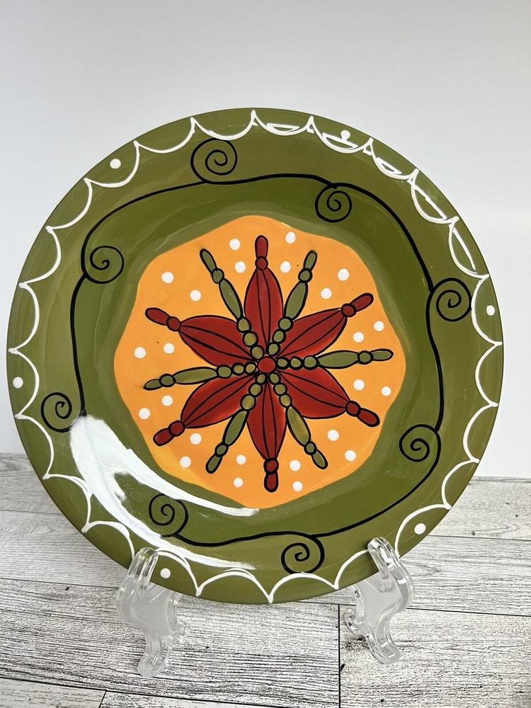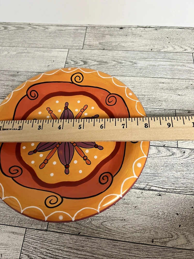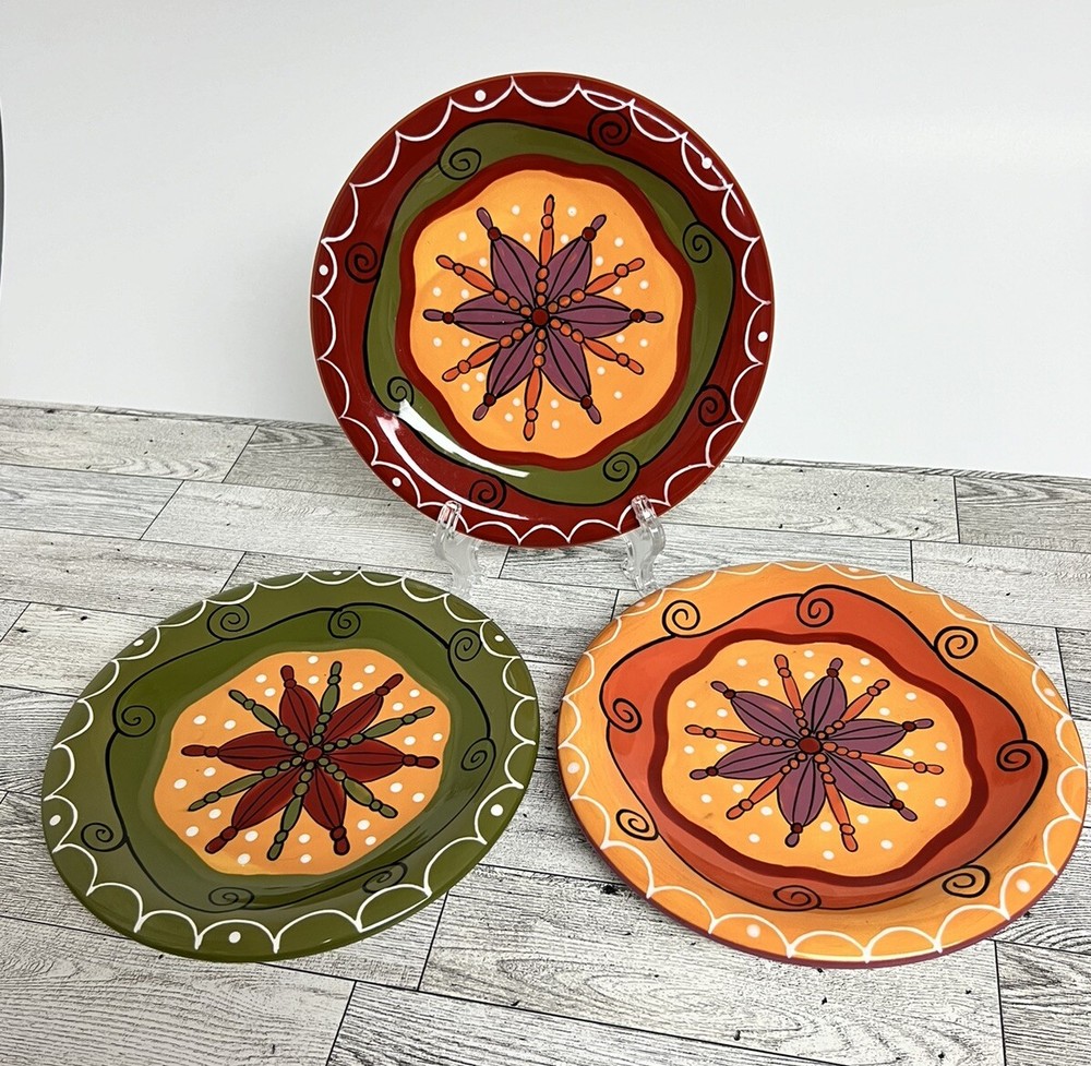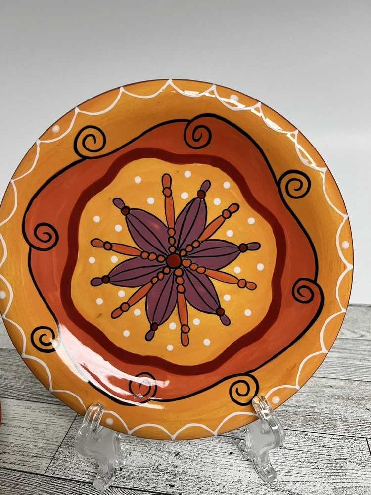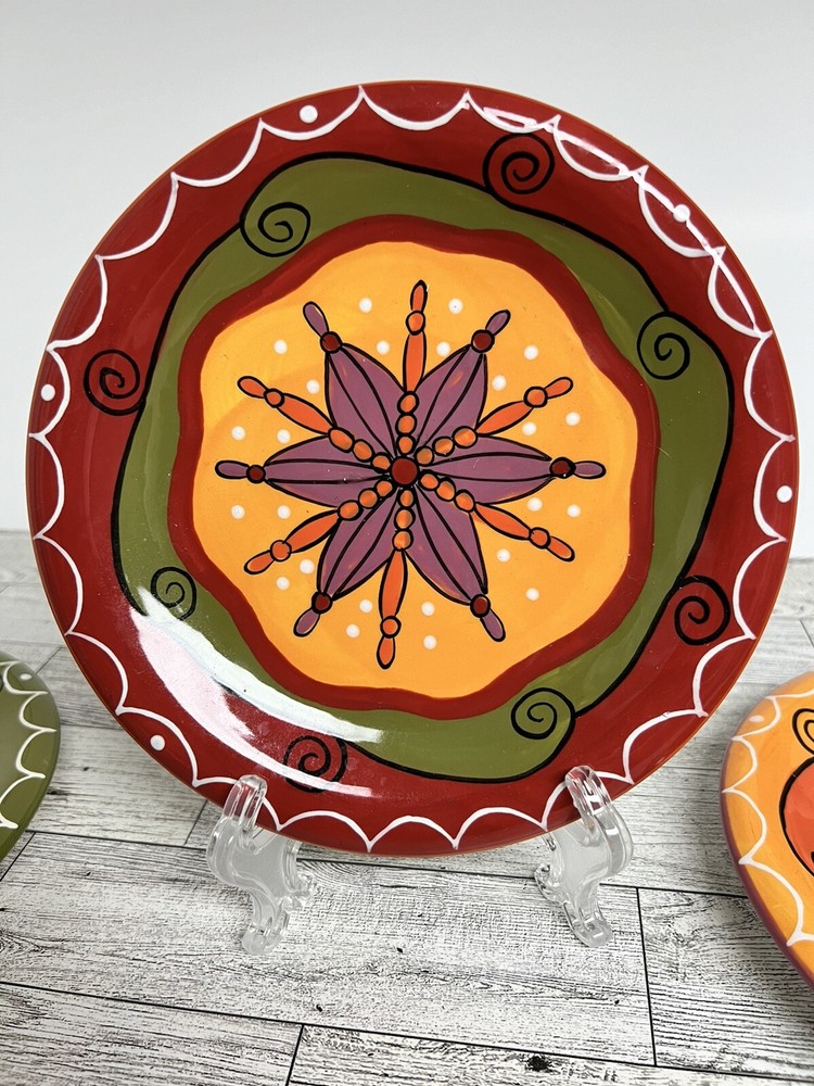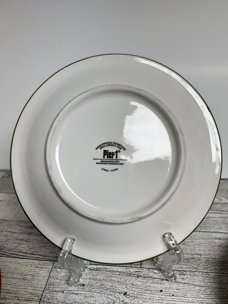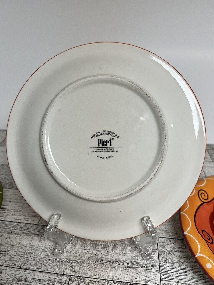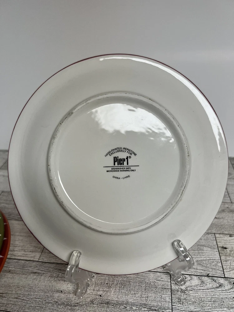 Add a touch of eclectic charm to your dining table with this set of three Pier 1 Imports Salad Dessert Plates. These round plates measure 8 inches in diameter and are hand-painted with a beautiful star flower pattern in a glossy finish. The plates are made of ceramic and are dishwasher safe for easy cleaning. Perfect for all occasions, these contemporary original plates are a must-have addition to your collection. They are not antique or vintage, but they are original and licensed by Pier 1. The plates come from China and are printed with a backstamp. The set includes only 3 dessert plates and is ideal for serving salads or other dishes.