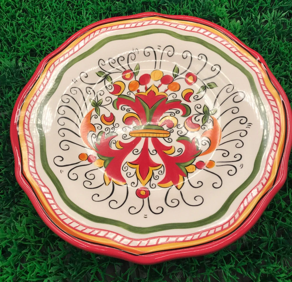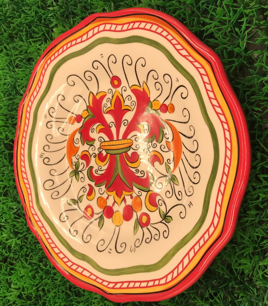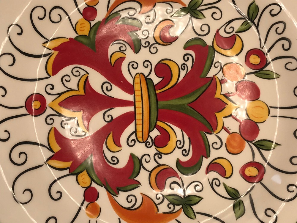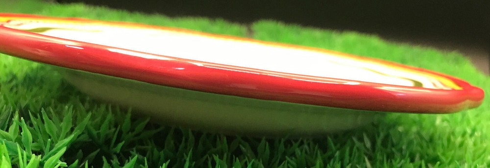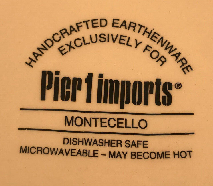 Pier 1 Imports Salad Plate, Montecello Design, Red,Yellow,Green Colors. Wavy edging,Excellent preowned condition, no chips or cracks. Weighs 1 pound,2 ounces Approx. 8 1/2 inches wide, 1 1/8 tall. Very nice plate. Will be well packaged