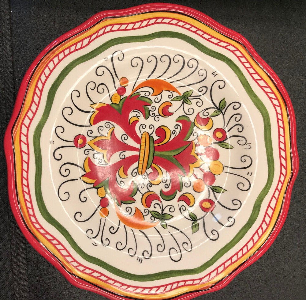 Pier 1 Imports Salad Plate, Montecello Design, Red,Yellow,Green Colors. Wavy edging,Excellent preowned condition, no chips or cracks. Weighs 1 pound,2 ounces Approx. 8 1/2 inches wide, 1 1/8 tall. Ver...