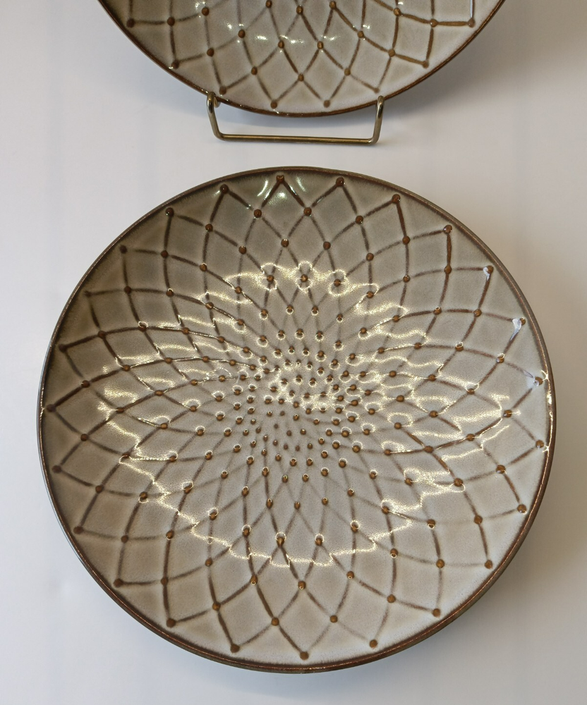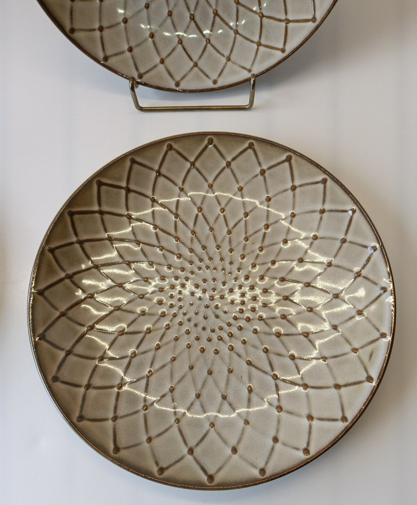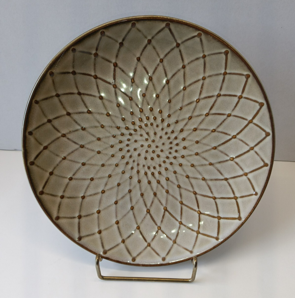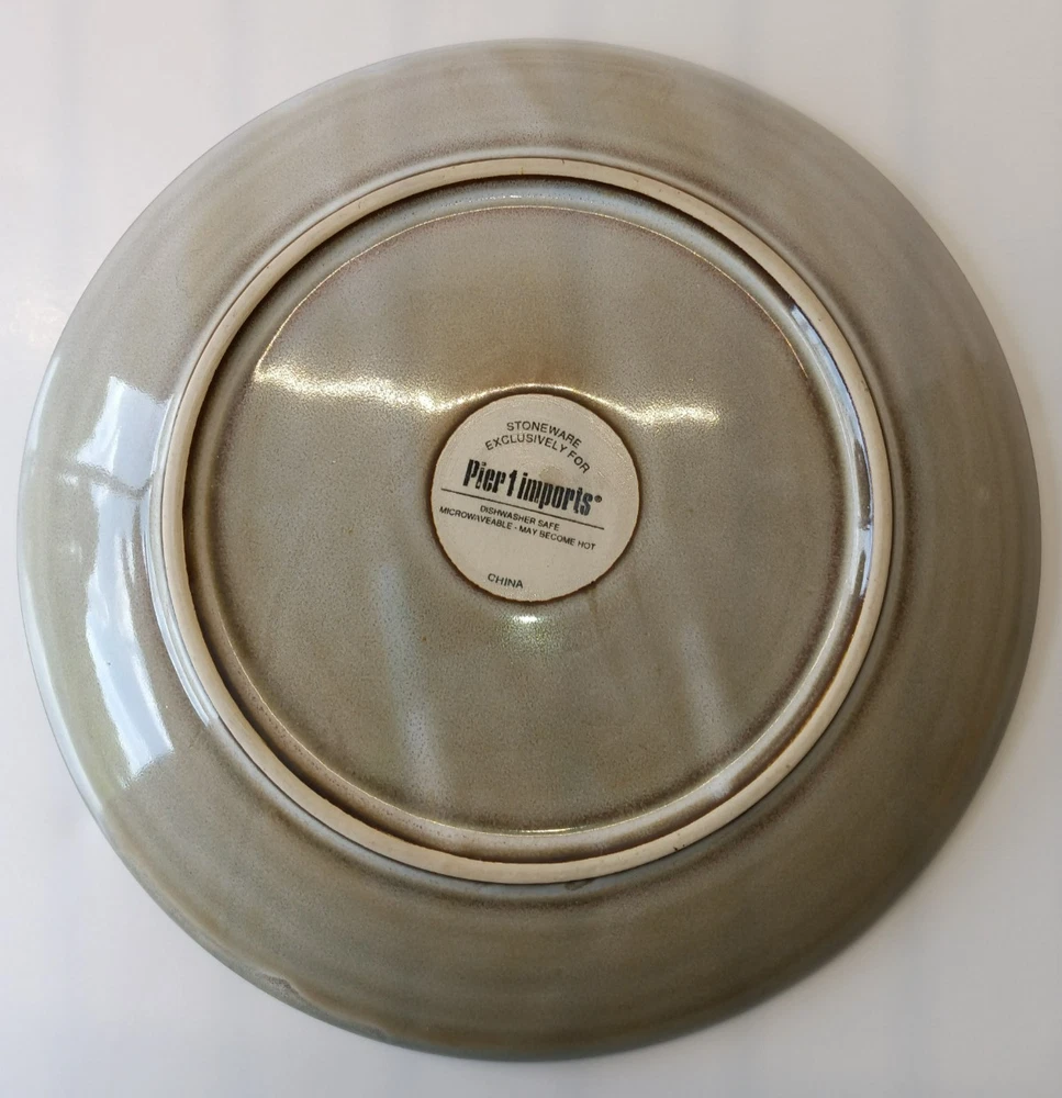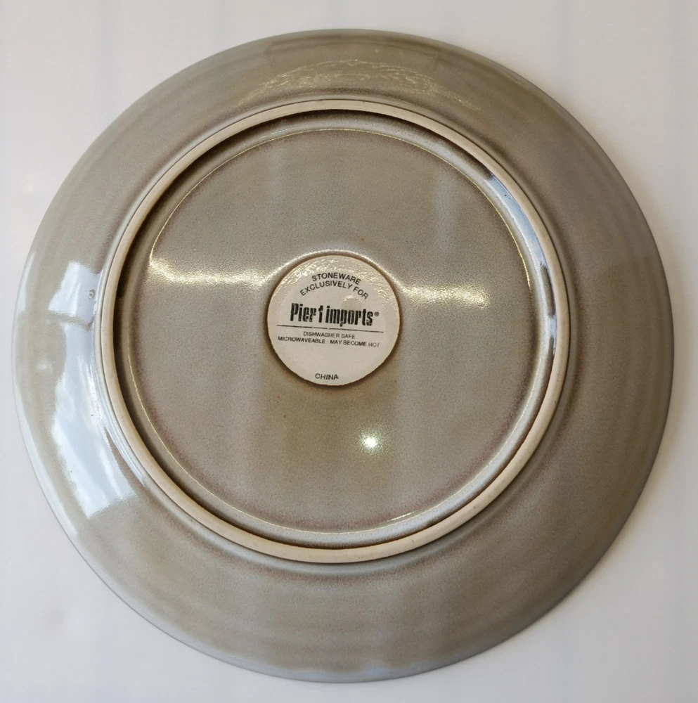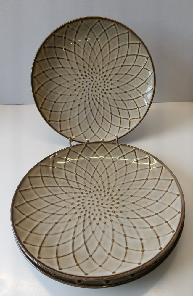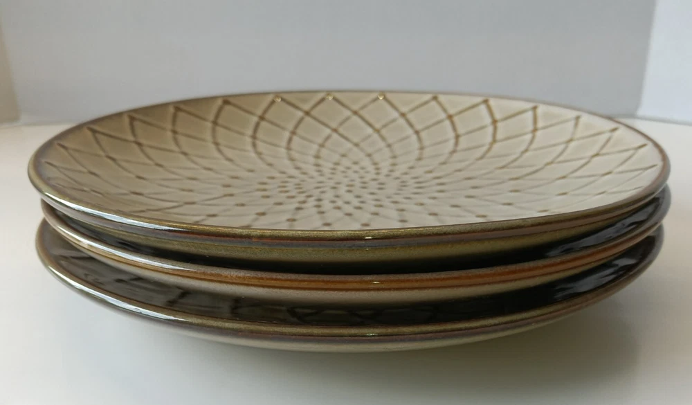 Set of three Pier 1 Imports salad plates, each featuring a contemporary brown textural floral pattern that effortlessly complements any table setting. Crafted from durable stoneware, these round plates measure 8.5 inches in diameter and stand 1 inch tall, perfect for everyday use or special occasions. Designed with convenience in mind, these plates are both dishwasher and microwave safe, ensuring easy care and versatile use. Their glossy finish and stackable design make them a practical addition to your kitchen collection. Whether you're hosting a dinner party or enjoying a quiet meal at home, these salad plates are sure to impress. In Great Condition. No Chips, No Cracks, No Stains.