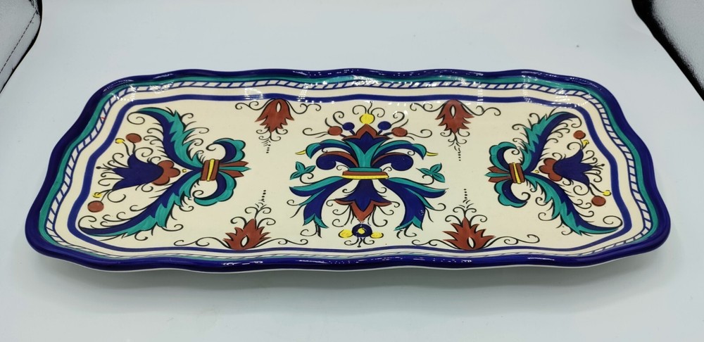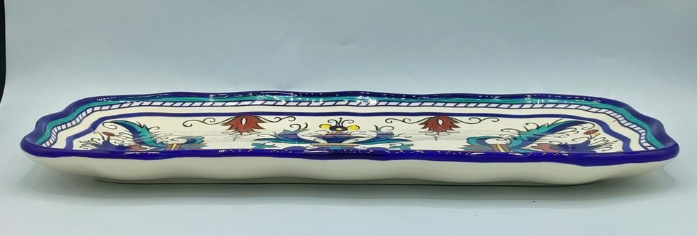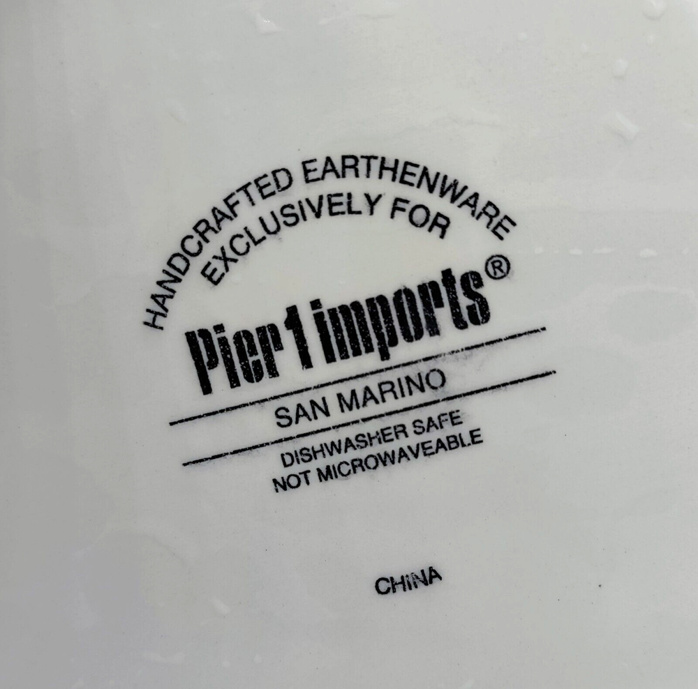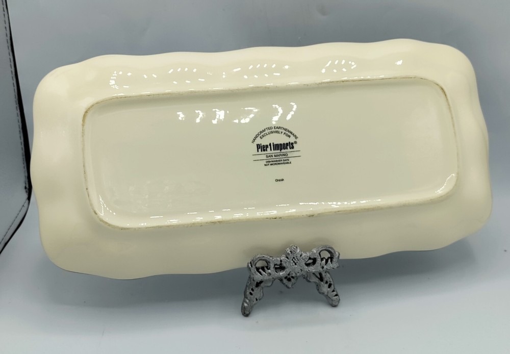 Pier 1 Imports San Marino Tray Ceramic Italian Design 14.5" x 7" retired pattern beautiful rectangle tray by Pier 1 Imports in the San Marino pattern. Measures 14-1/2" x 7" and stands 1" tall Overall great condition....there is a manufacturers flaw where some of the pattern didn't transfer onto the porcelain, please view last photo. You cannot feet this area..this is done in the processing of the transferware pattern. if you have any questions, please message me. ***I see replacements dot com has this tray for $80.00*** Thanks for viewing and have a great day!